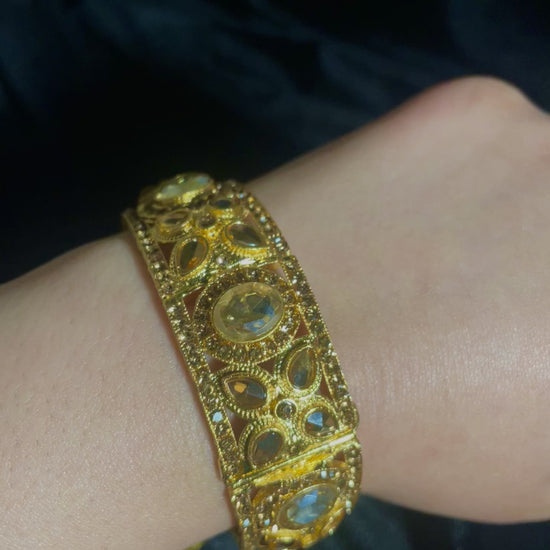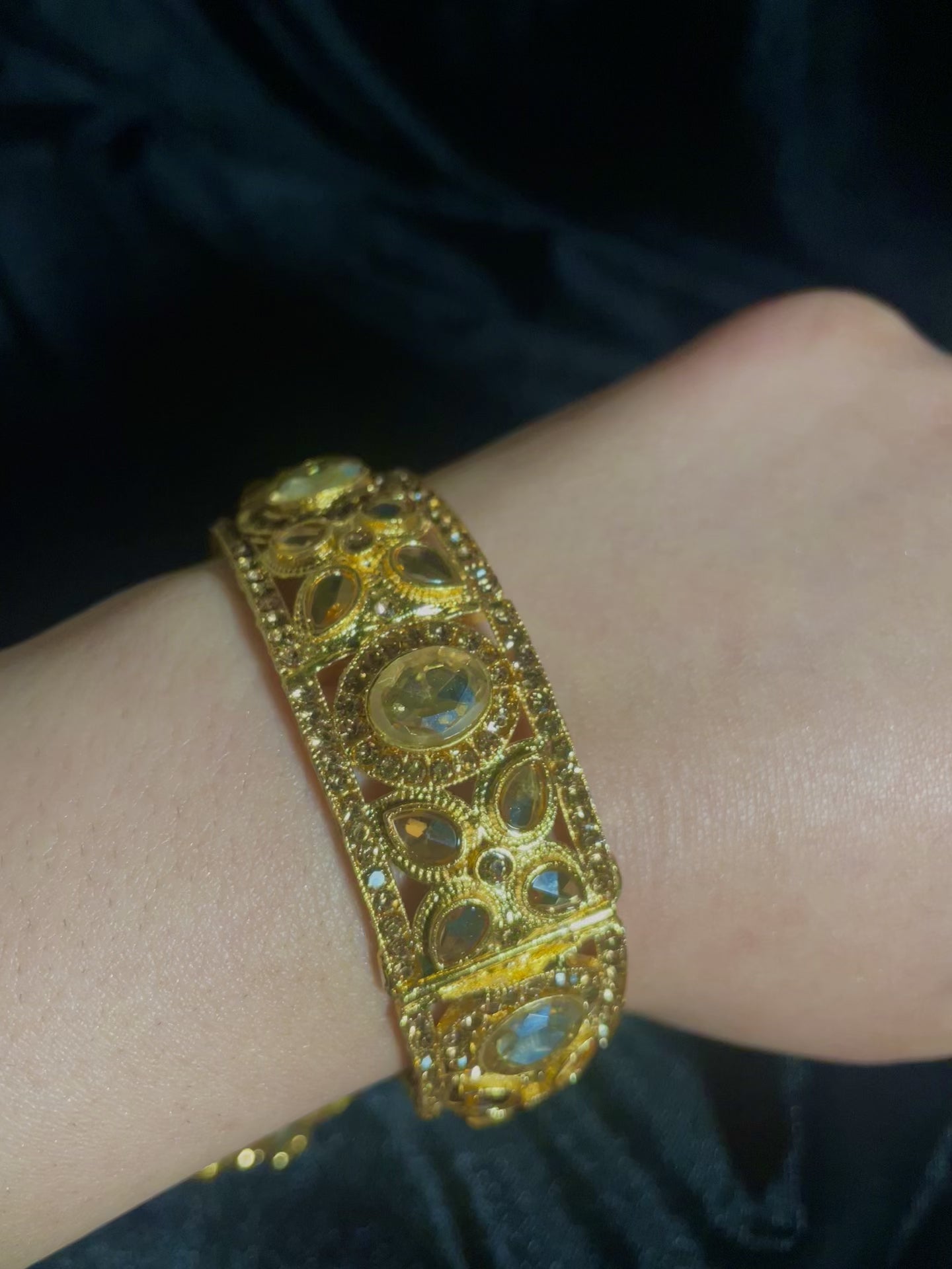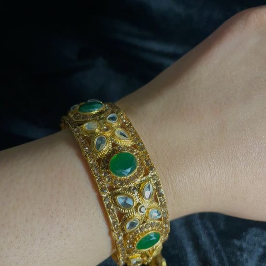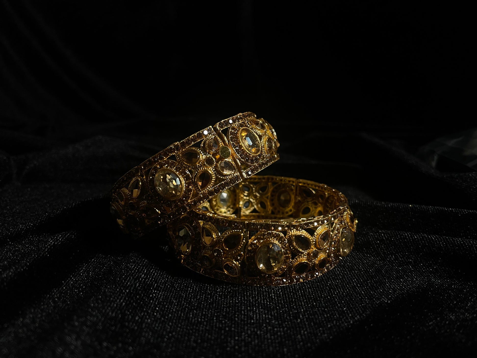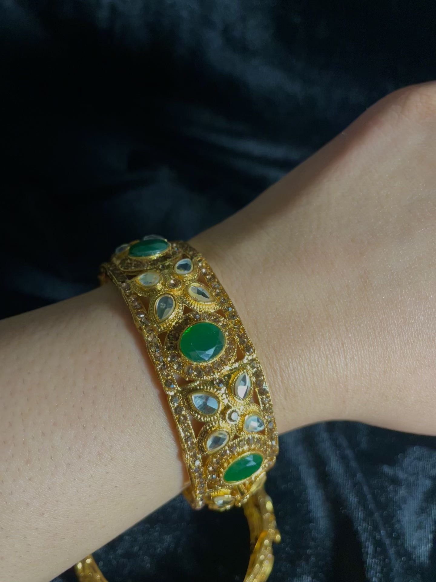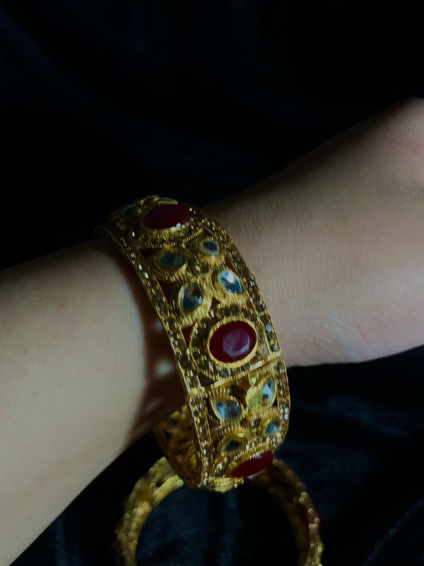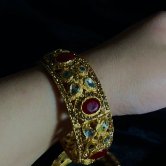 Aroosh Bangles embody a traditional design with their size and refined detailing. The hinge mechanism ensures effortless wear while maintaining the aesthetic integrity of these elegant pieces. Available in three distinguished colorways—champagne for understated sophistication, red for bold statement appeal, and green for distinctive elegance.