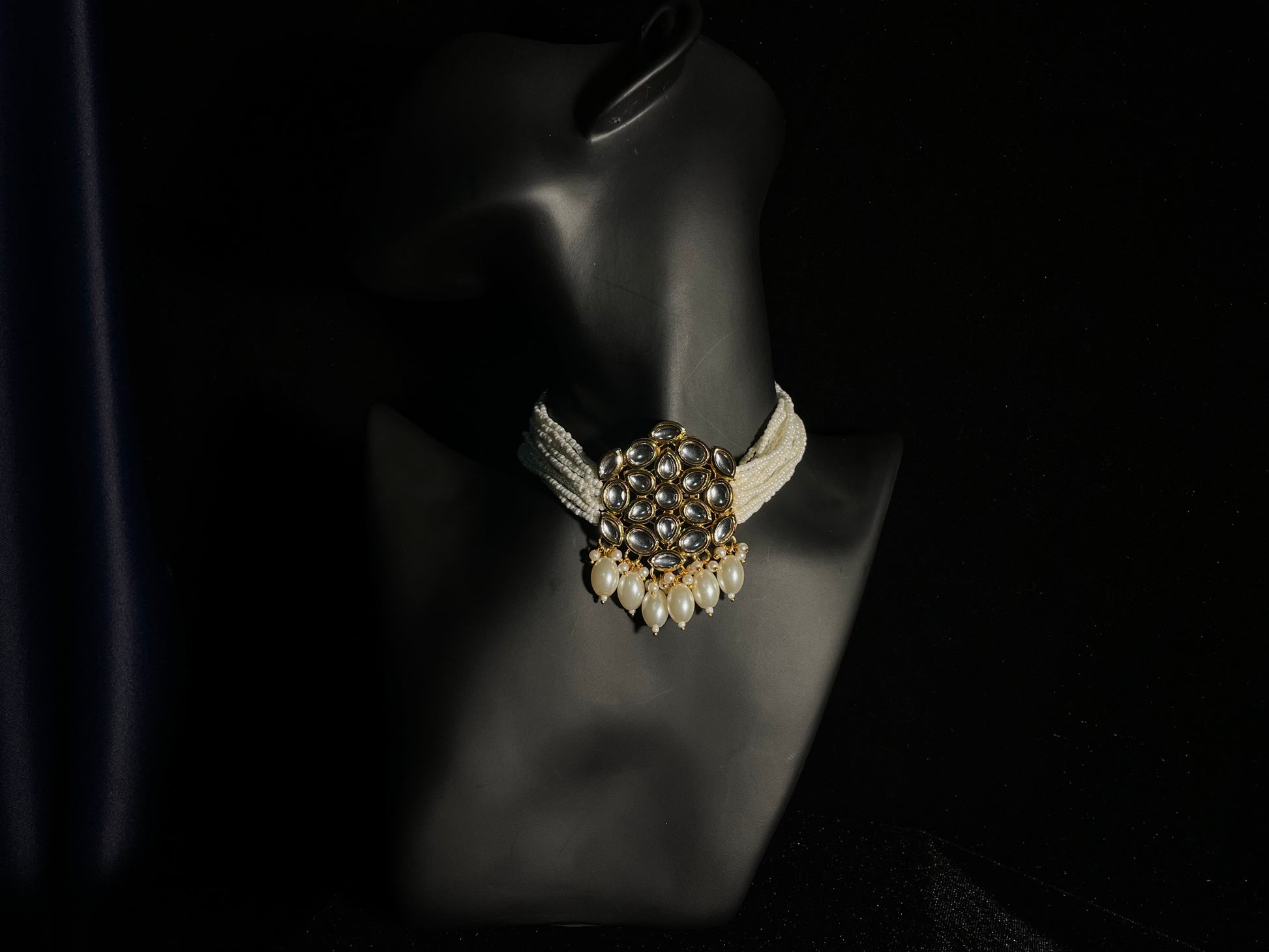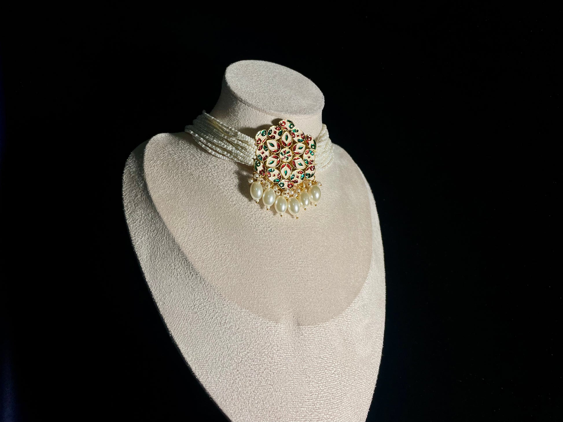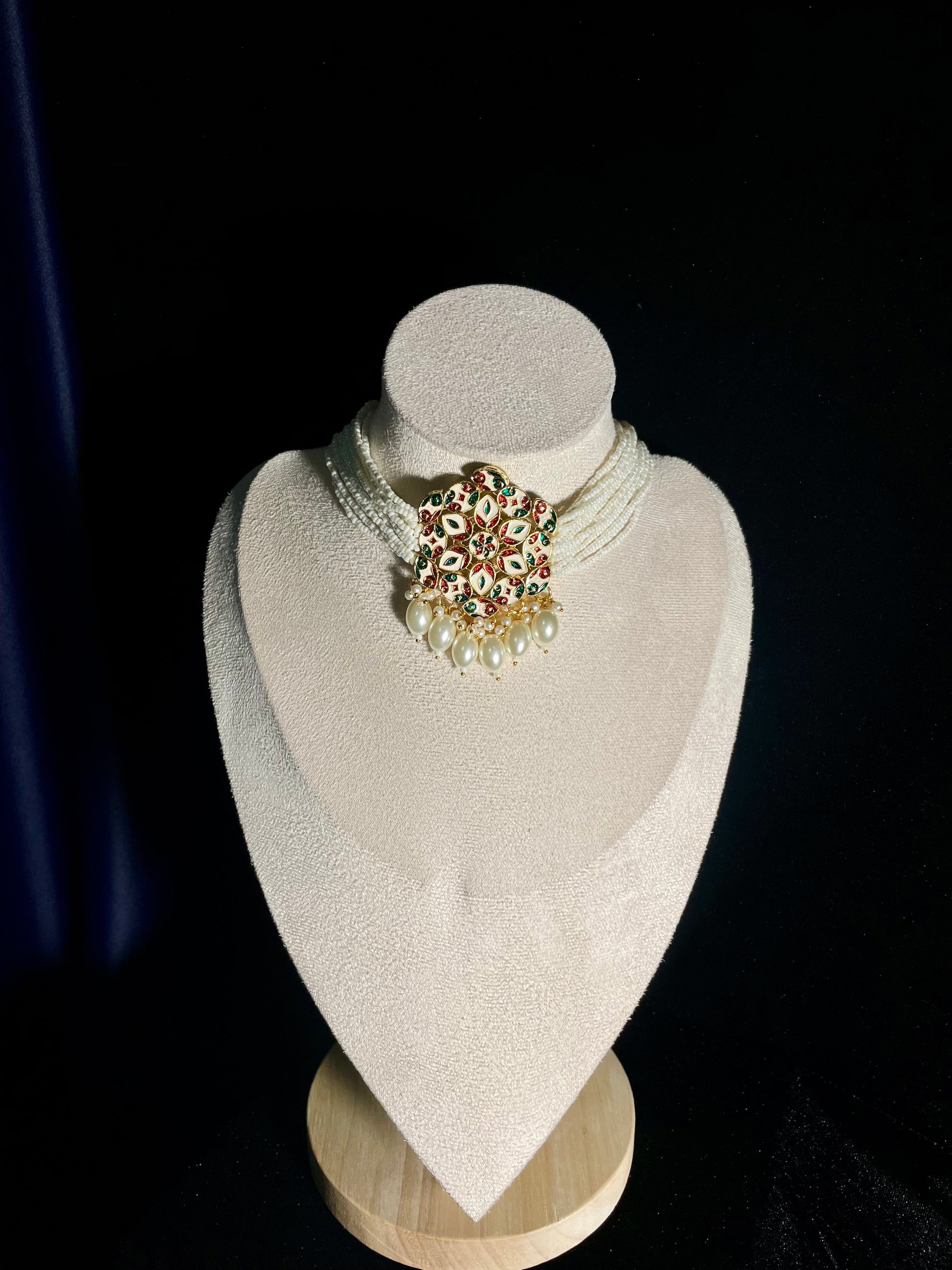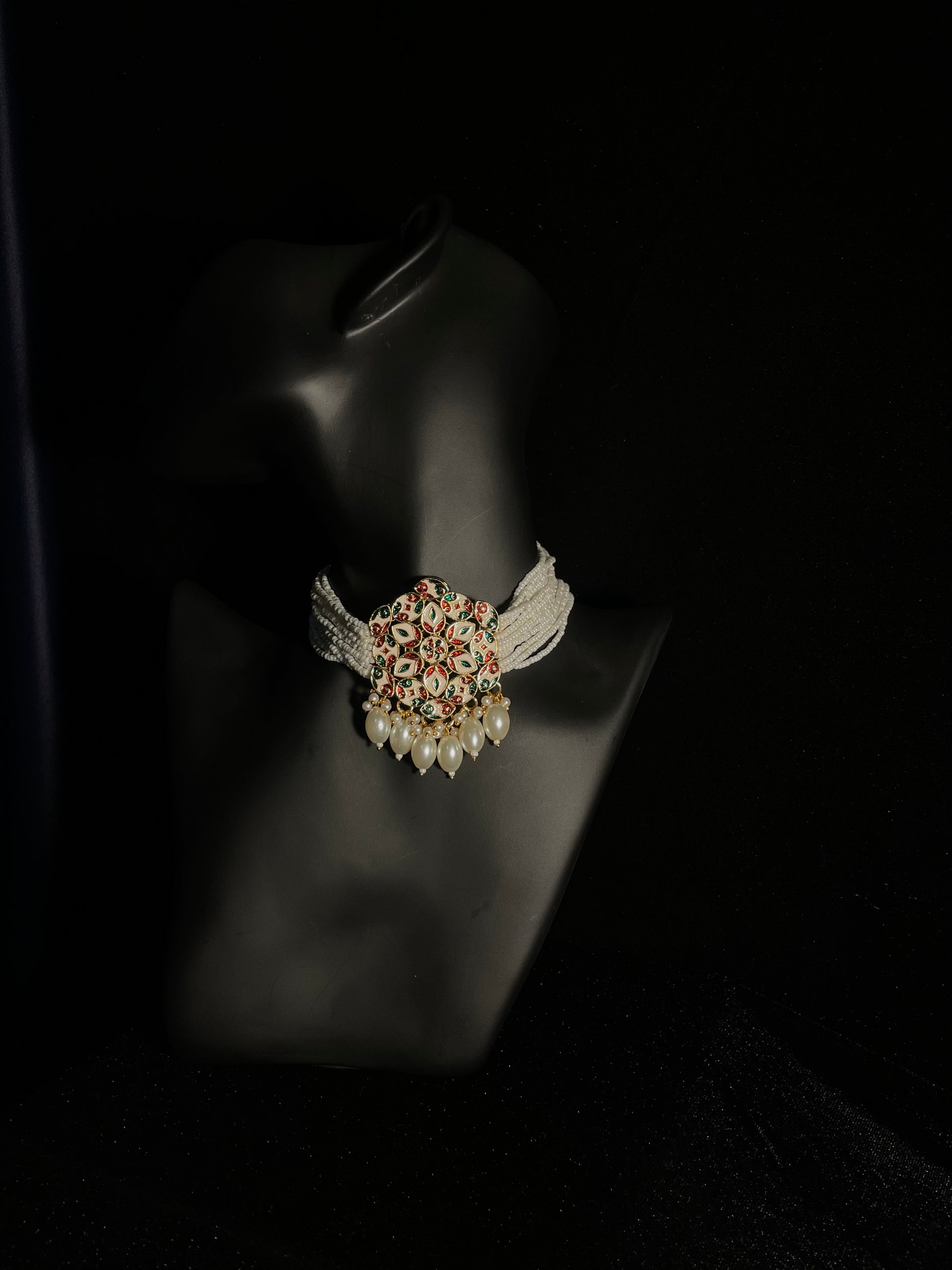 Elevate your elegance with our Asrar-e-shahi choker, featuring exquisite glass inlays arranged in mesmerizing circular patterns. This royal-inspired set includes matching dual-sided earrings, allowing you to showcase different looks for any occasion. Wear these "Secrets of Royalty" pieces to command attention and channel the mystique of ancient nobility wherever you go.