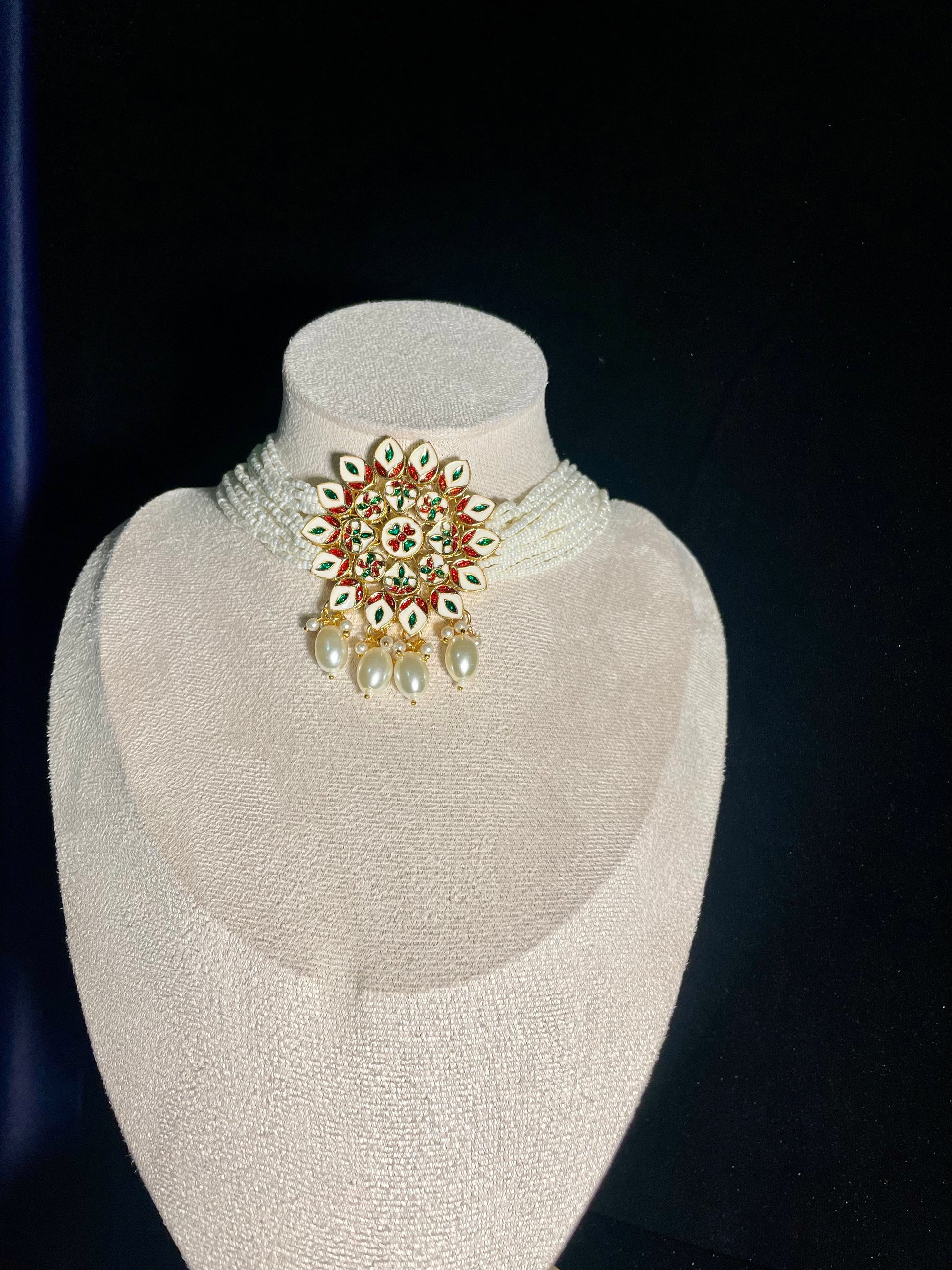 Embrace the essence of royalty with our Asrar-e-Shahi Choker, a masterpiece fit for nobility. Meticulously crafted with luminous glass inlays in a mesmerizing circular pattern, this dual-sided choker exudes regal elegance. Transform any ensemble into a statement of power and sophistication. Wear this luxurious piece and command the attention reserved for those born to rule.