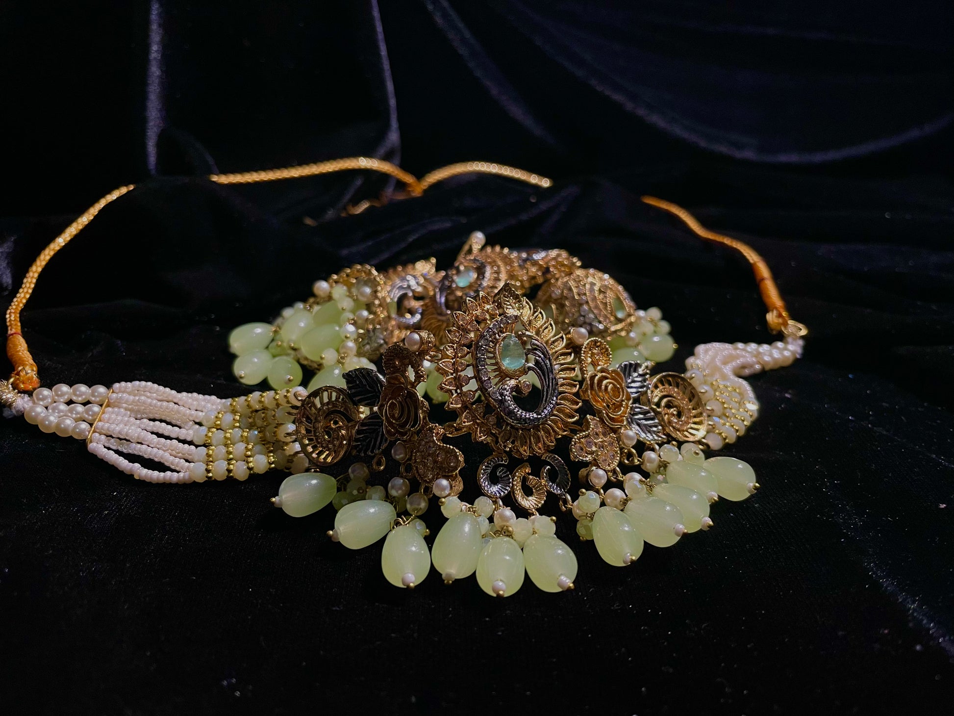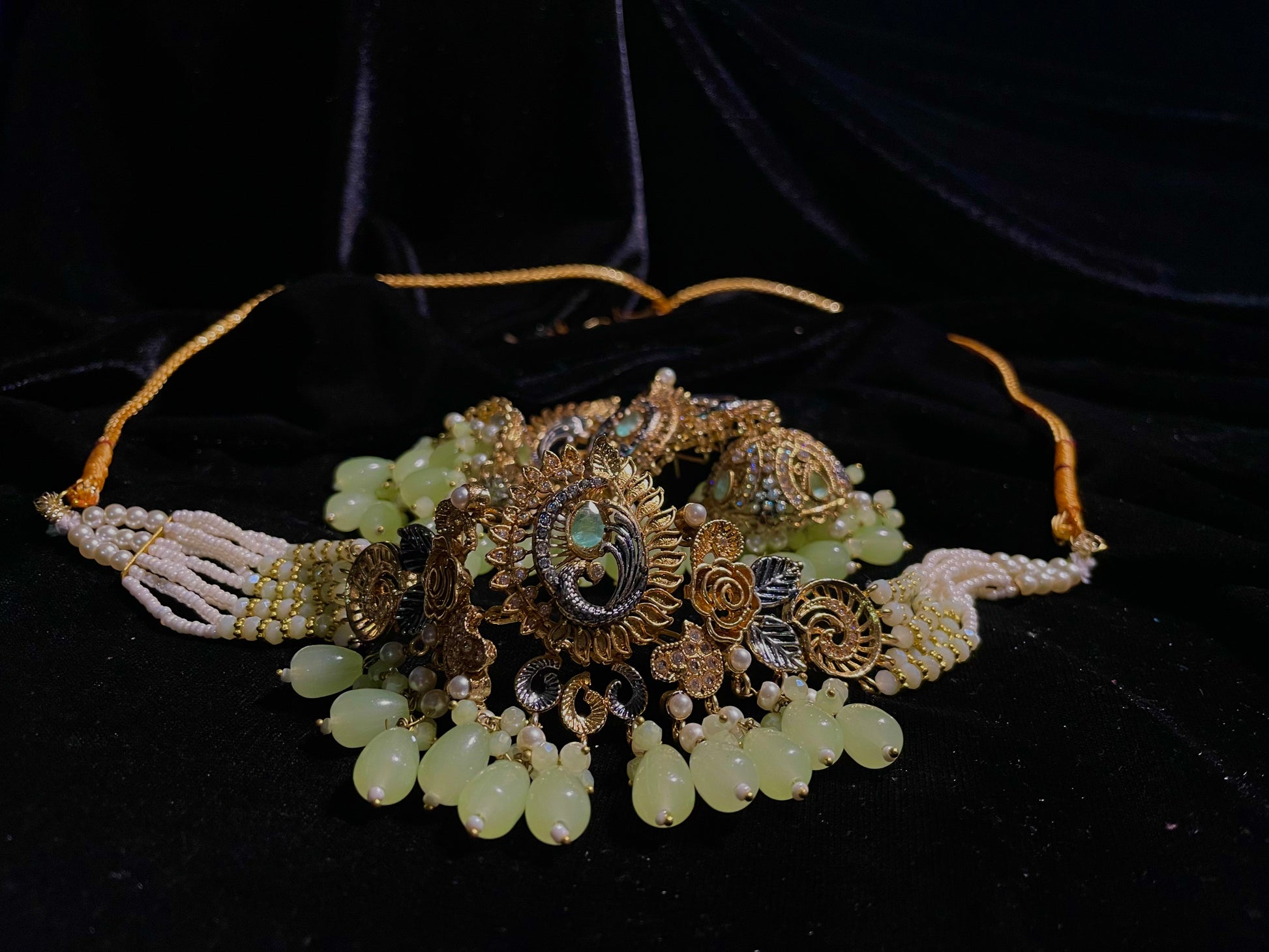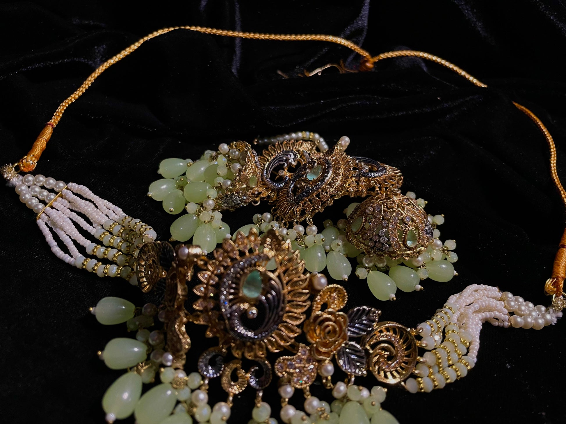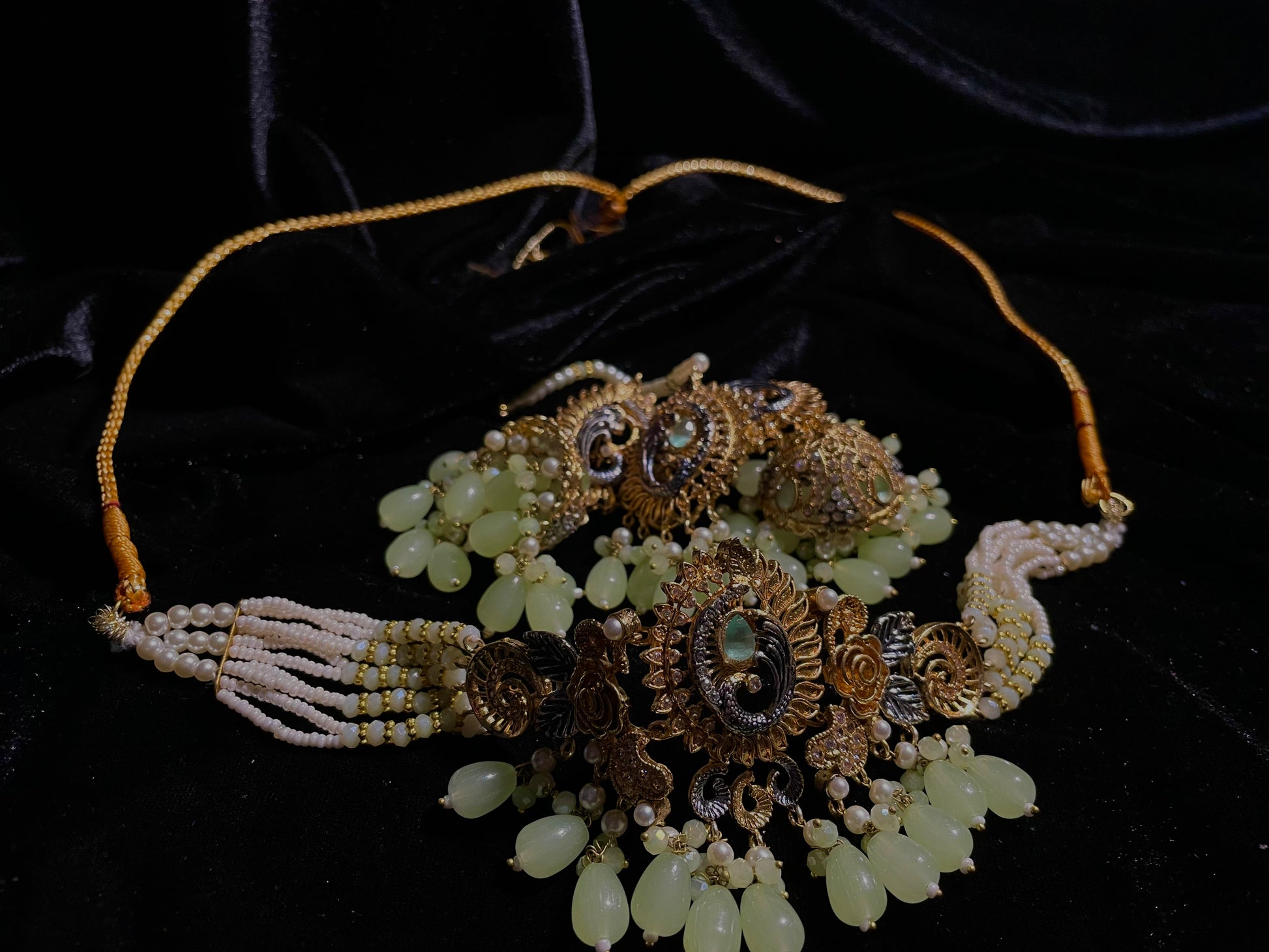 Transform into royalty with the Baadshahi Baag set – a stunning choker showcasing light green beads in an exquisite design that will captivate everyone's attention. Why settle for ordinary when you can adorn yourself with this complete set featuring perfectly matched earrings and tikka? This elegant trio promises to elevate any outfit, making it an essential investment for those who appreciate timeless beauty with a touch of nature-inspired elegance.