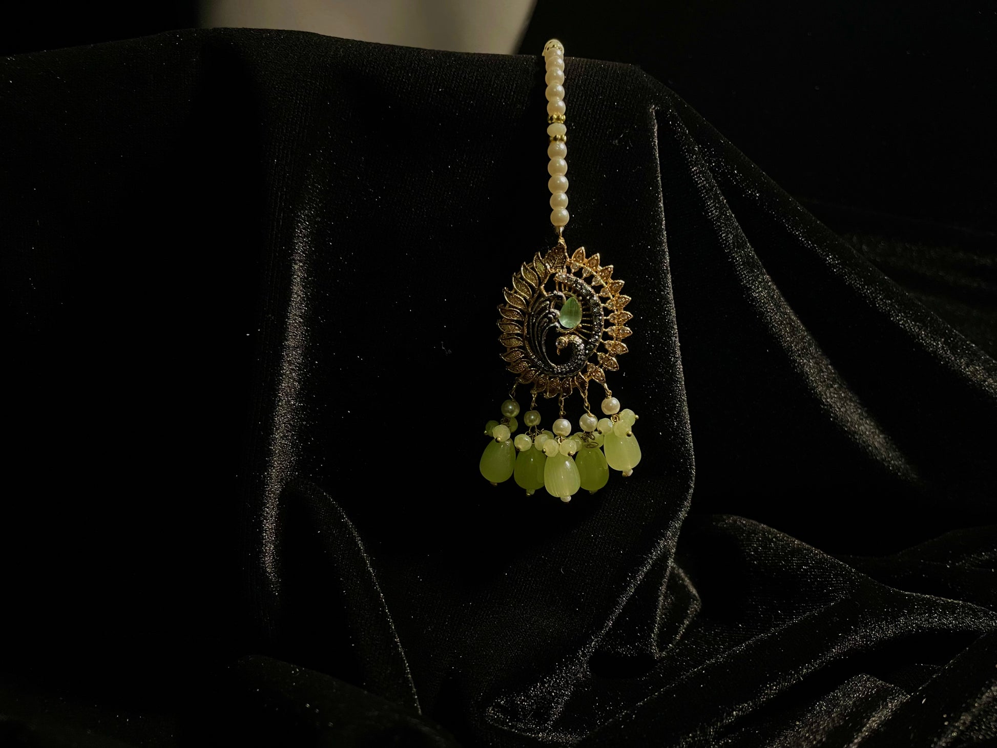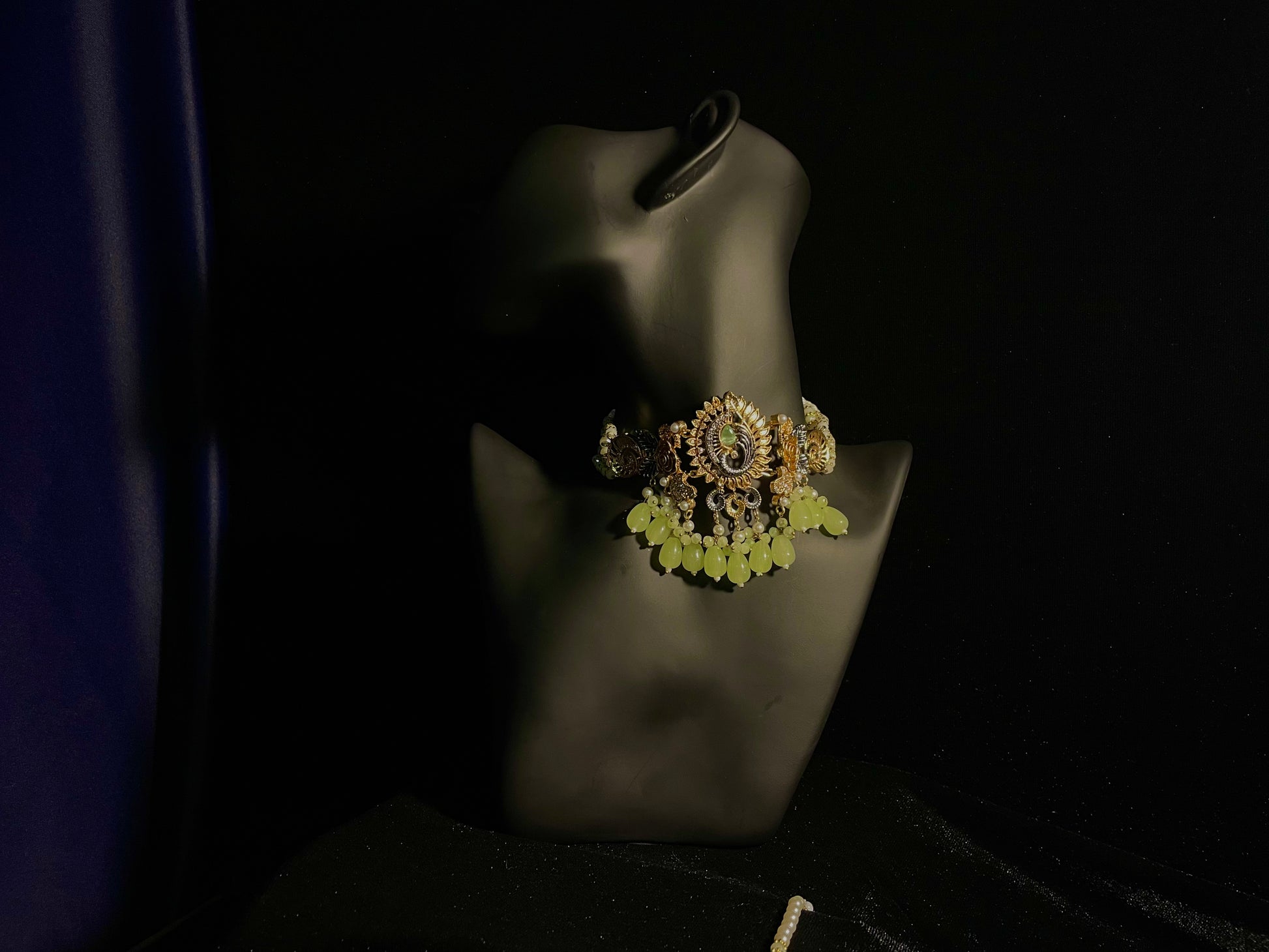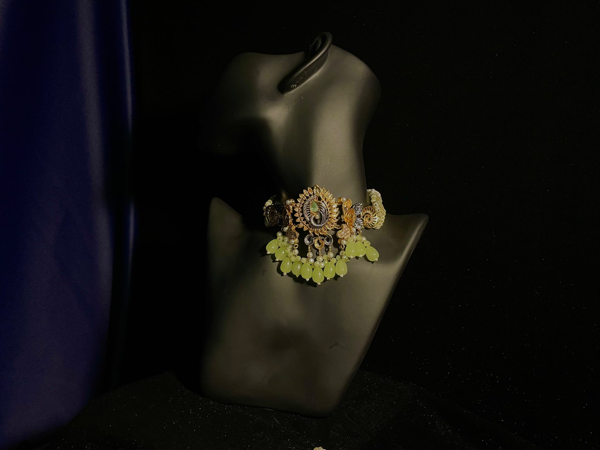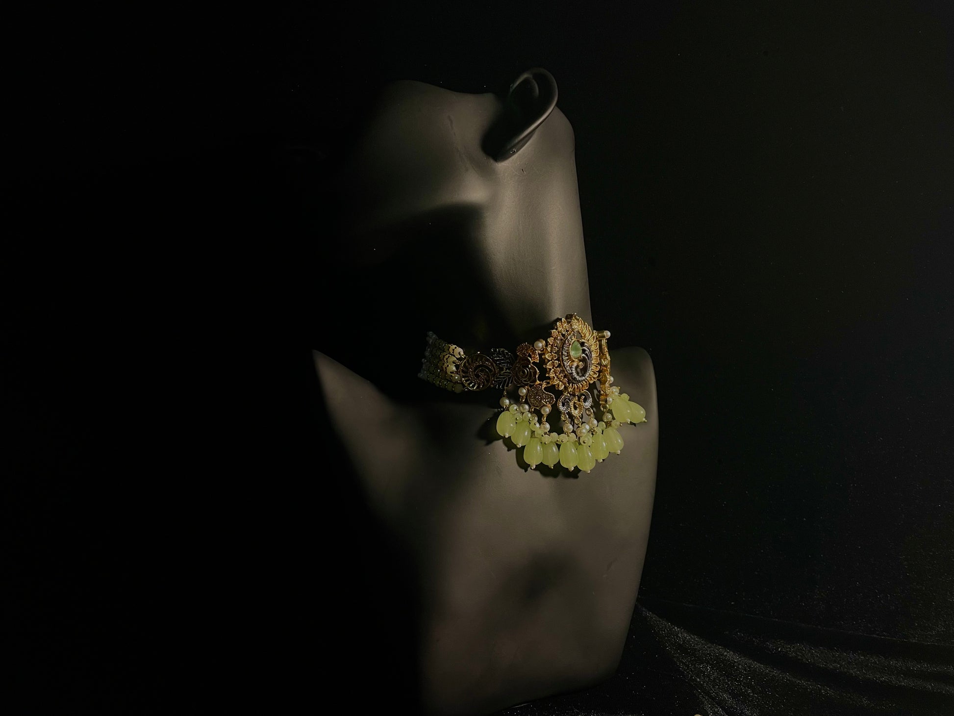 Transform into royalty with the Baadshahi Baag set – a stunning choker showcasing light green beads in an exquisite design that will captivate everyone's attention. Why settle for ordinary when you can adorn yourself with this complete set featuring perfectly matched earrings and tikka? This elegant trio promises to elevate any outfit, making it an essential investment for those who appreciate timeless beauty with a touch of nature-inspired elegance.