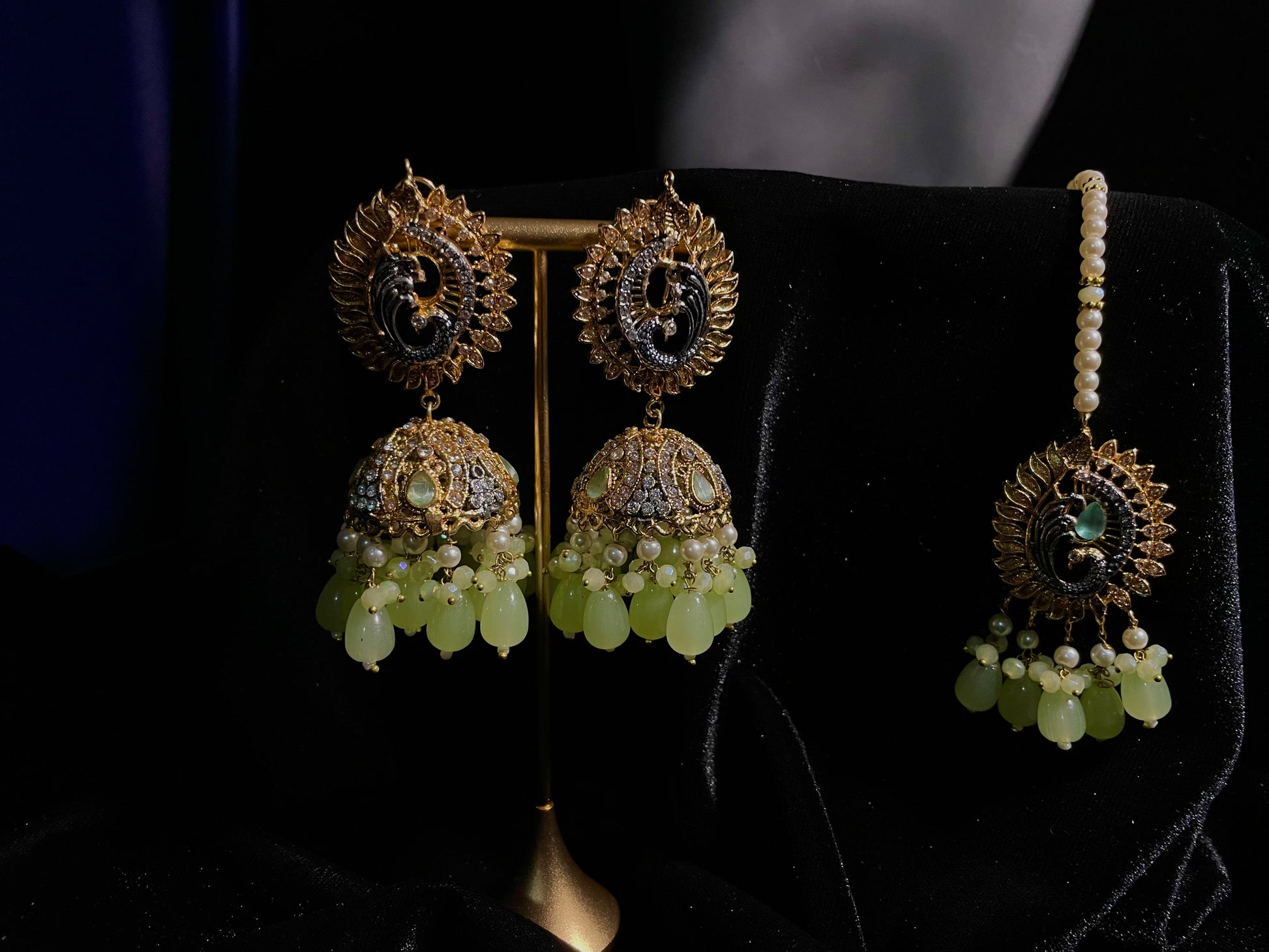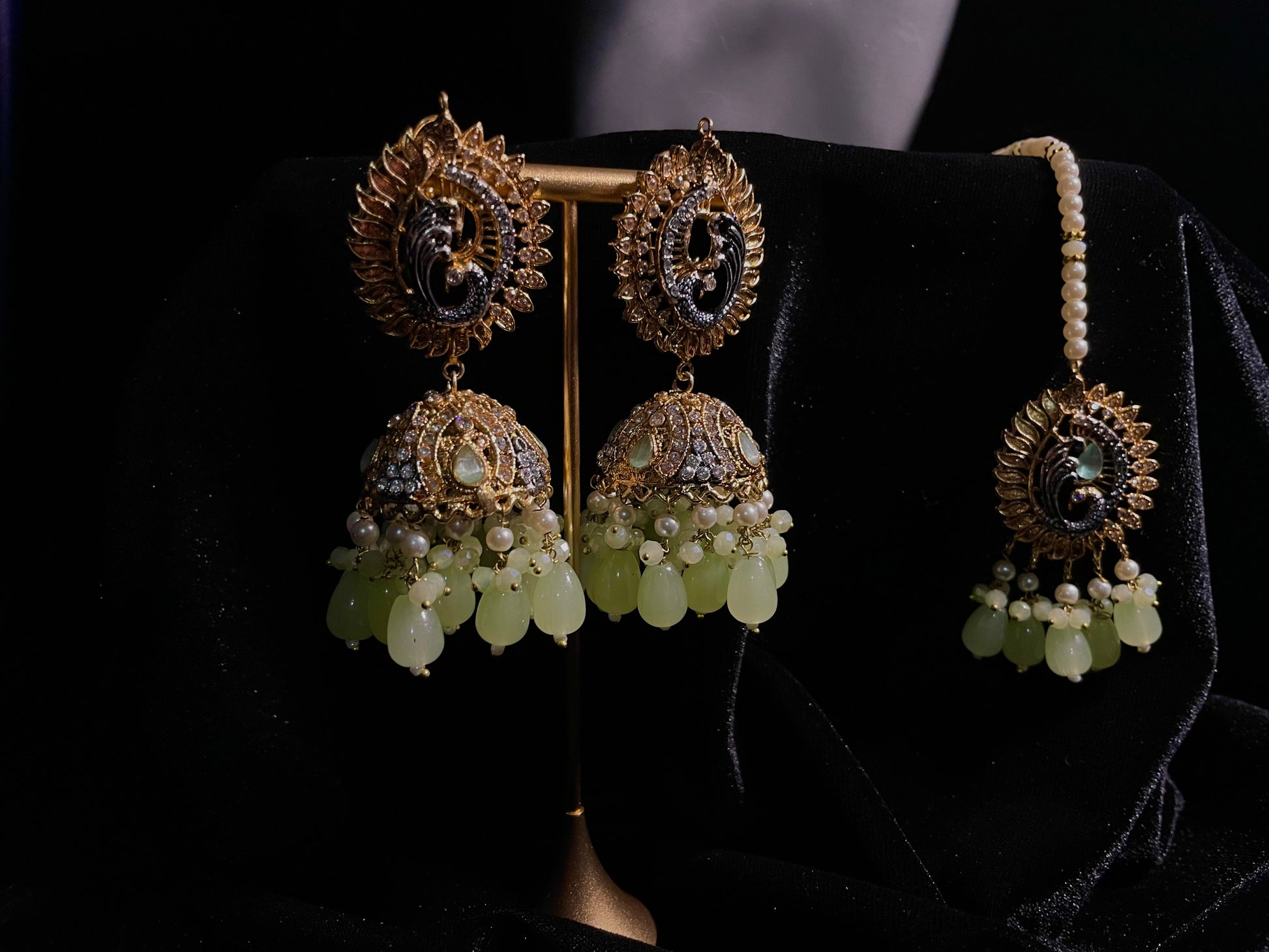 Earrings are approximately 3" in length while tikka is around 2" in length.