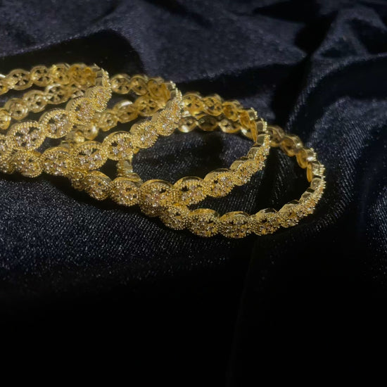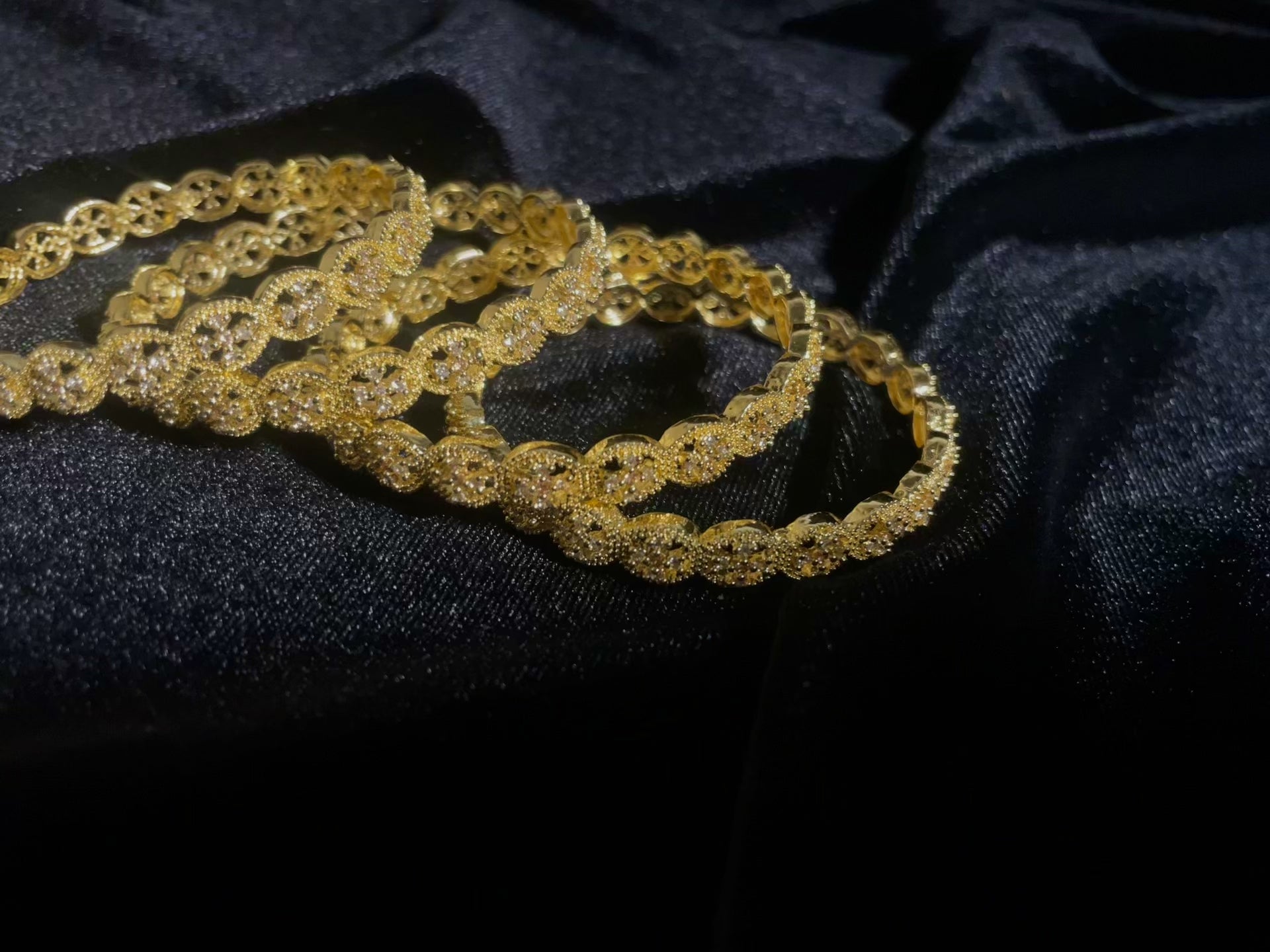 The Chanak Bangles showcase a captivating blend of champagne and clear crystals, available in two elegant color options: champagne and red. Each bangle is adorned with intricate detailing. Meticulously set crystals shimmer with every movement, capturing and reflecting light in a display of radiant brilliance and timeless beauty.