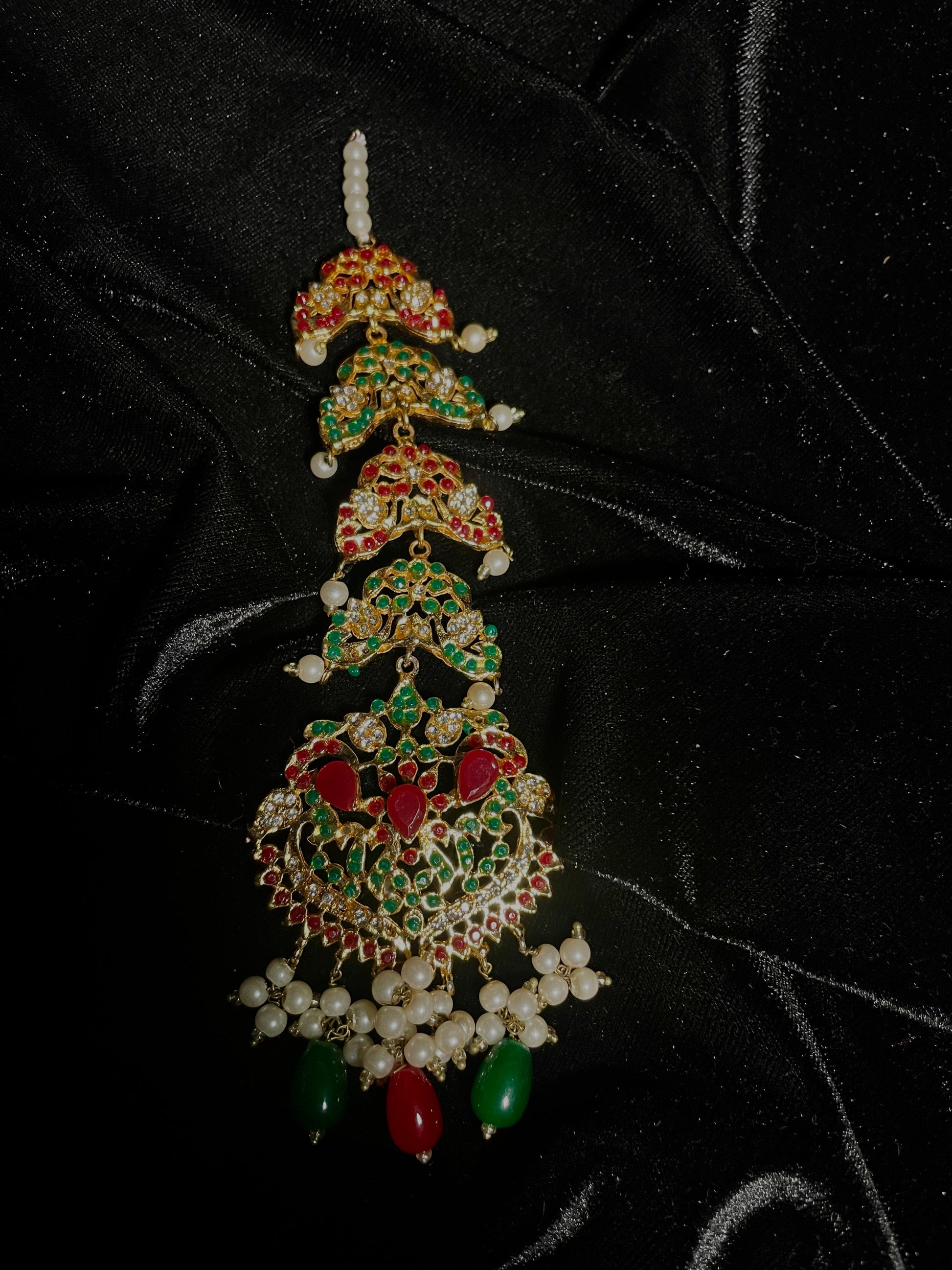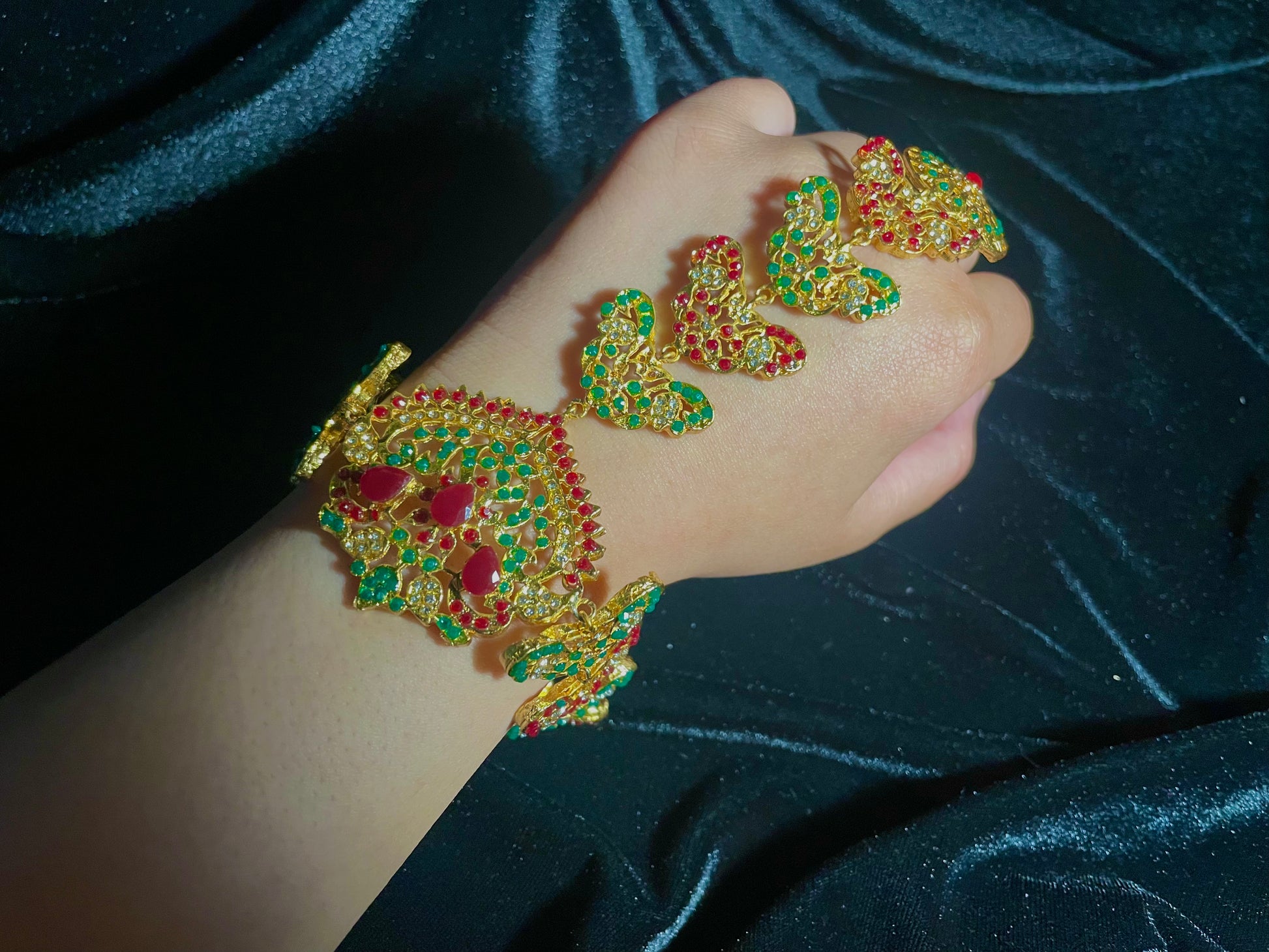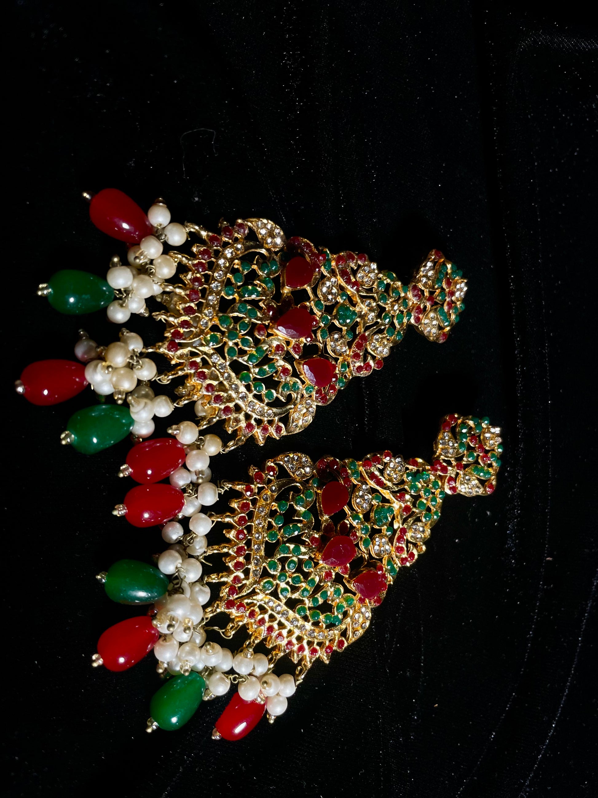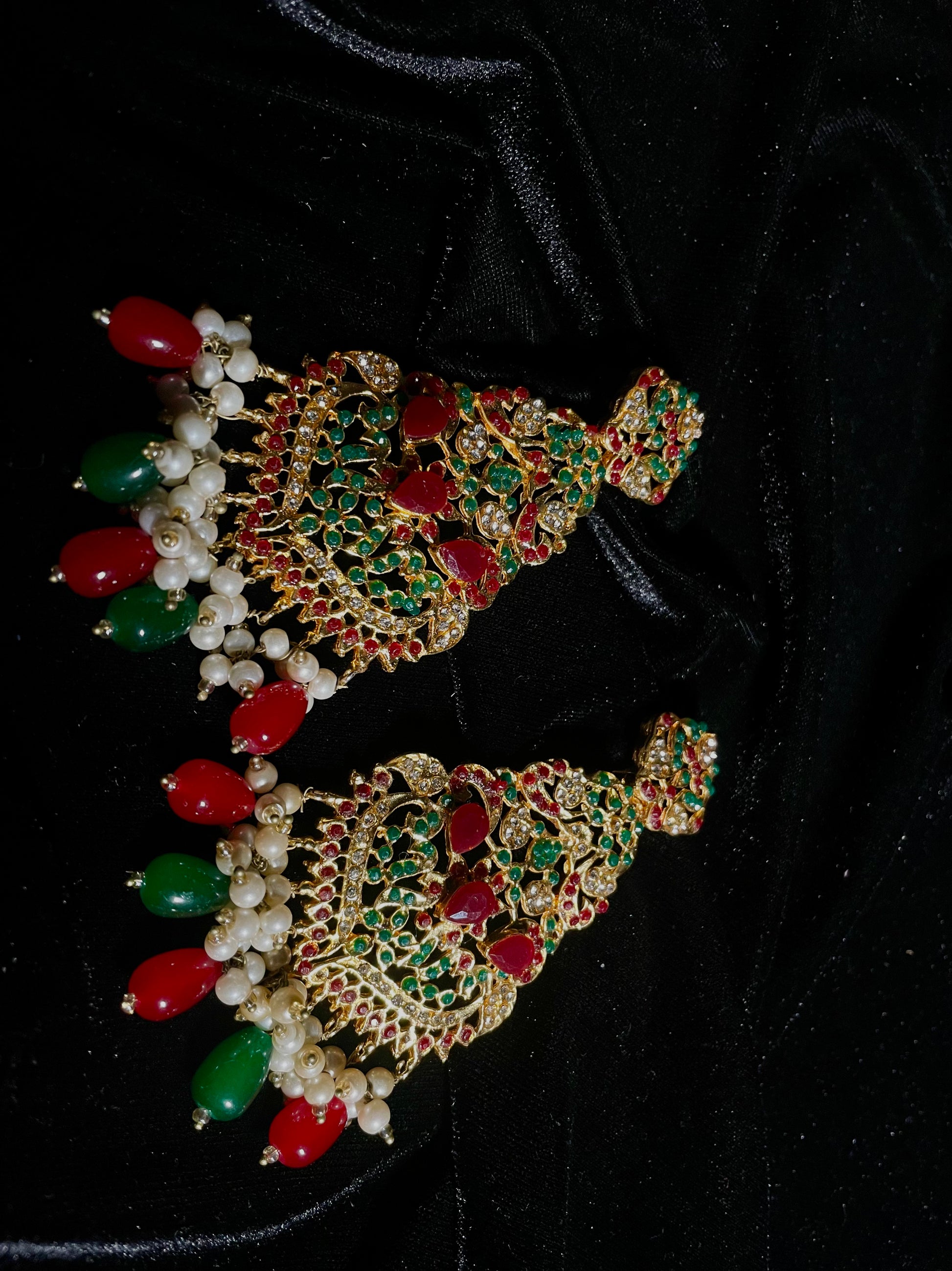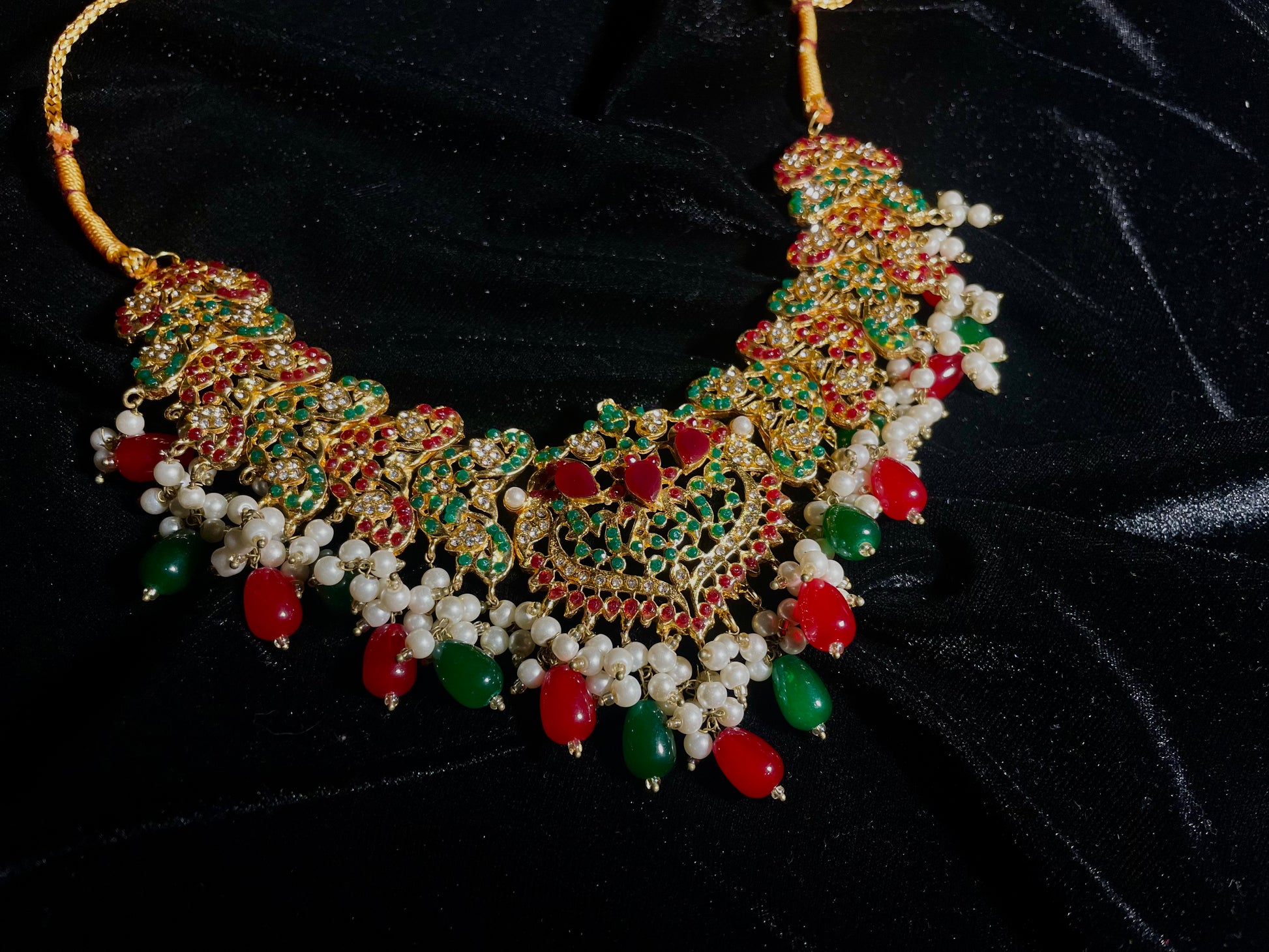 Elevate your presence with this breathtaking jewelry set featuring vibrant green, rich red, and luxurious gold tones. The bold statement piece paired with matching earrings creates an ensemble worthy of royalty. Commanding attention with every movement, this magnificent set transforms special occasions into unforgettable moments. Not for the faint-hearted, it's designed for those who dare to stand out and embrace their inner empress. Make your next celebration truly extraordinary.