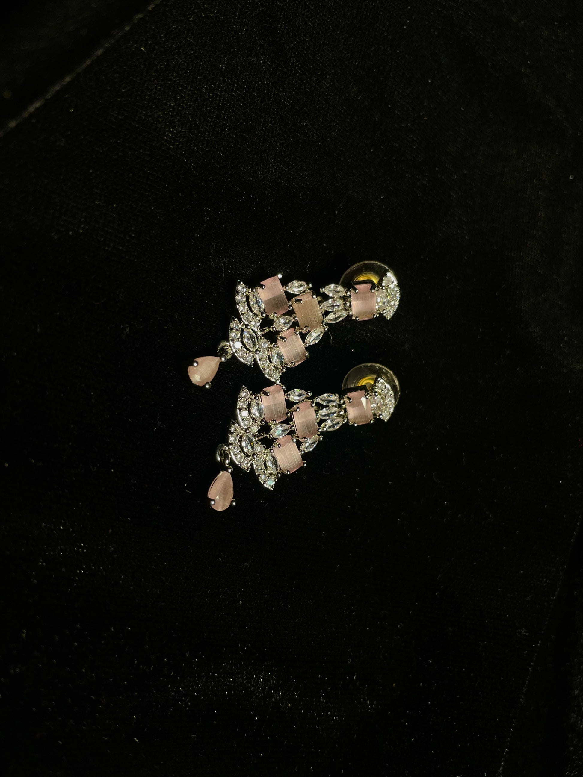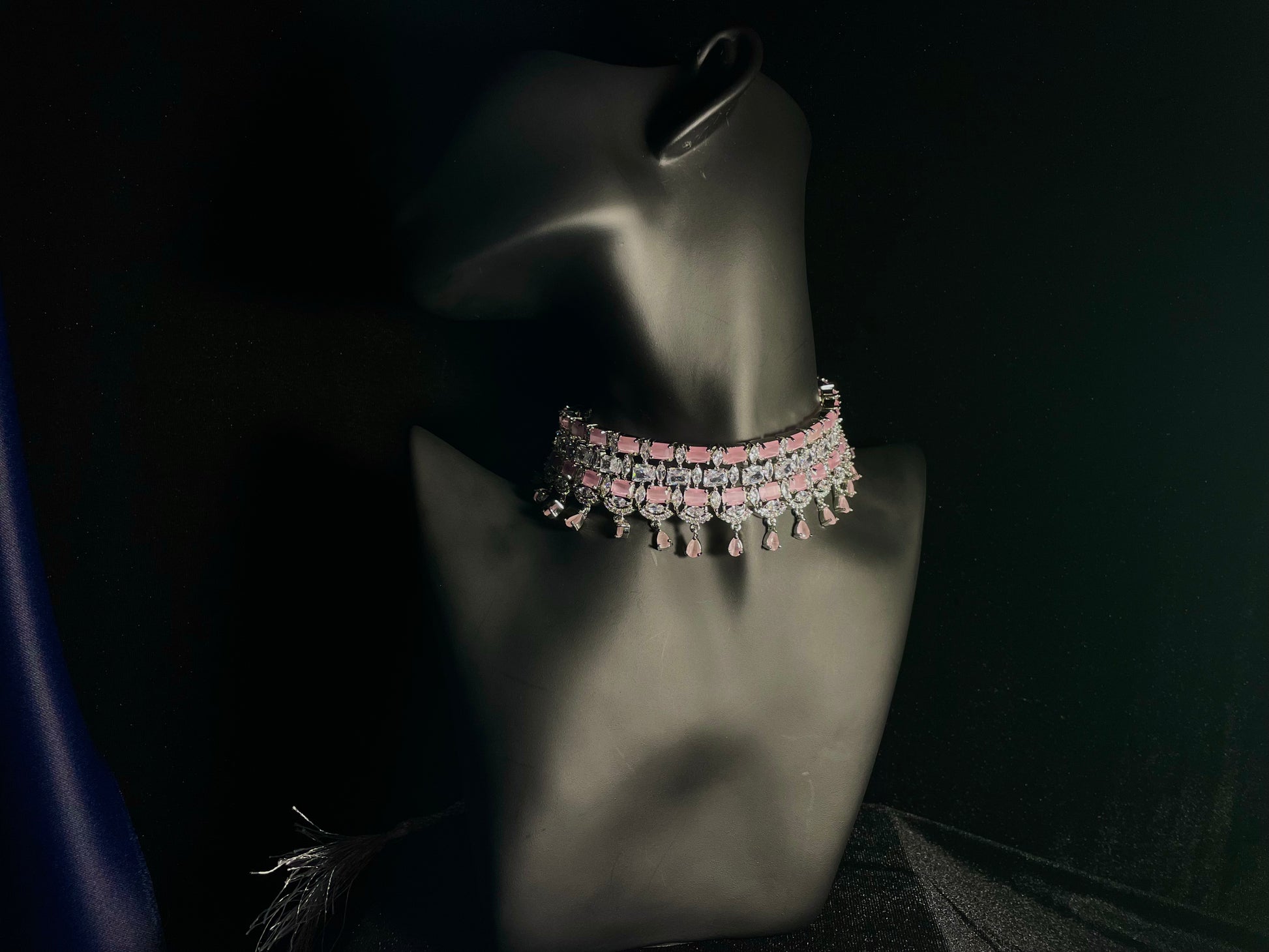 Elevate your style with our Dilruba Set, featuring a stunning light pink and zircon diamond choker paired with matching earrings. This elegant ensemble adds a touch of refined glamour to any outfit, making it perfect for special occasions or adding sophistication to everyday wear. Don't miss the opportunity to own this exquisite statement piece that will draw compliments wherever you go.