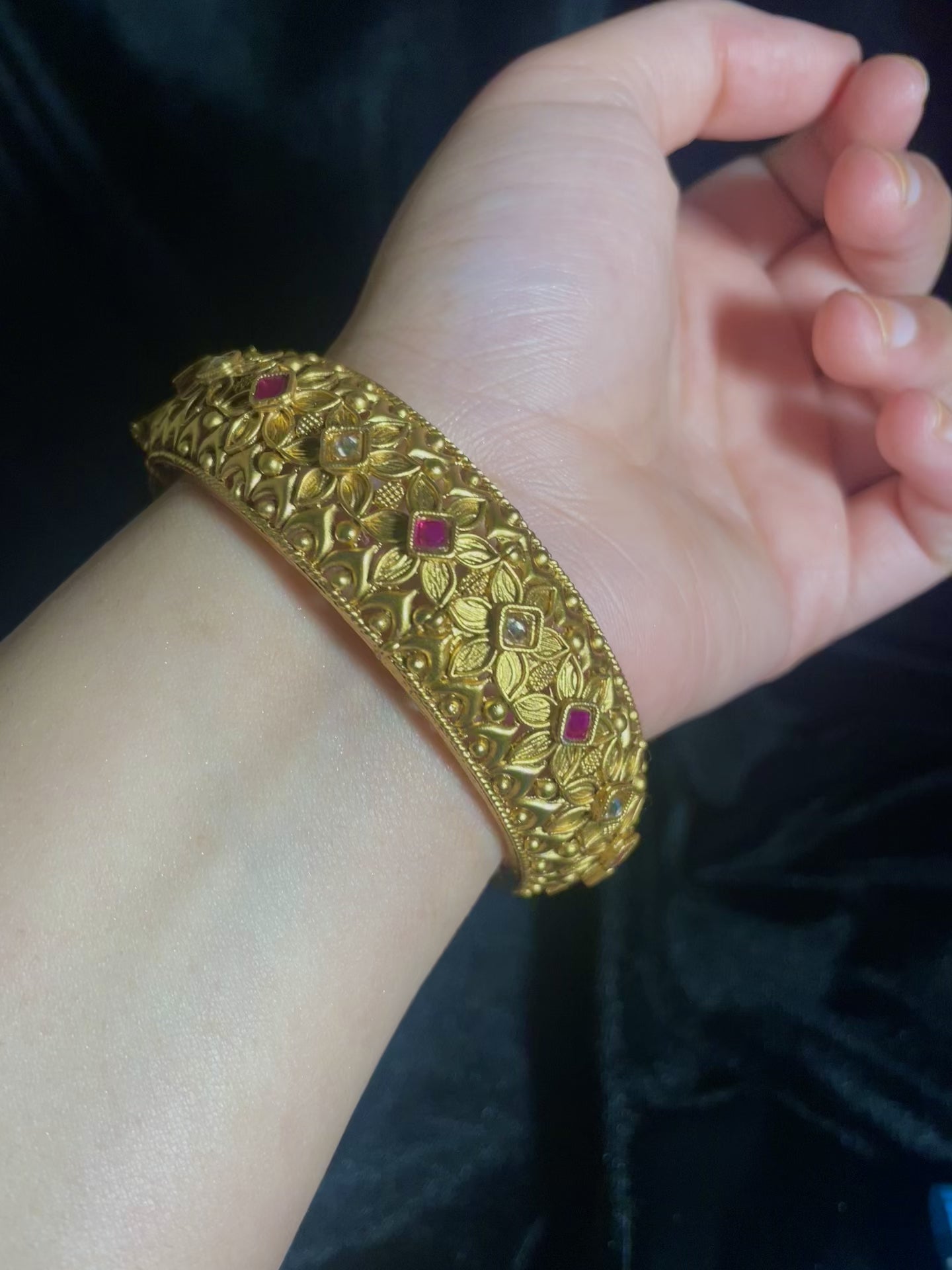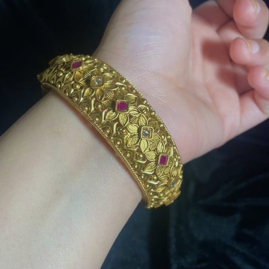The Eman Bangles collection presents substantial, statement pieces. Each bangle features elaborate floral motifs and precise detailing.