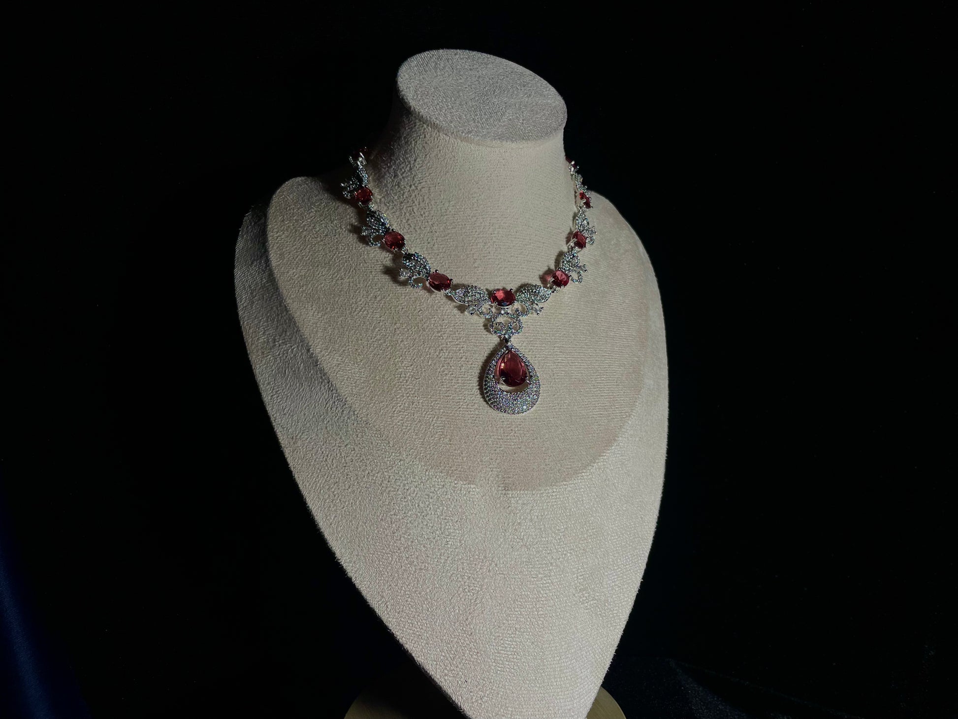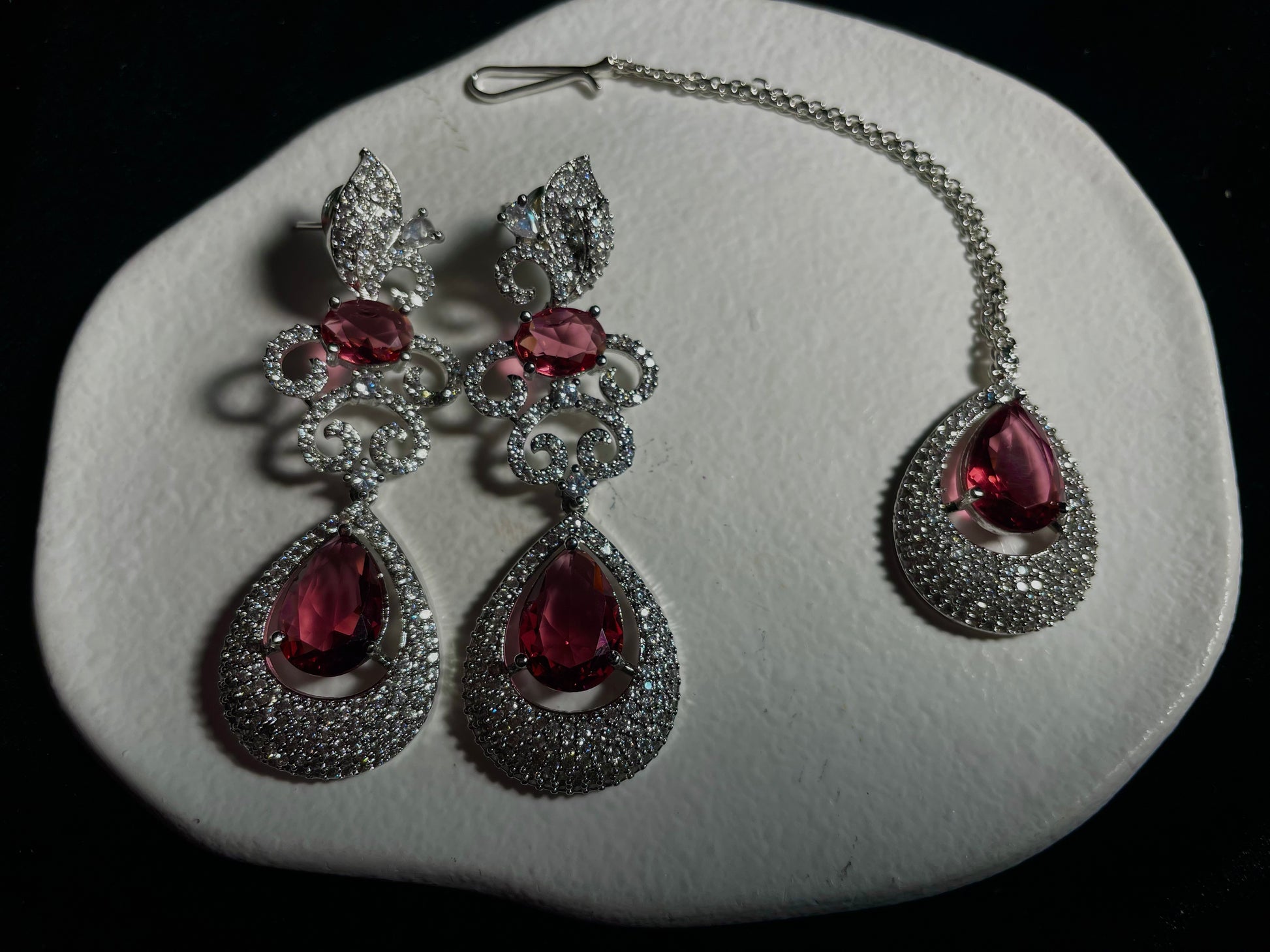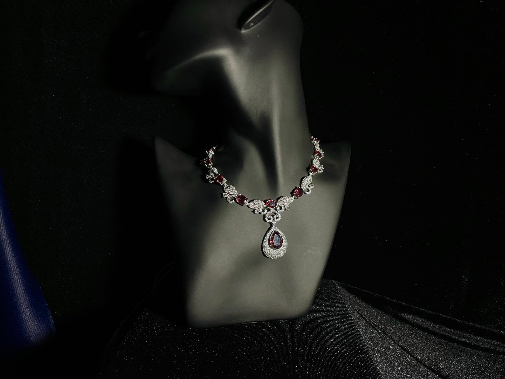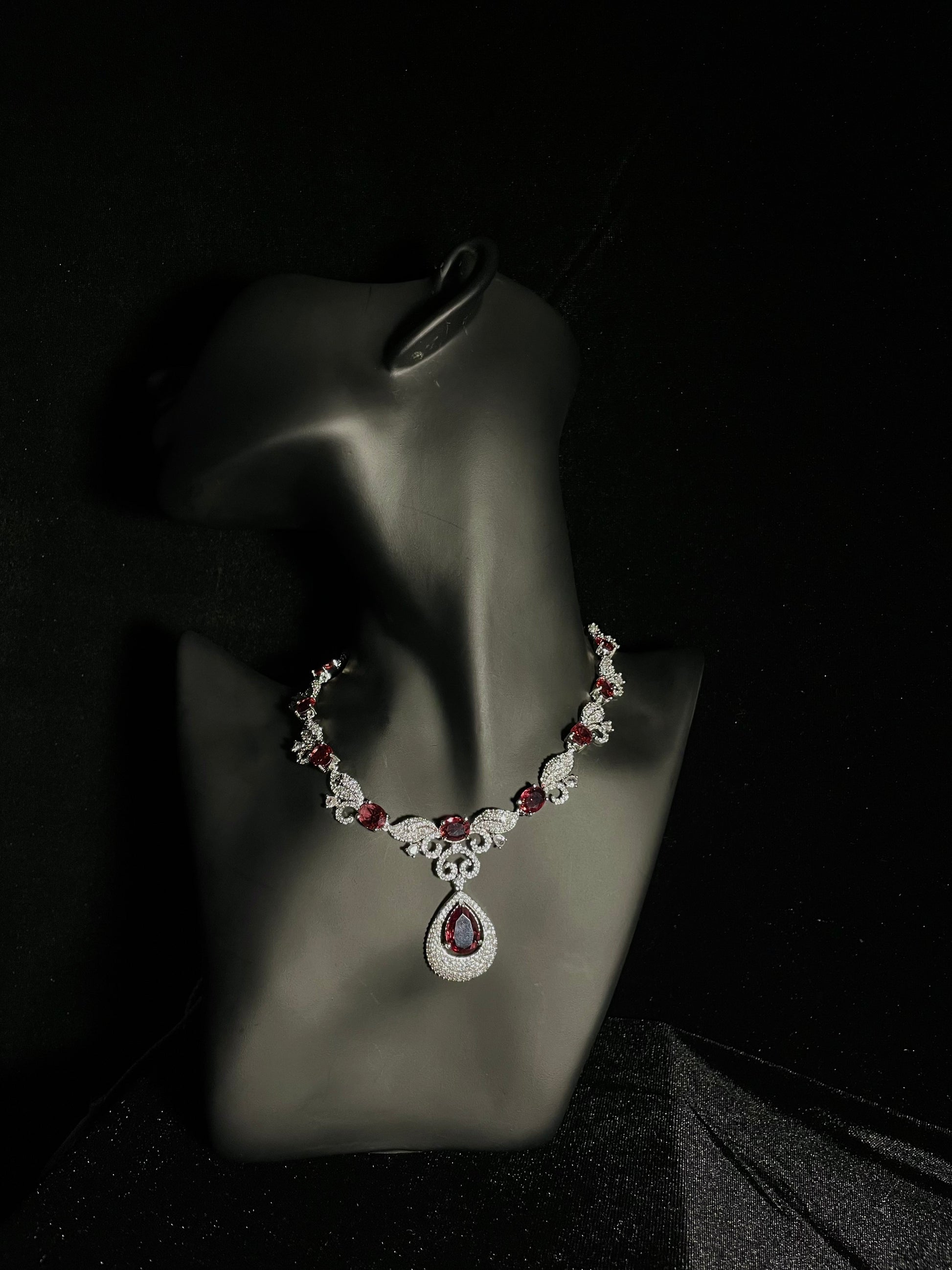 Indulge in the royal allure of Gulaab-e-shahi, where a stunning magenta stone takes center stage, surrounded by brilliant zircon accents. This masterpiece showcases an intricate design that speaks of craftsmanship passed down through generations. The elegant arrangement of stones creates a captivating play of light that will draw admiring glances wherever you go. Transform any outfit into a statement of sophisticated luxury.