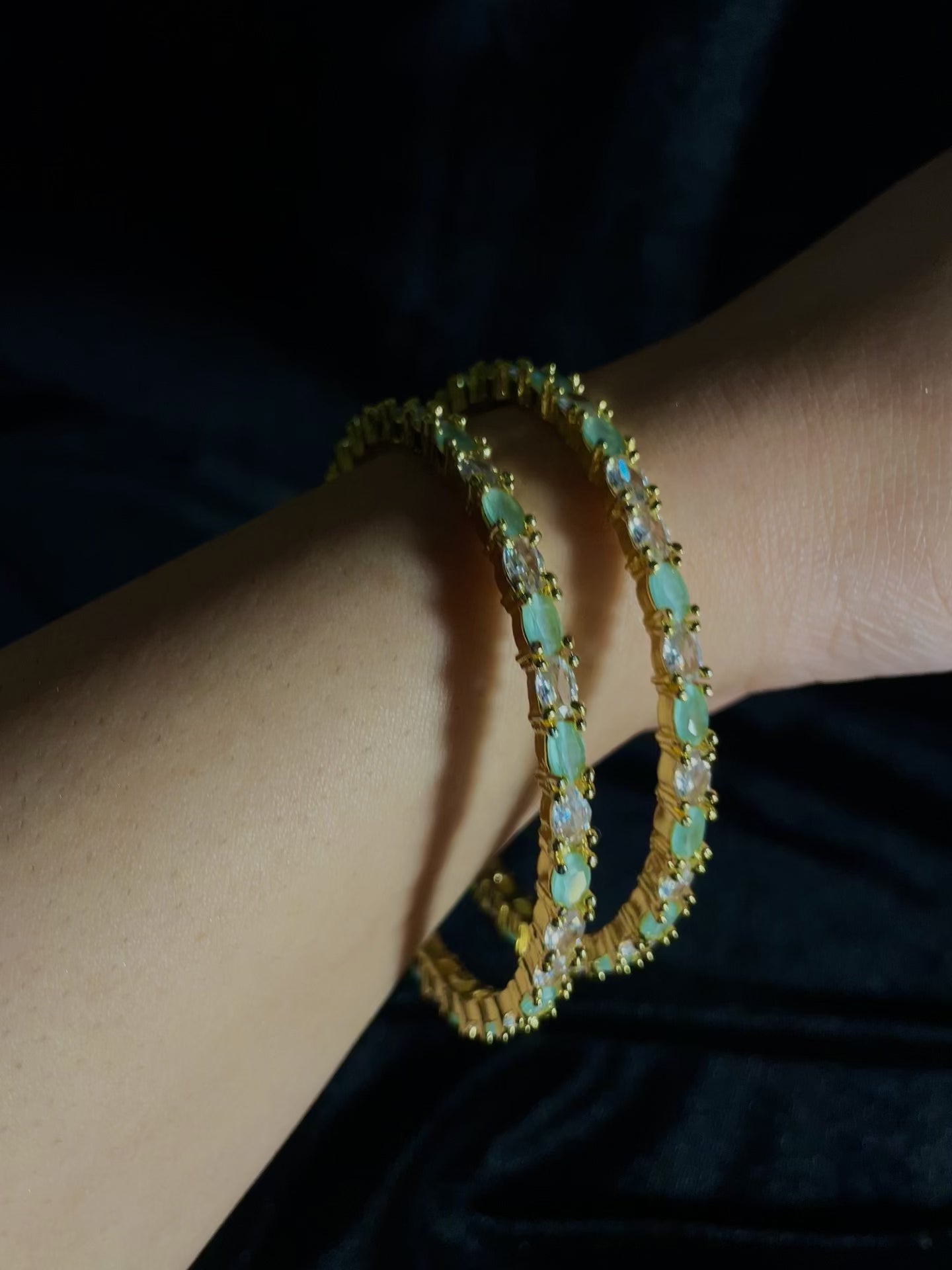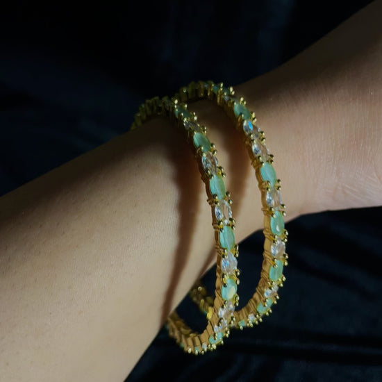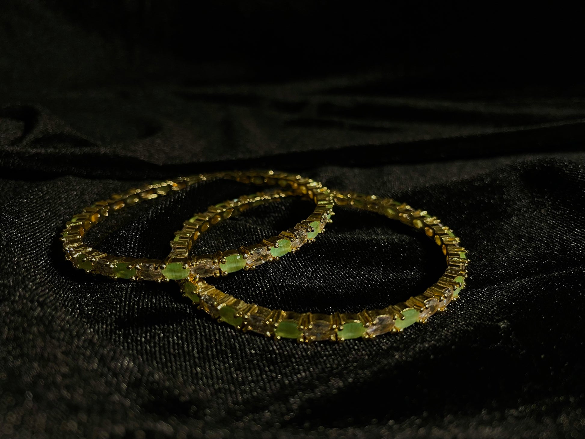 Stack up the fun with our Hira Bangles – playful arm candy that'll have you jingling with joy! These charming bangles feature vibrant green, glitzy gold, and a sprinkle of silver. Perfect for special occasions or to dress up your attire!