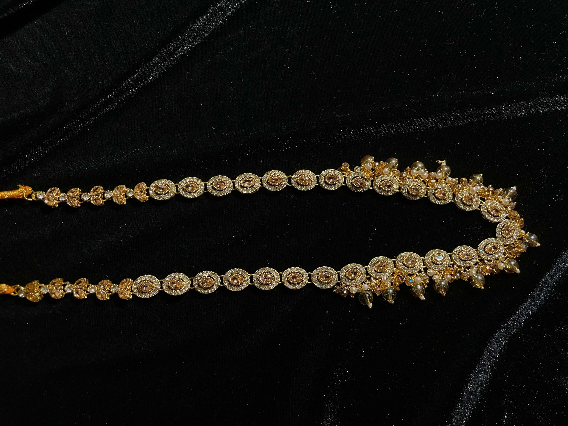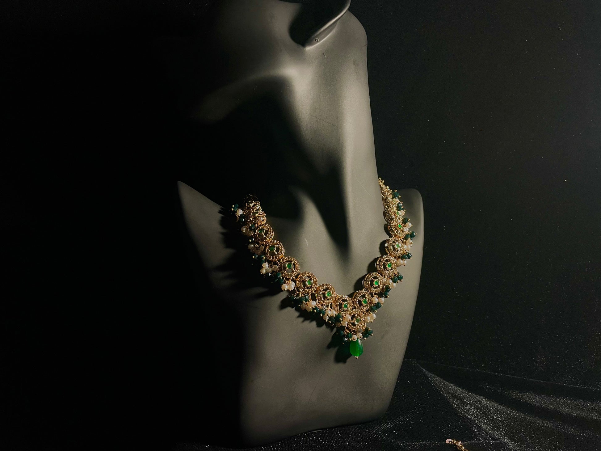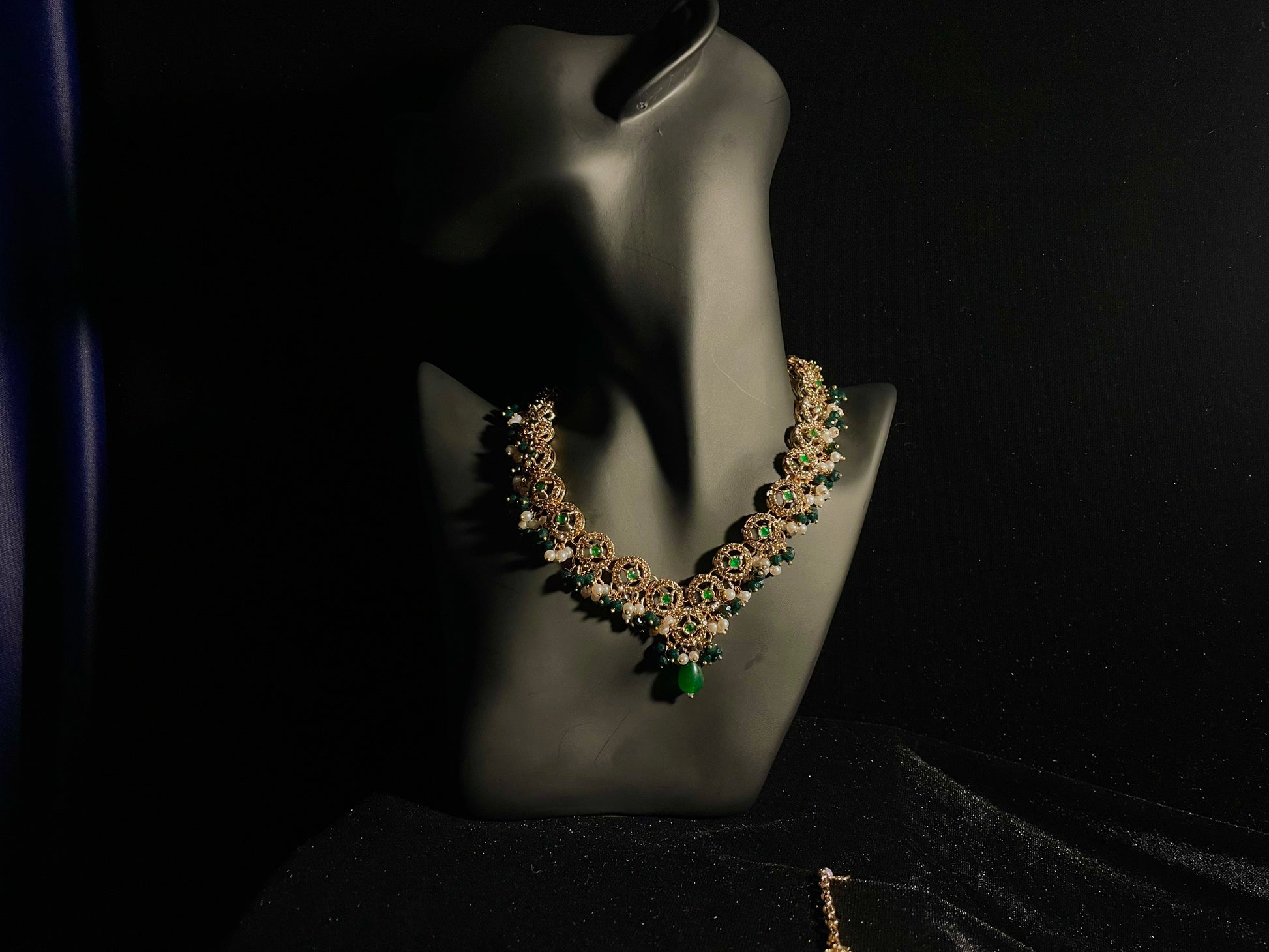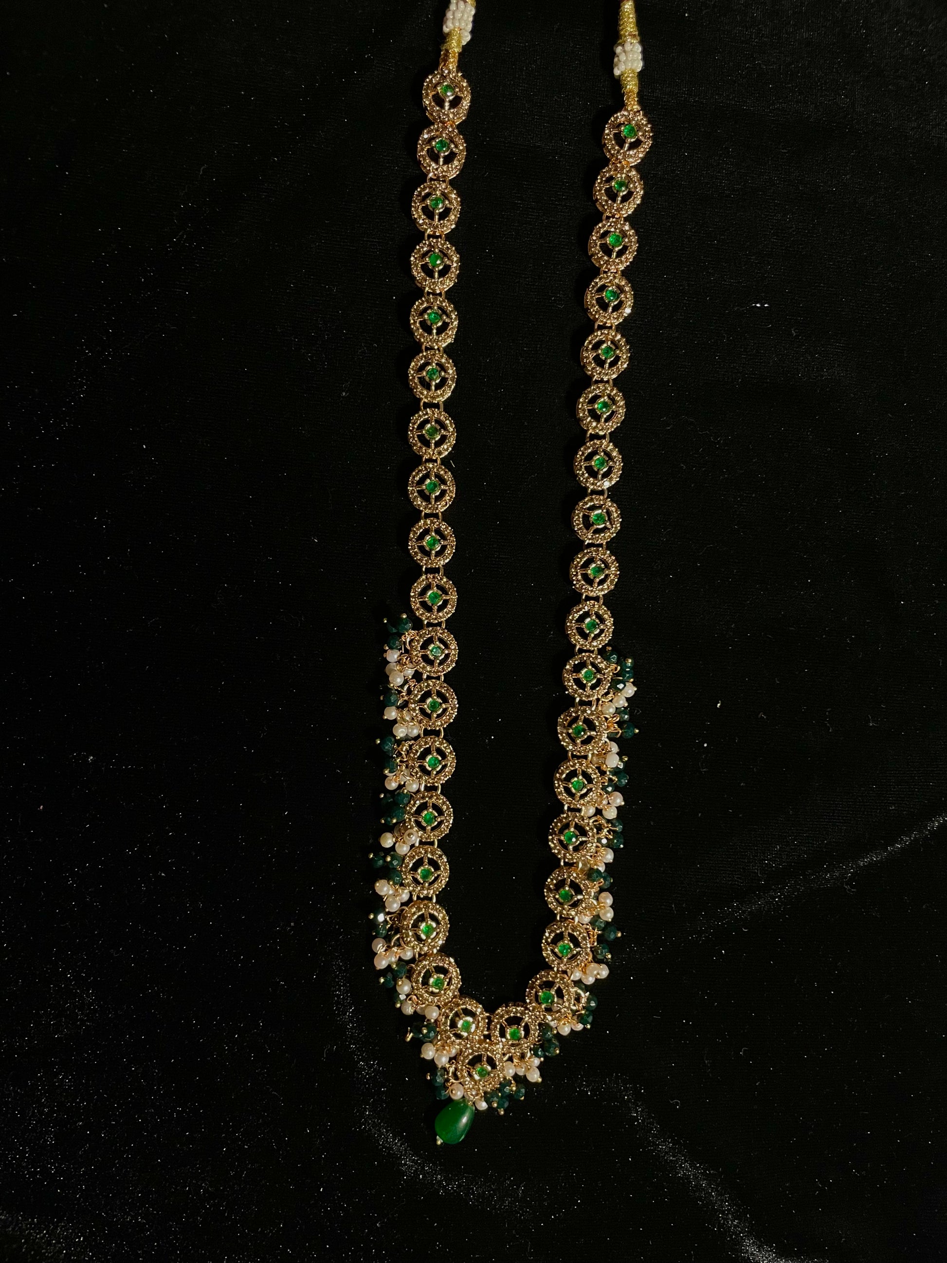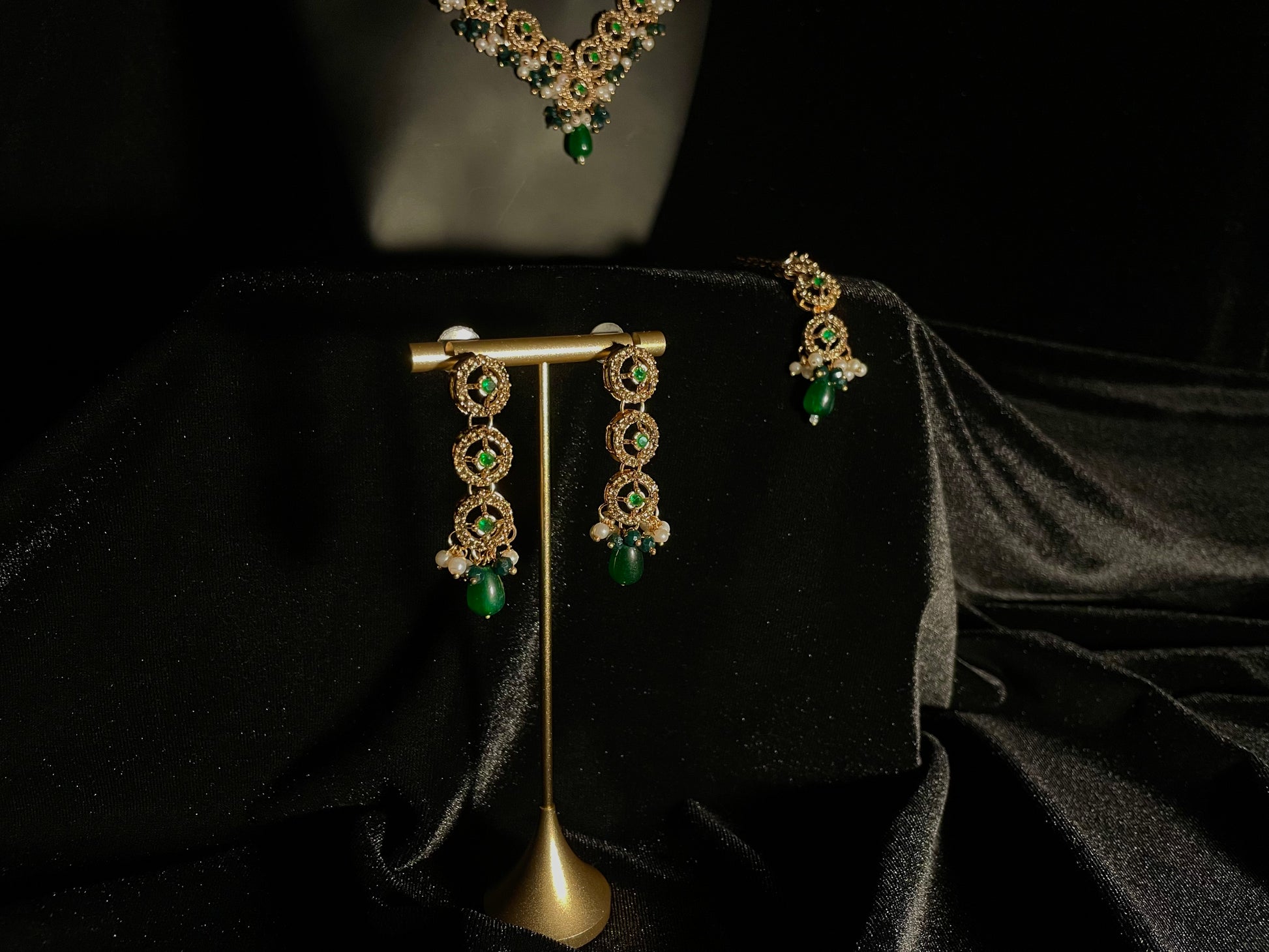 Exquisitely crafted Mughal Manzil haar necklace set featuring intricate detailing inspired by traditional Mughal artistry. Available in champagne and green colorways, each set includes matching earrings and tikka. The long haar design creates a regal silhouette, perfect for special occasions where elegance is paramount. Meticulous craftsmanship ensures each piece captures authentic heritage aesthetics.