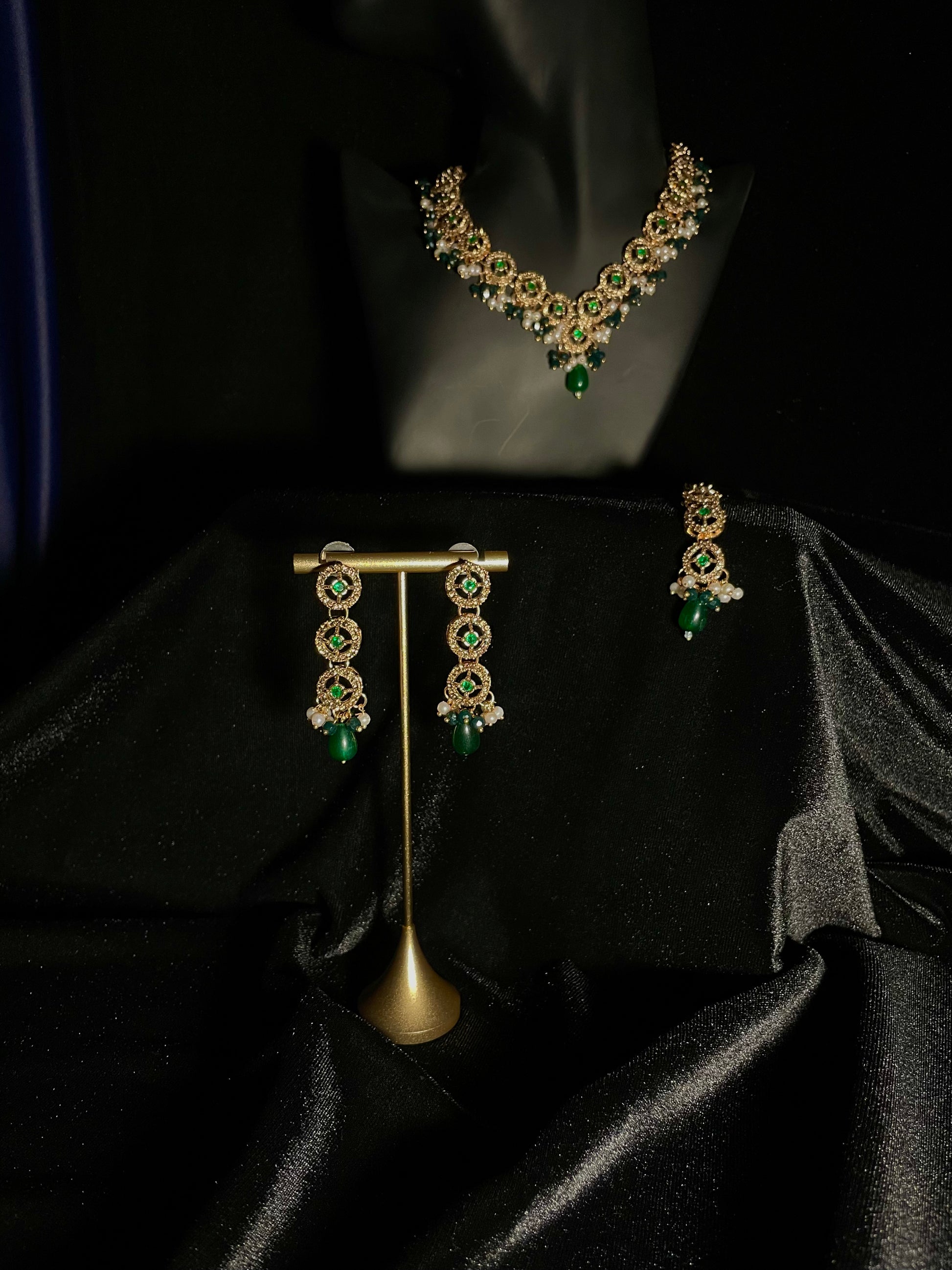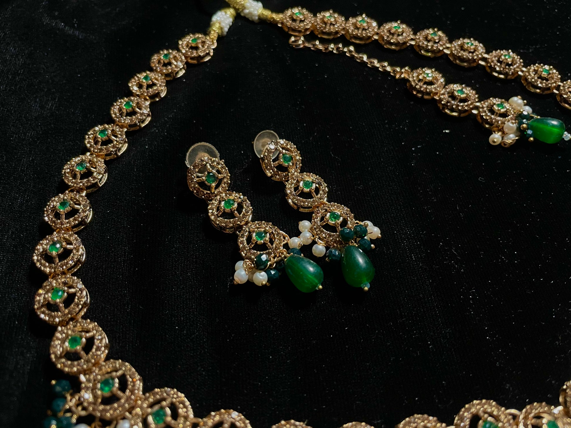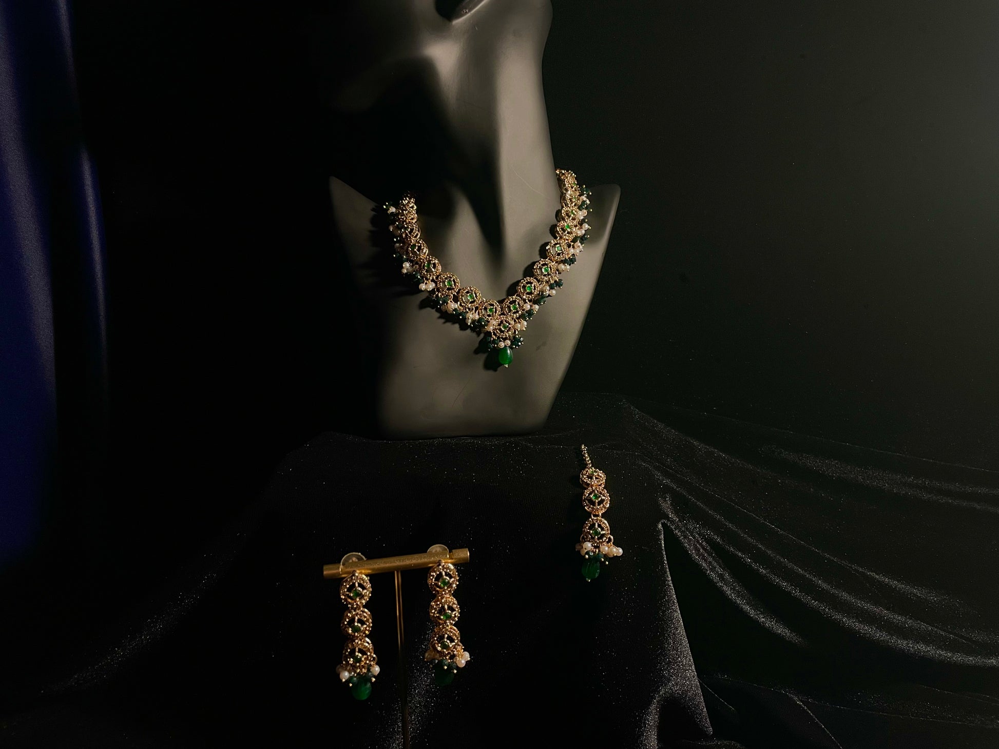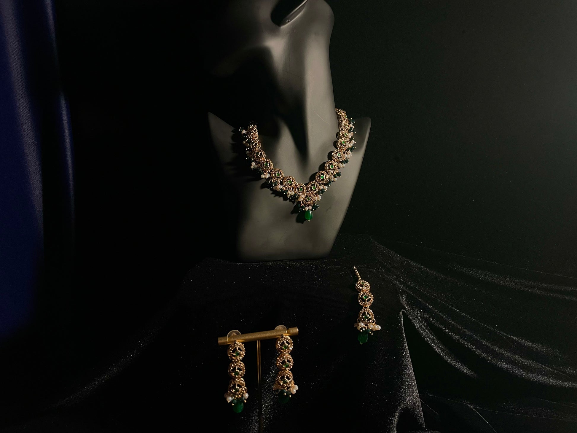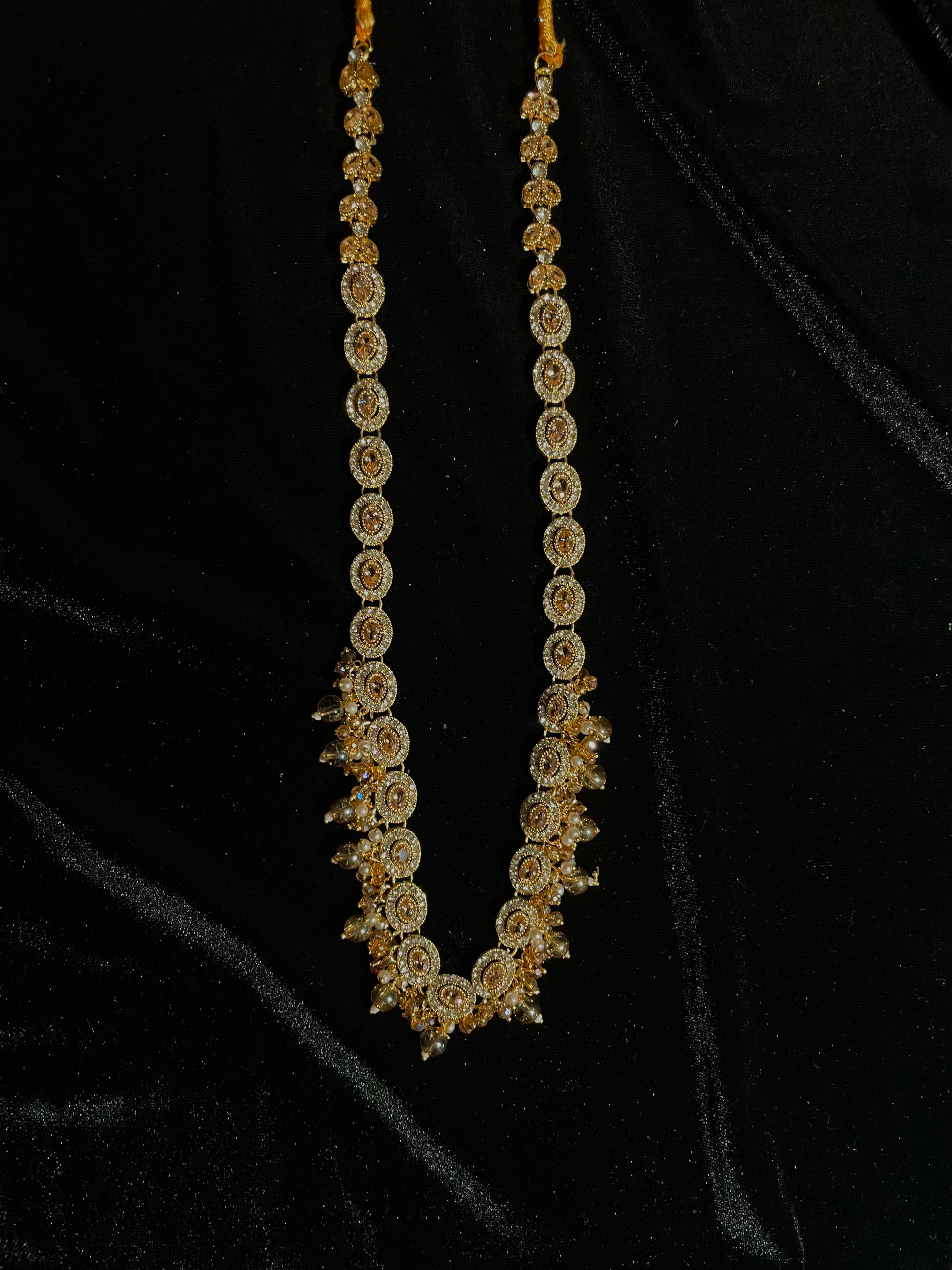 Exquisitely crafted Mughal Manzil haar necklace set featuring intricate detailing inspired by traditional Mughal artistry. Available in champagne and green colorways, each set includes matching earrings and tikka. The long haar design creates a regal silhouette, perfect for special occasions where elegance is paramount. Meticulous craftsmanship ensures each piece captures authentic heritage aesthetics.