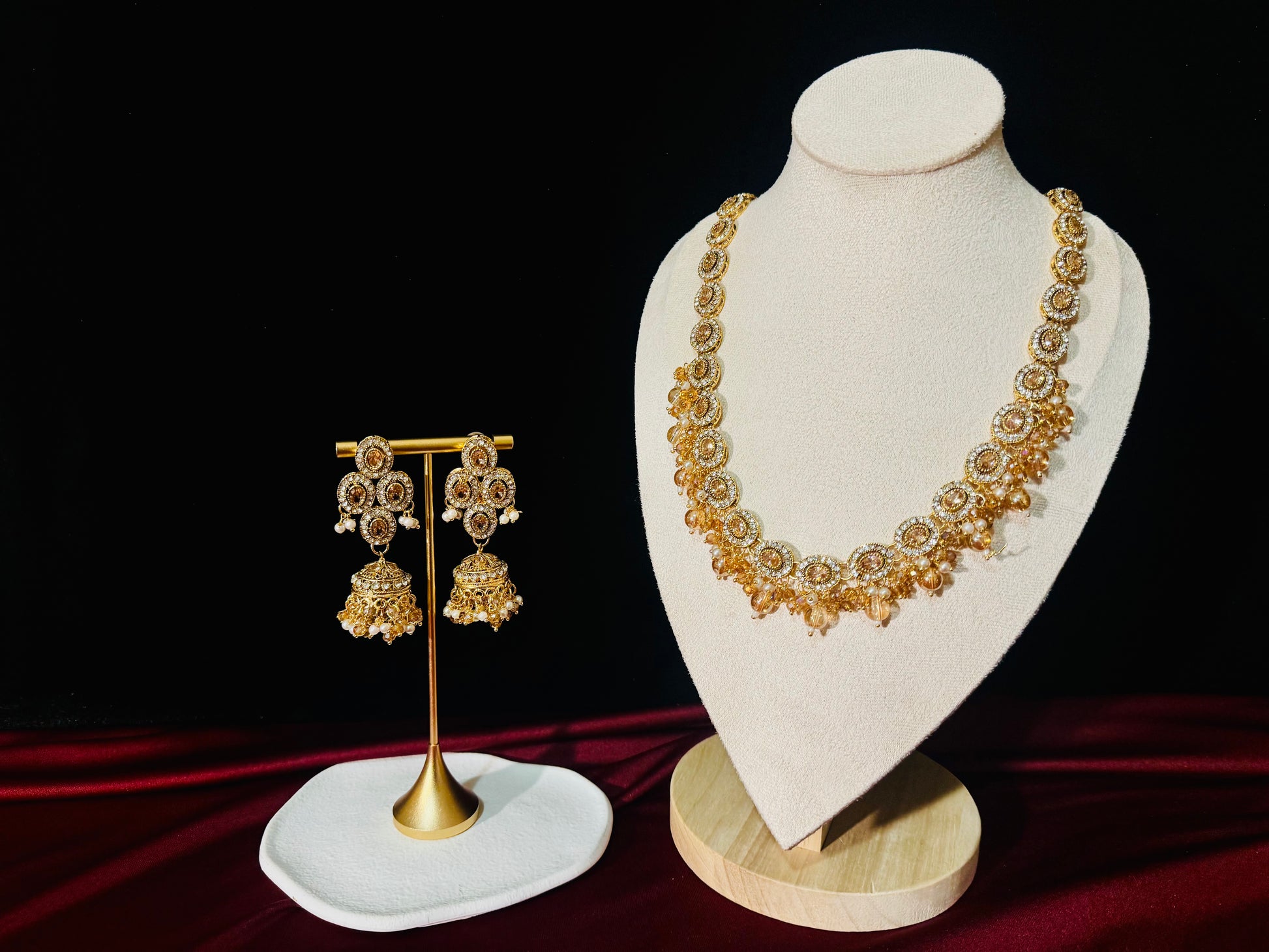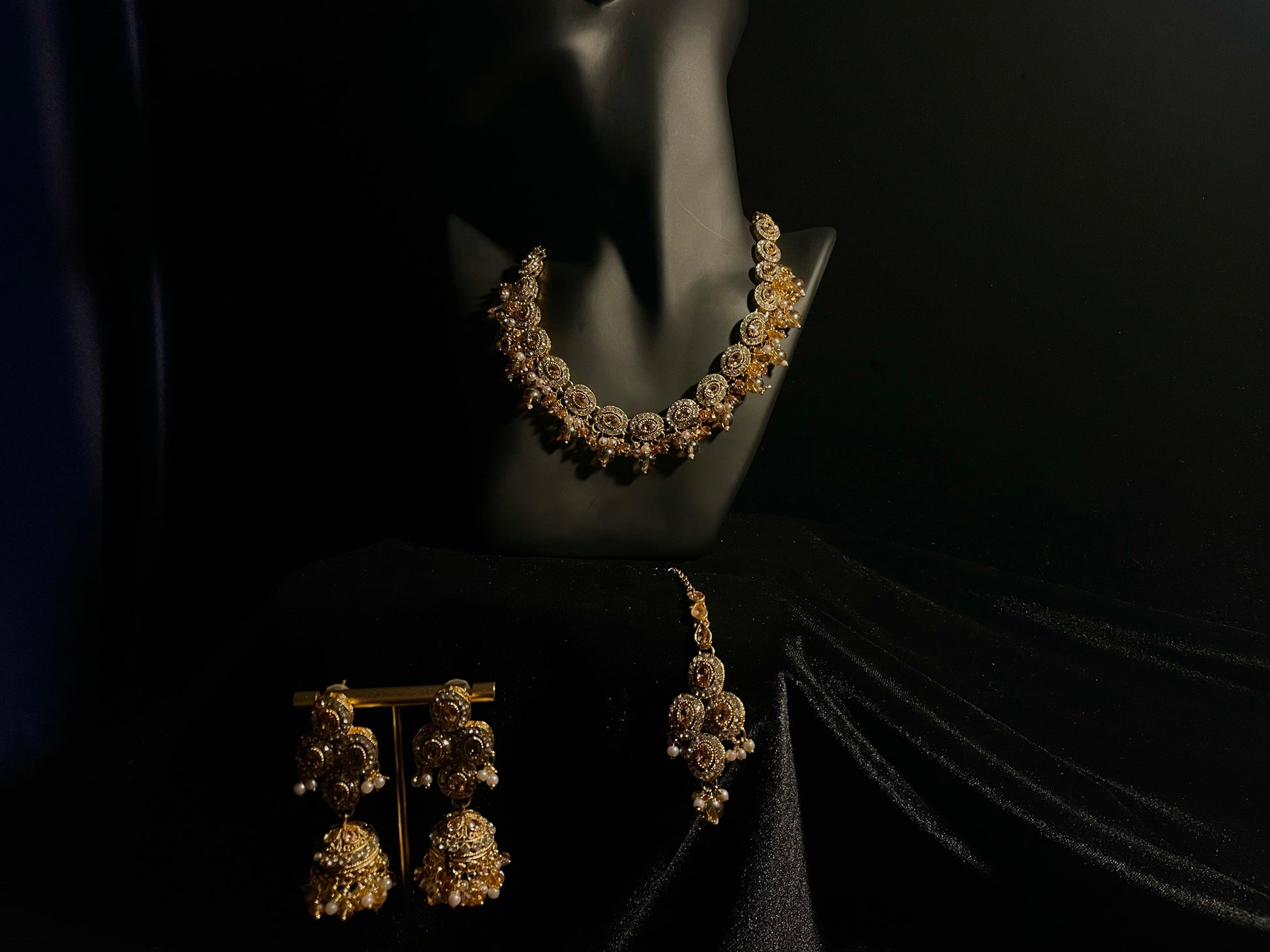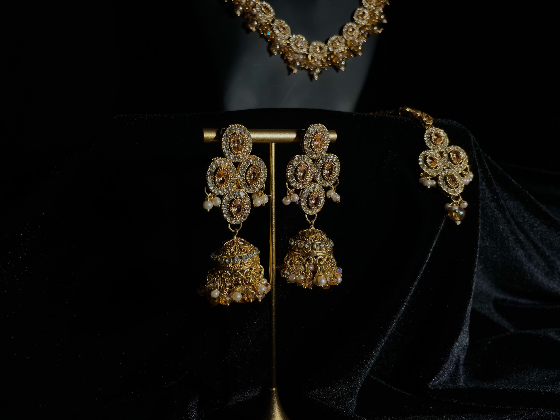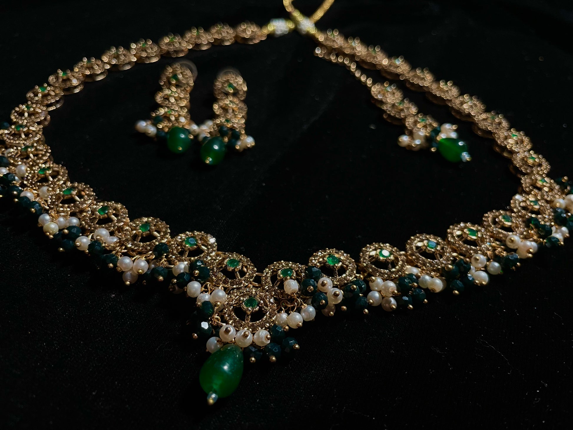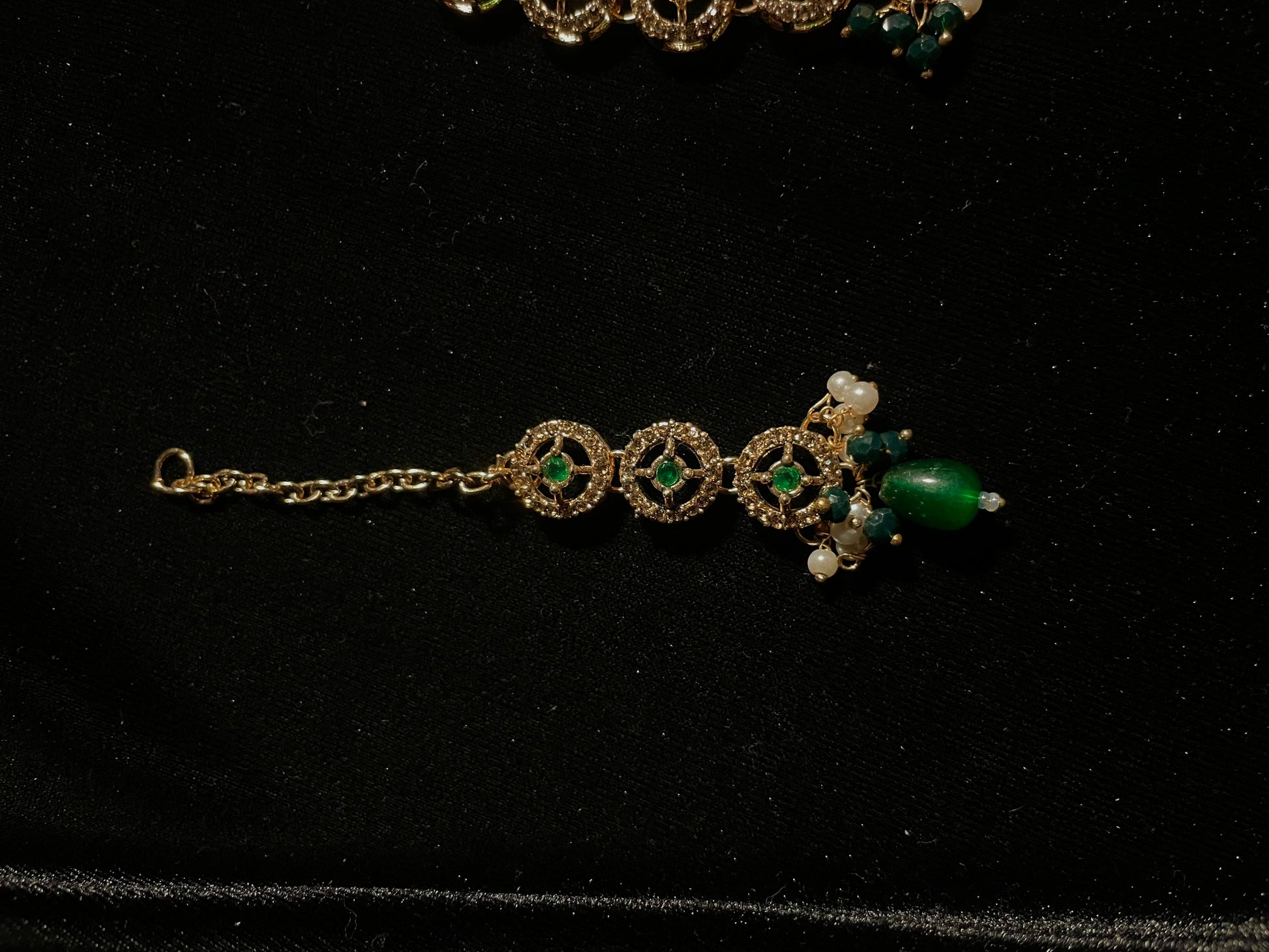 Exquisitely crafted Mughal Manzil haar necklace set featuring intricate detailing inspired by traditional Mughal artistry. Available in champagne and green colorways, each set includes matching earrings and tikka. The long haar design creates a regal silhouette, perfect for special occasions where elegance is paramount. Meticulous craftsmanship ensures each piece captures authentic heritage aesthetics.
