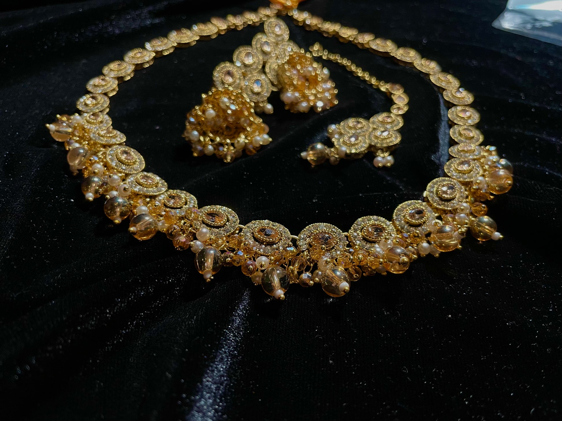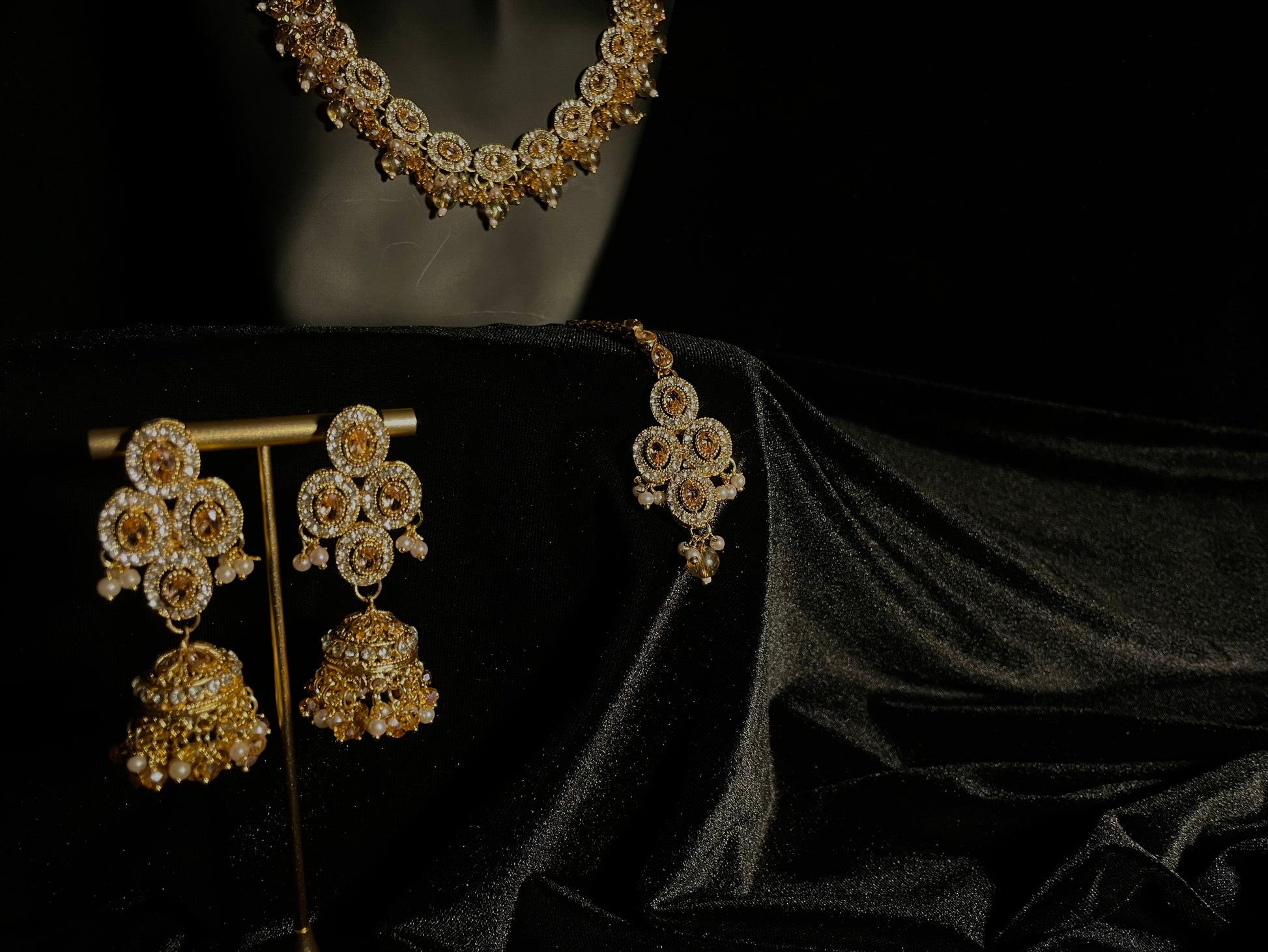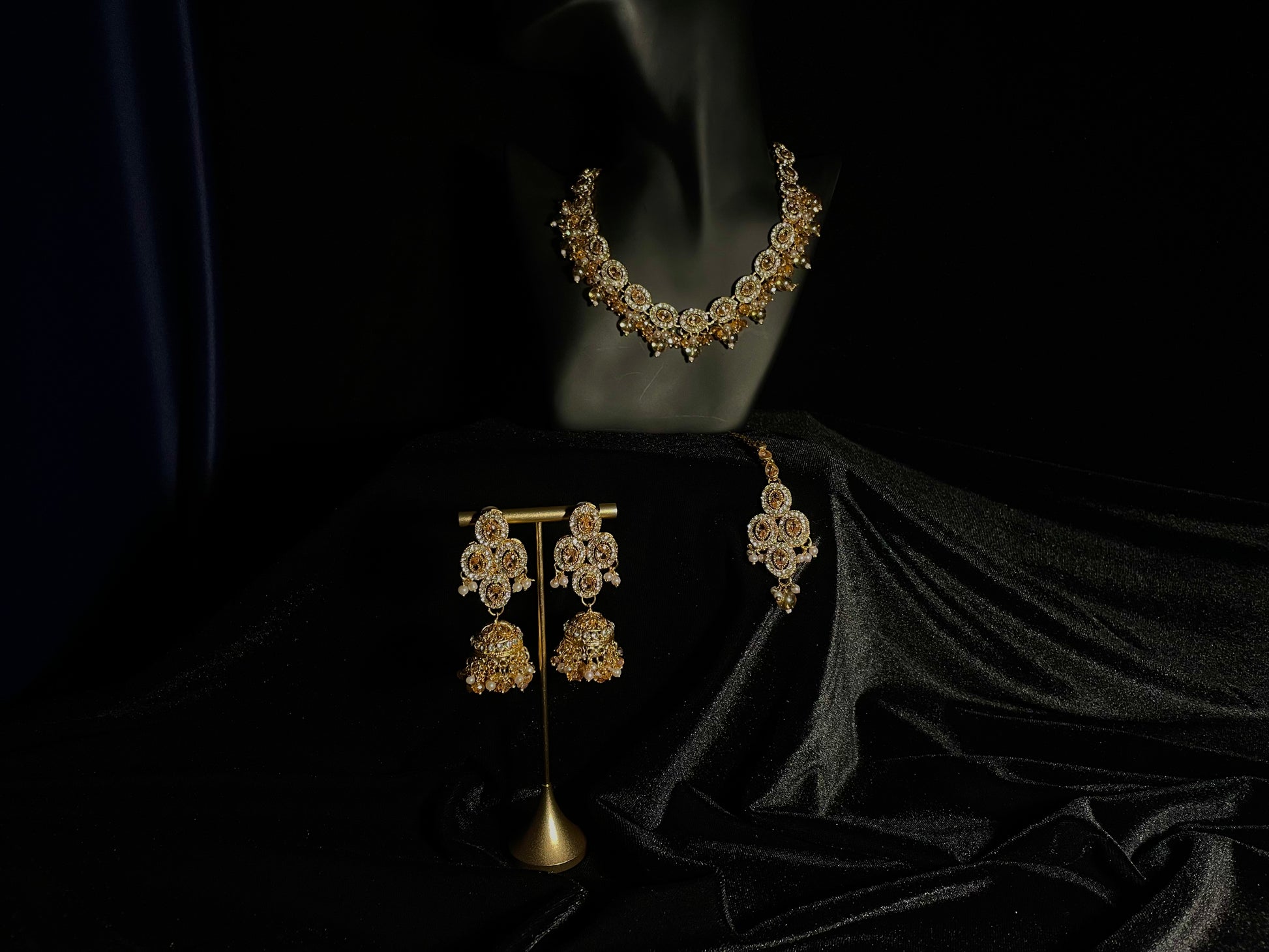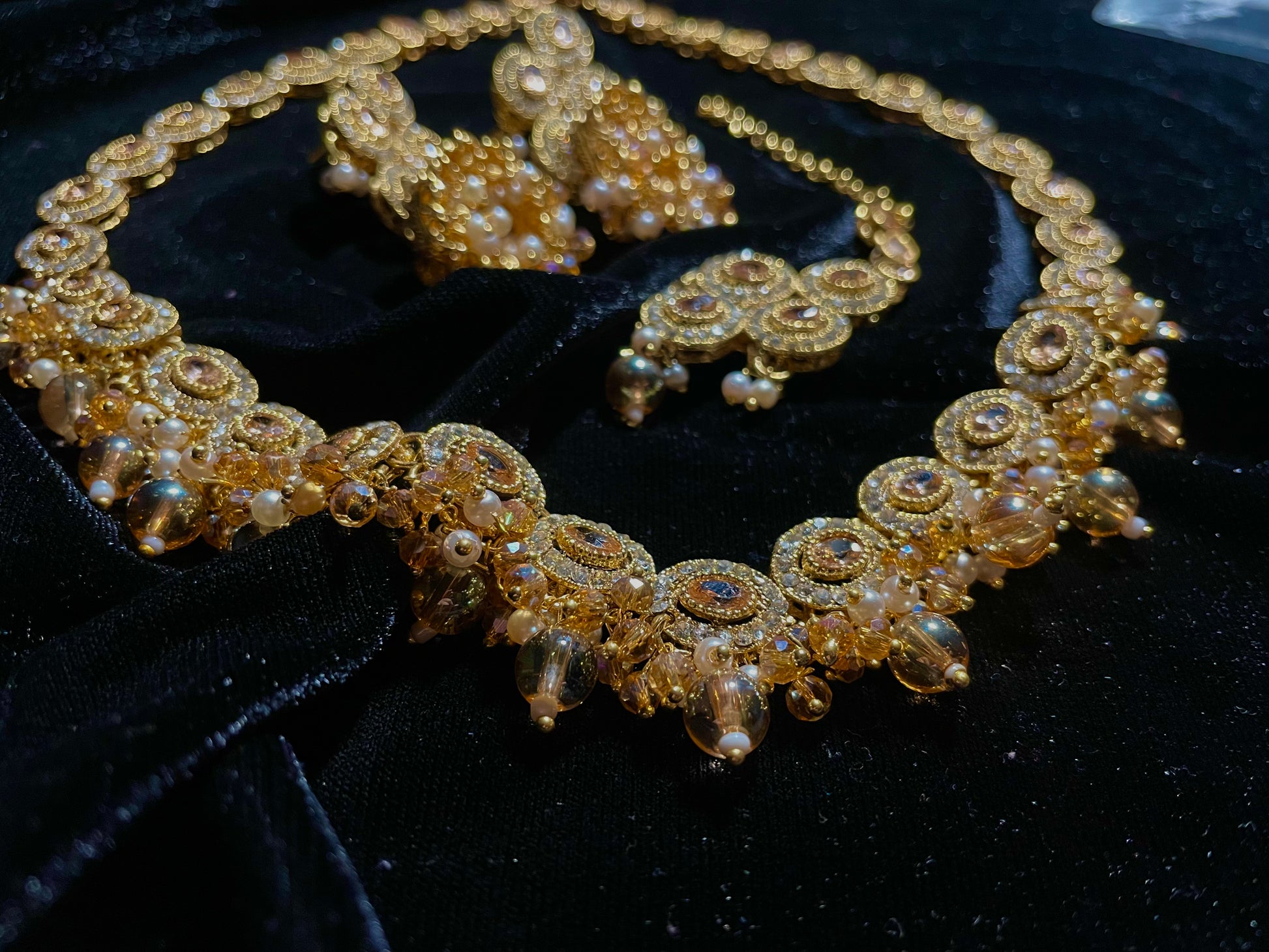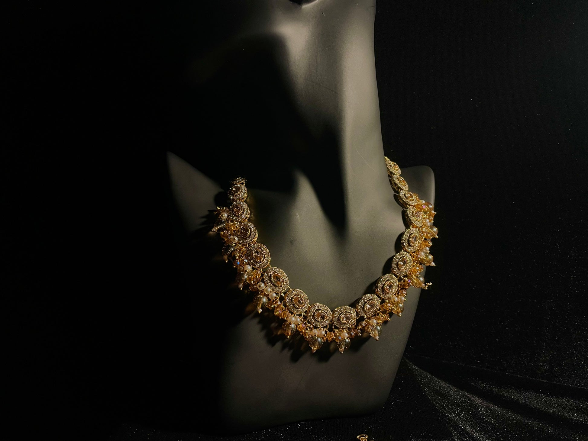 Exquisitely crafted Mughal Manzil haar necklace set featuring intricate detailing inspired by traditional Mughal artistry. Available in champagne and green colorways, each set includes matching earrings and tikka. The long haar design creates a regal silhouette, perfect for special occasions where elegance is paramount. Meticulous craftsmanship ensures each piece captures authentic heritage aesthetics.