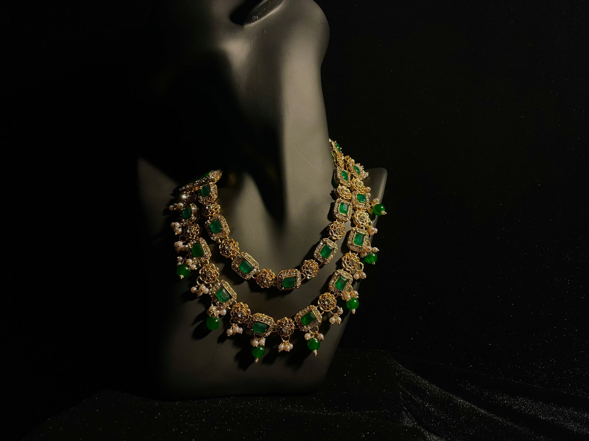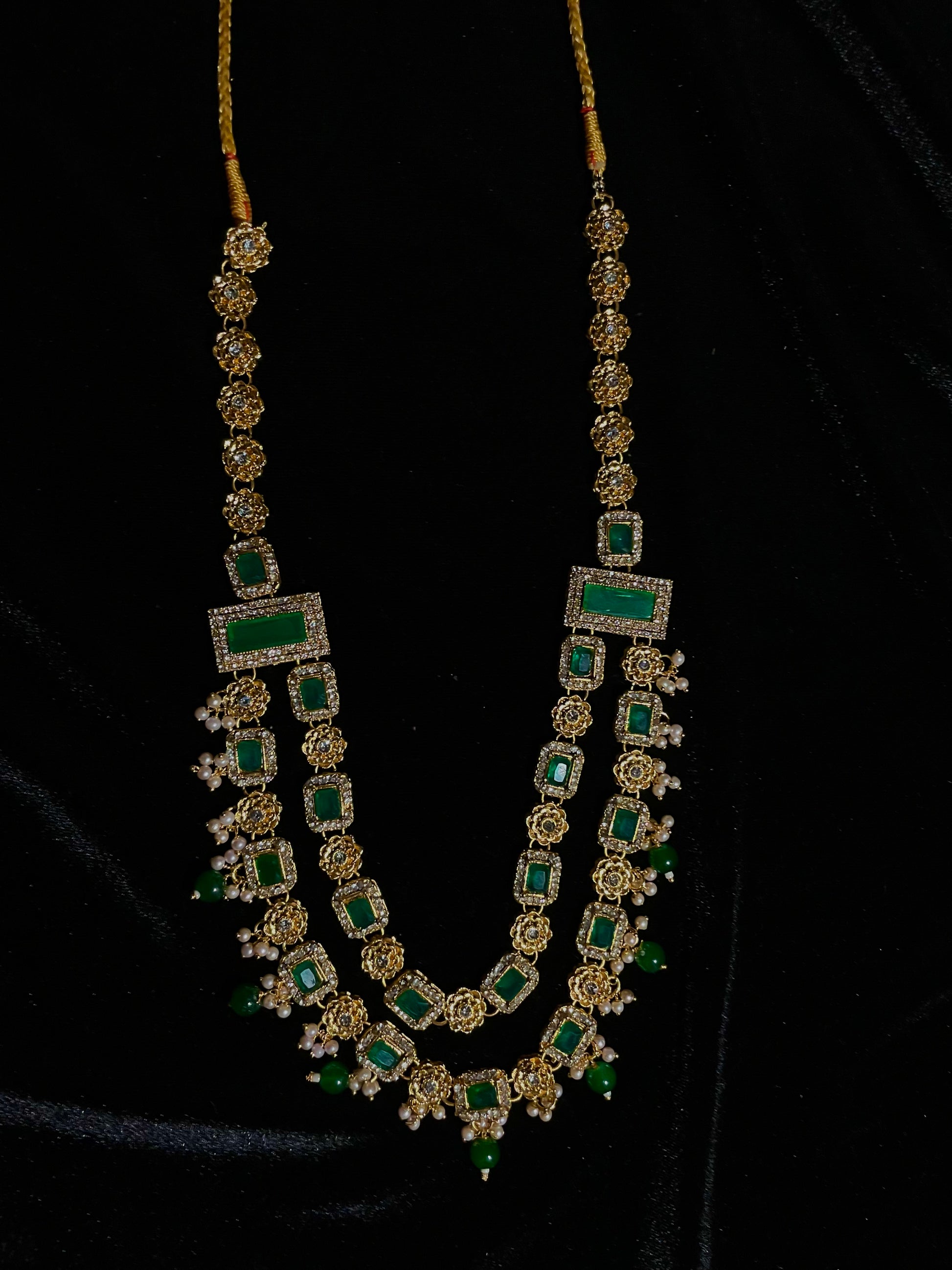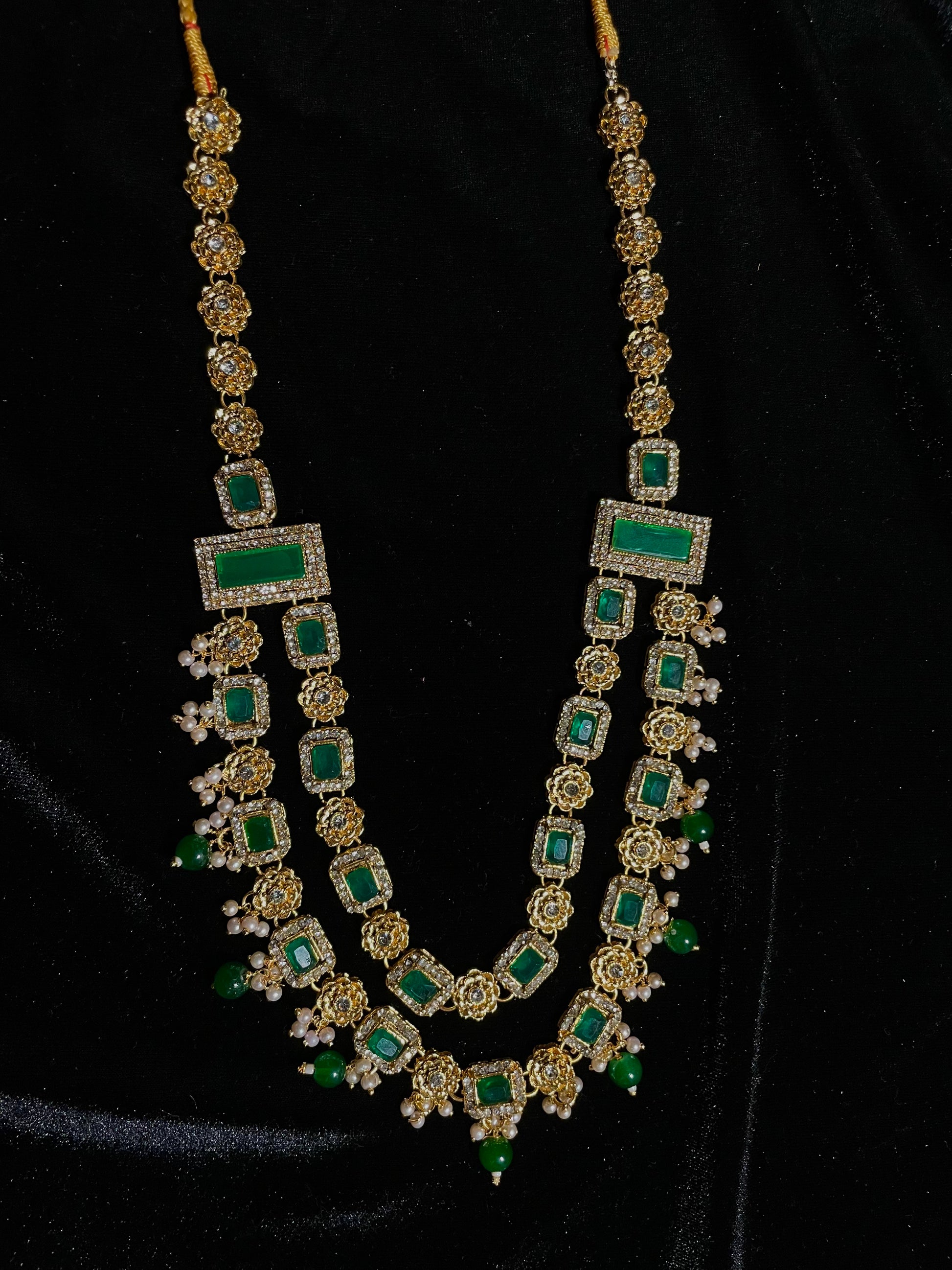 This layered haar necklace, a companion to our Mughal Manzil set, elevates traditional artistry with its double-tiered design. Distinguished by luminous green glass inlays and meticulous detailing. The intricate metalwork frames the verdant inlays, creating a sophisticated piece that honors historical jewelry-making techniques while offering contemporary elegance.