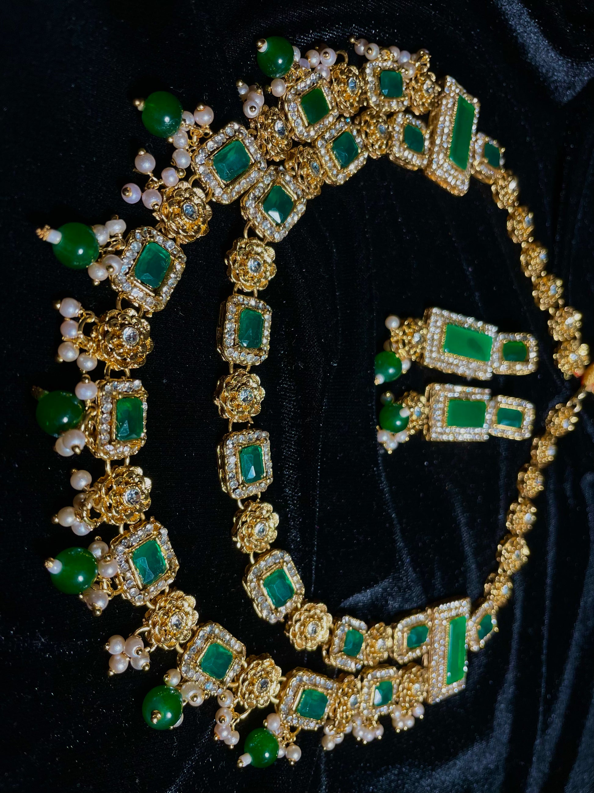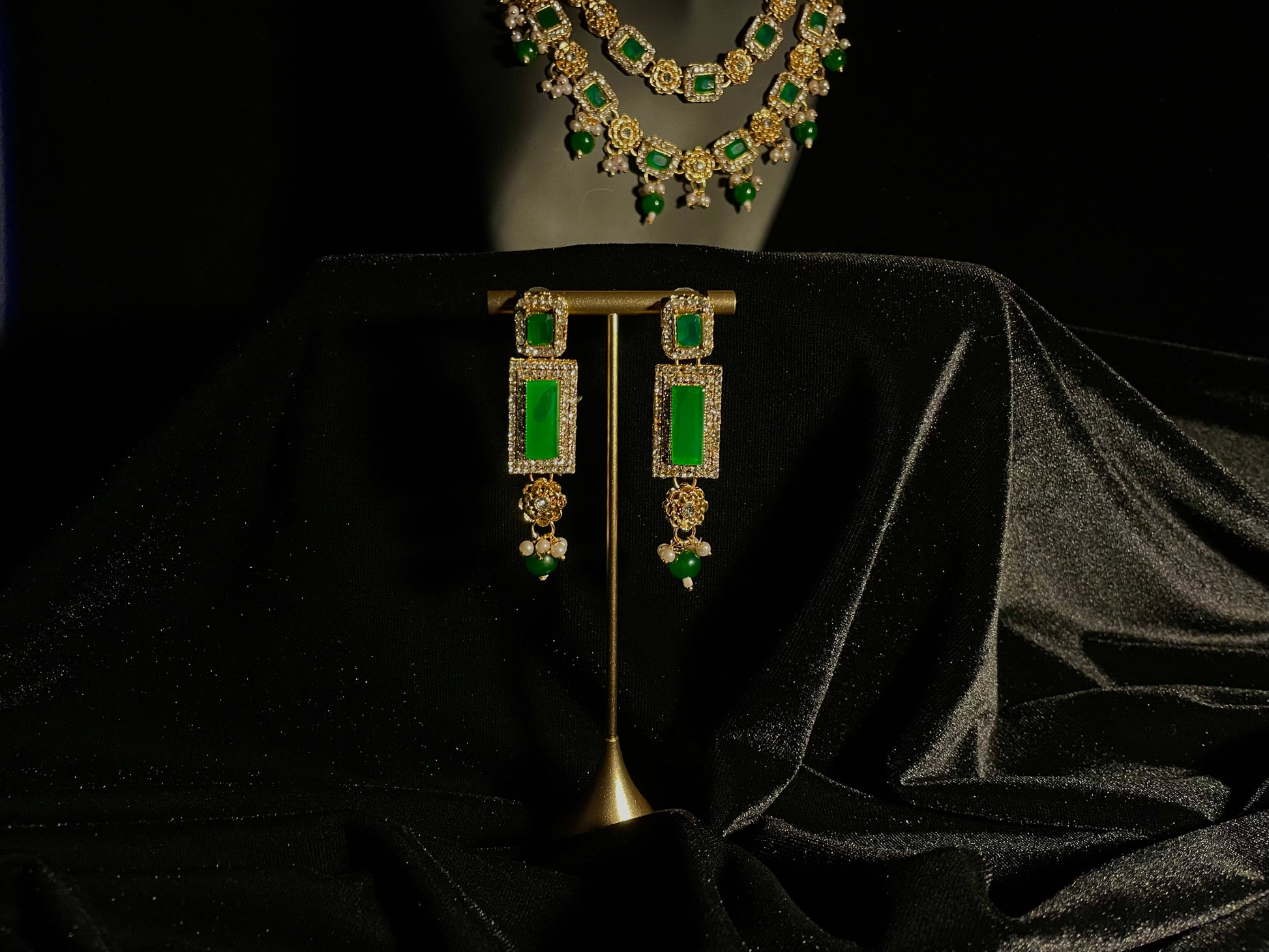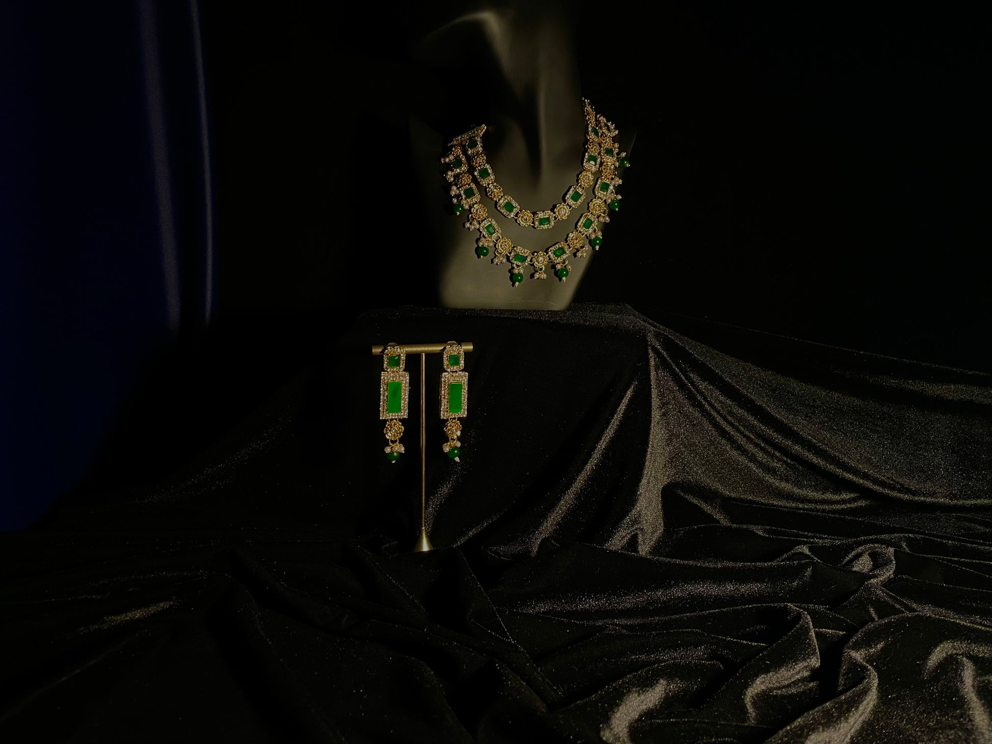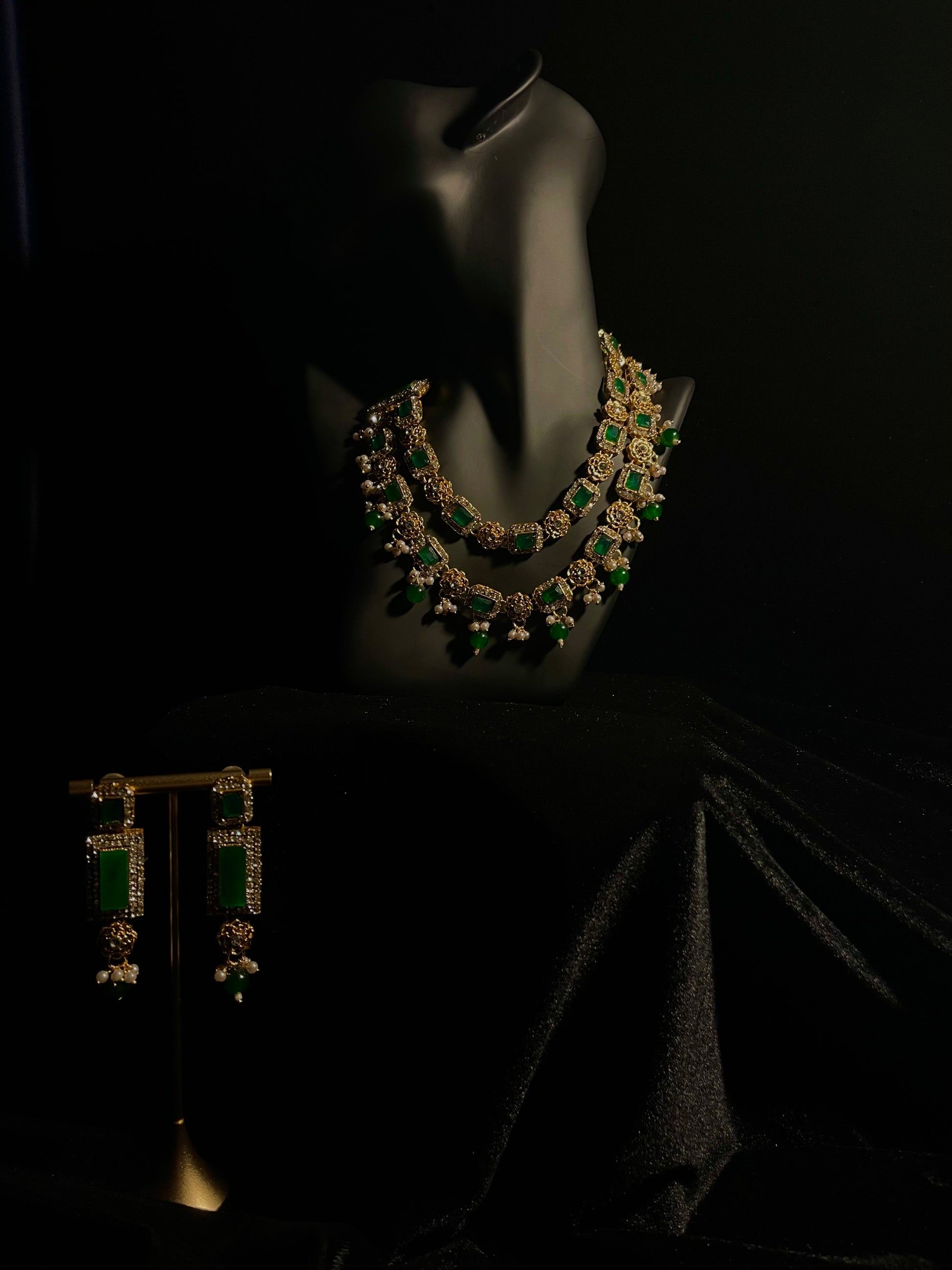 This layered haar necklace, a companion to our Mughal Manzil set, elevates traditional artistry with its double-tiered design. Distinguished by luminous green glass inlays and meticulous detailing. The intricate metalwork frames the verdant inlays, creating a sophisticated piece that honors historical jewelry-making techniques while offering contemporary elegance.