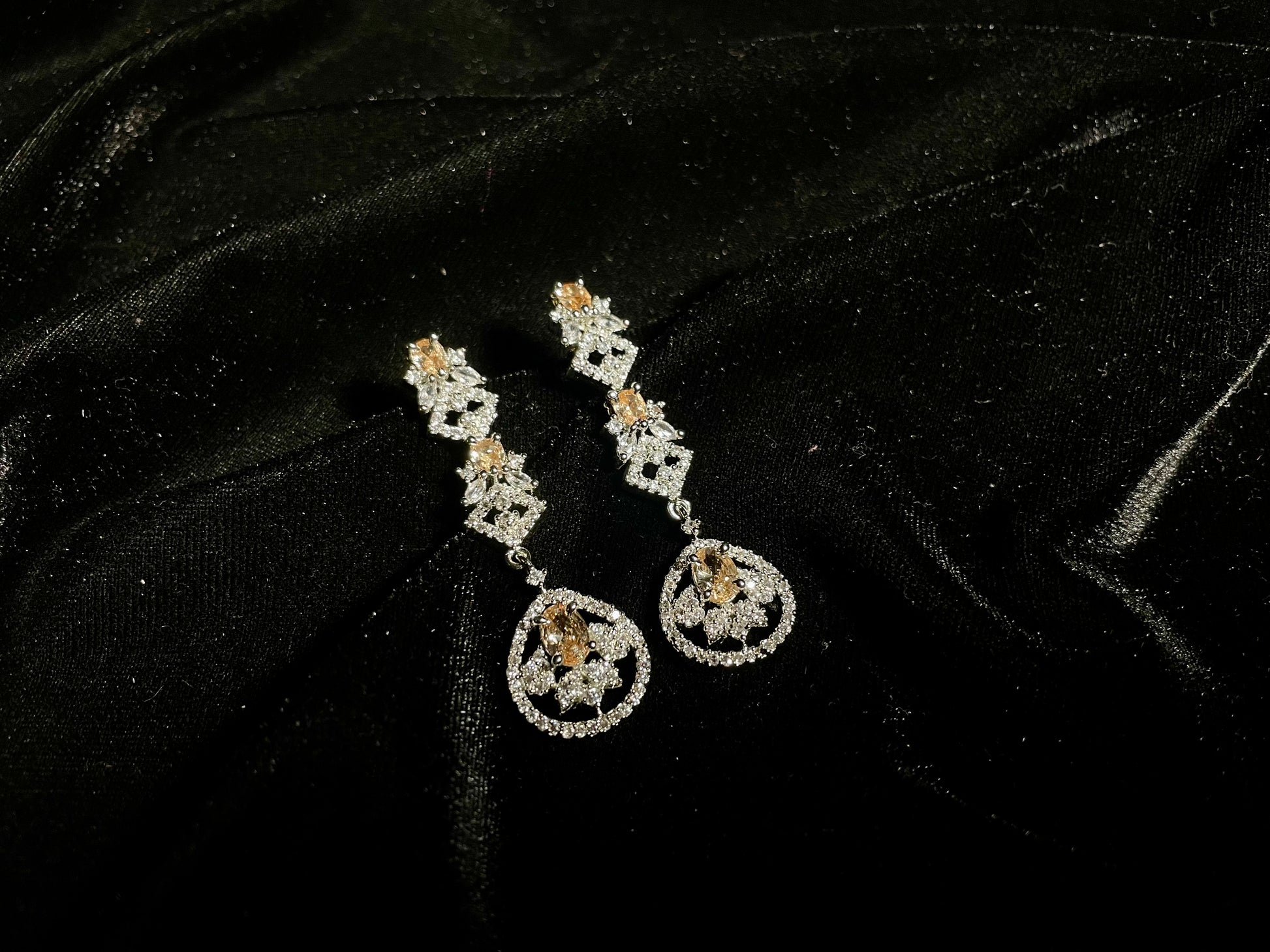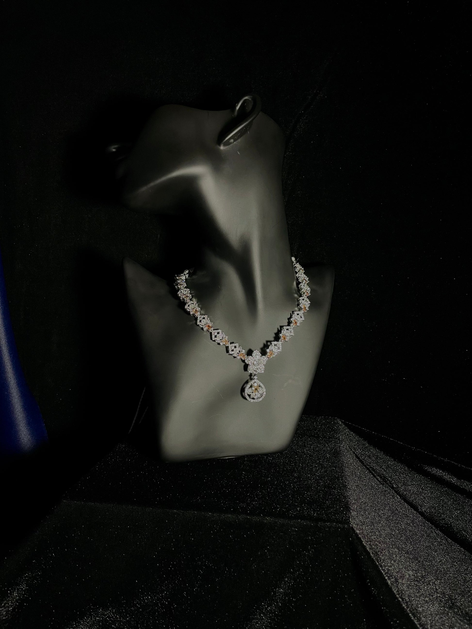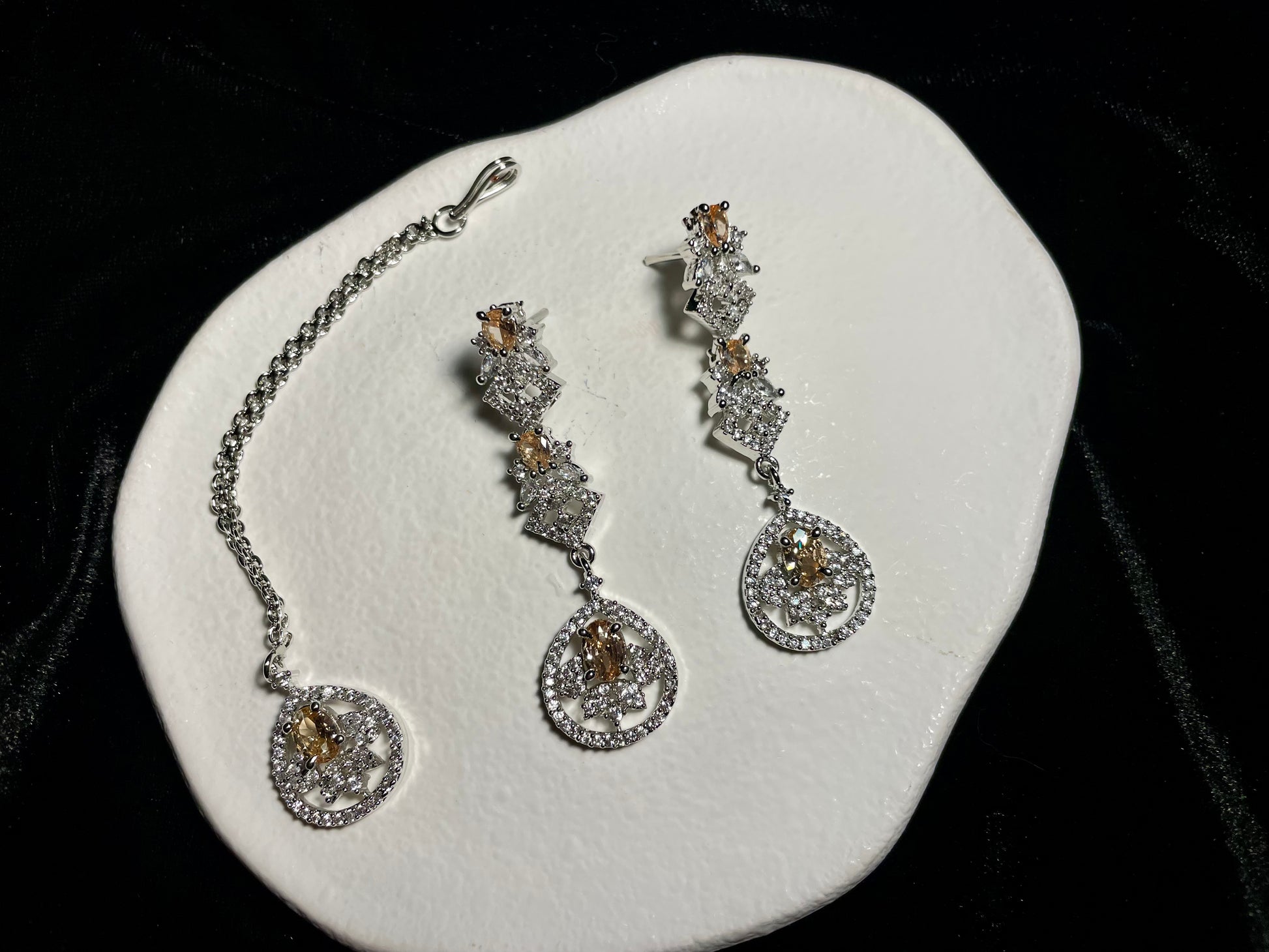 Elevate your style with our exquisite Naqsh-e-gul collection. This sophisticated set features delicate champagne-colored stones perfectly complemented by brilliant zircon diamonds. The intricate detailing captures timeless elegance while the warm champagne hues flatter every skin tone. Make a statement that whispers luxury and commands attention wherever you go.