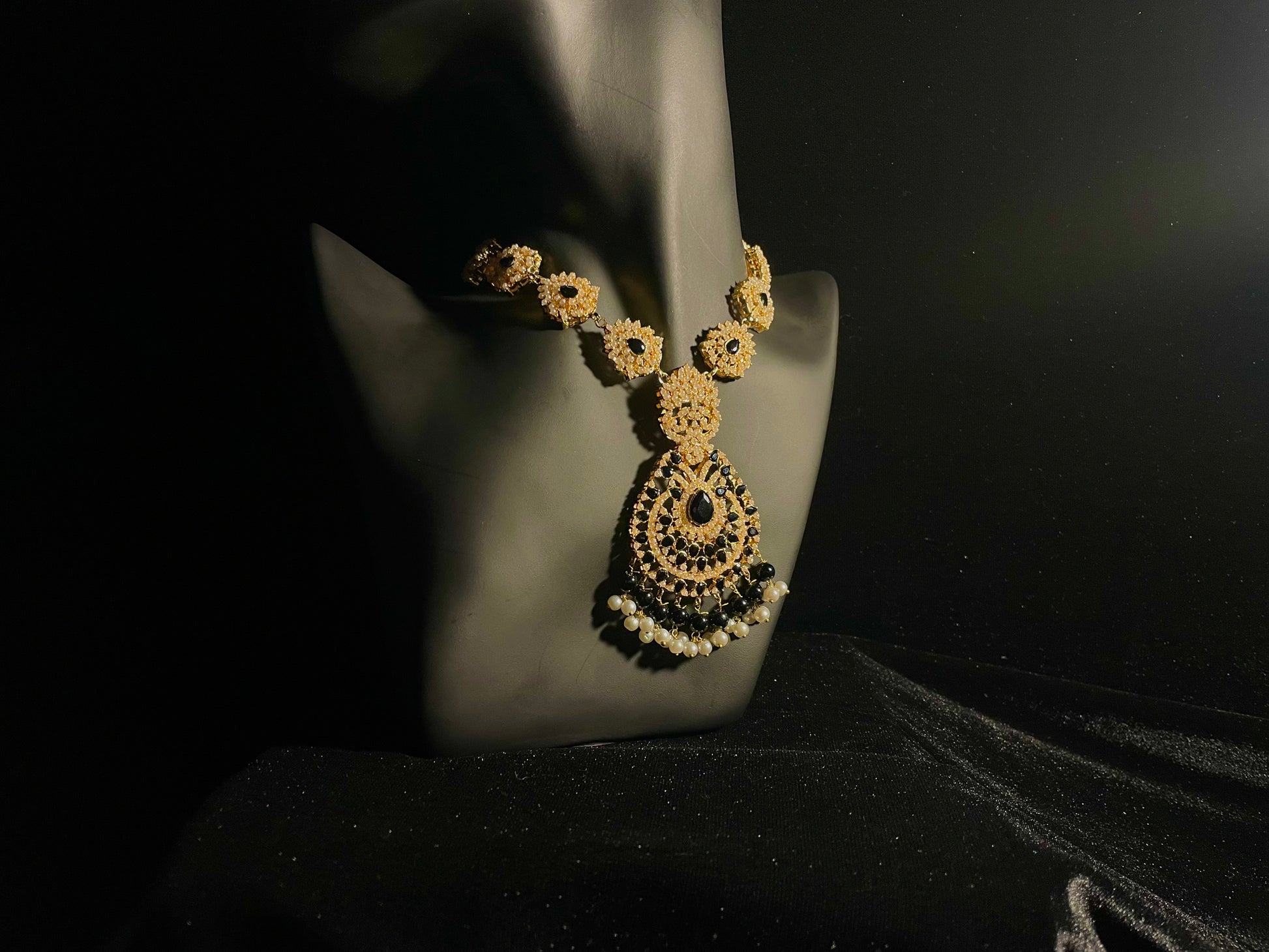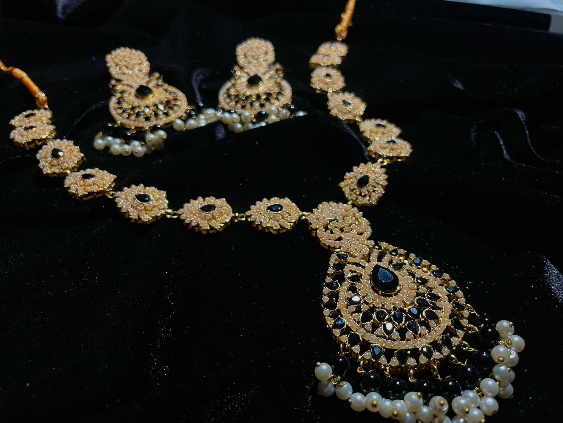 Elevate your ensemble with our Naulakha Jewels statement necklace set. This sophisticated black and gold combination features meticulous craftsmanship with intricate detailing that captures light from every angle. The bold design balances dramatic presence with refined elegance.