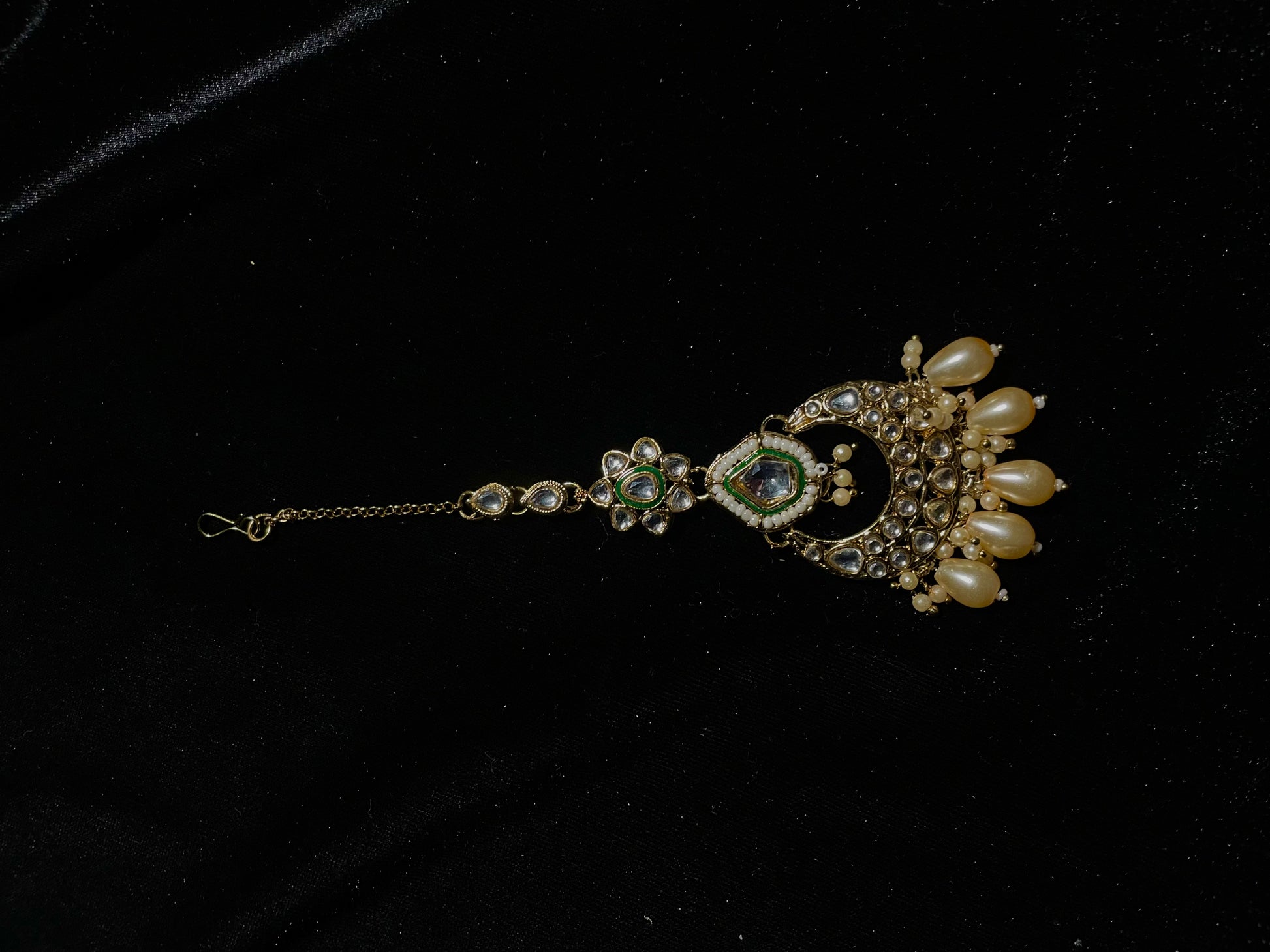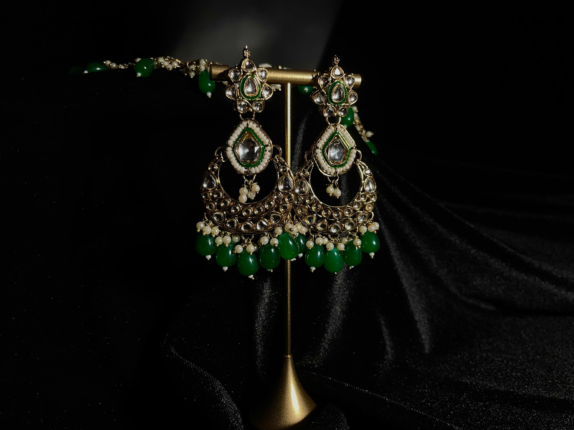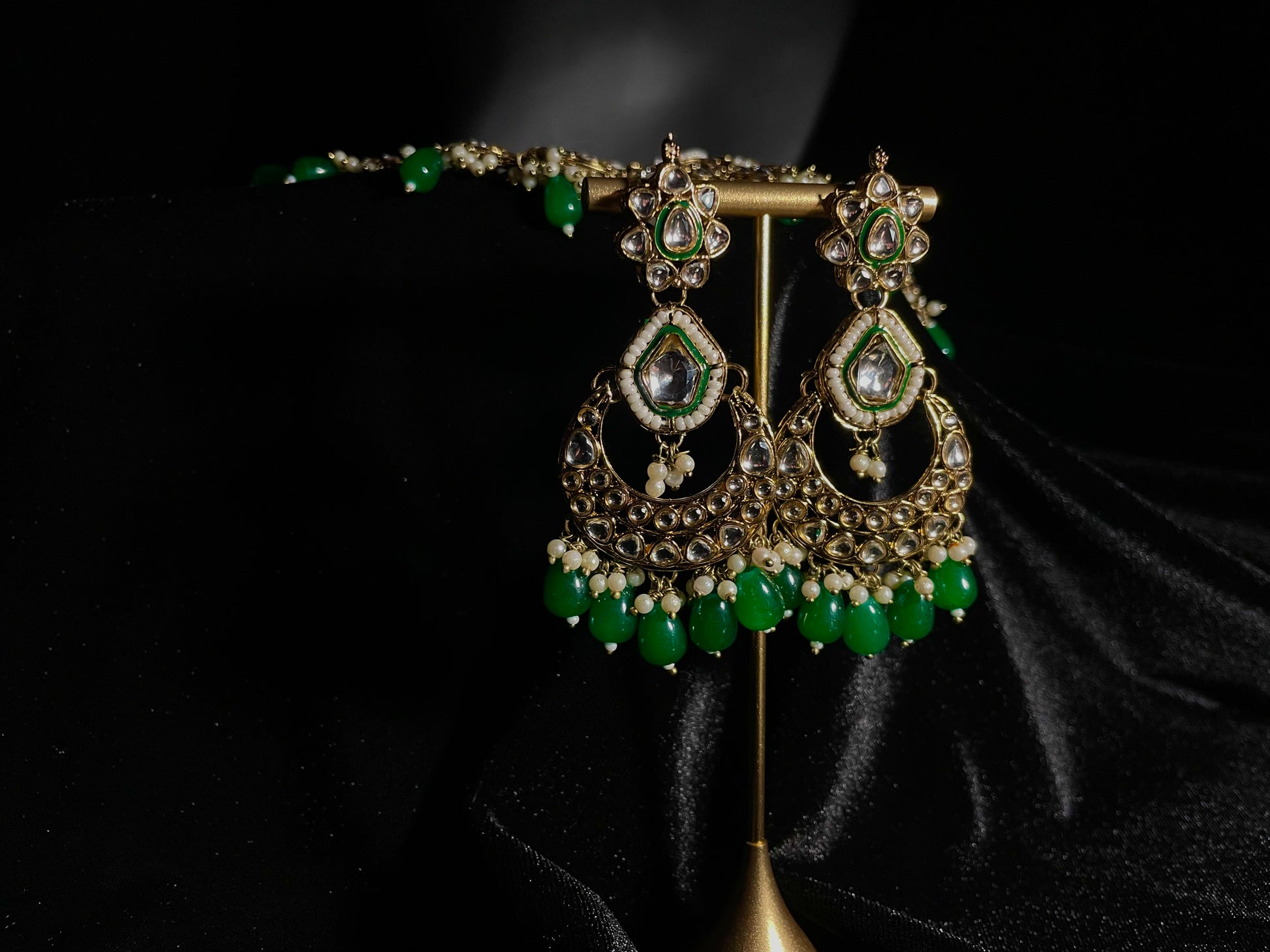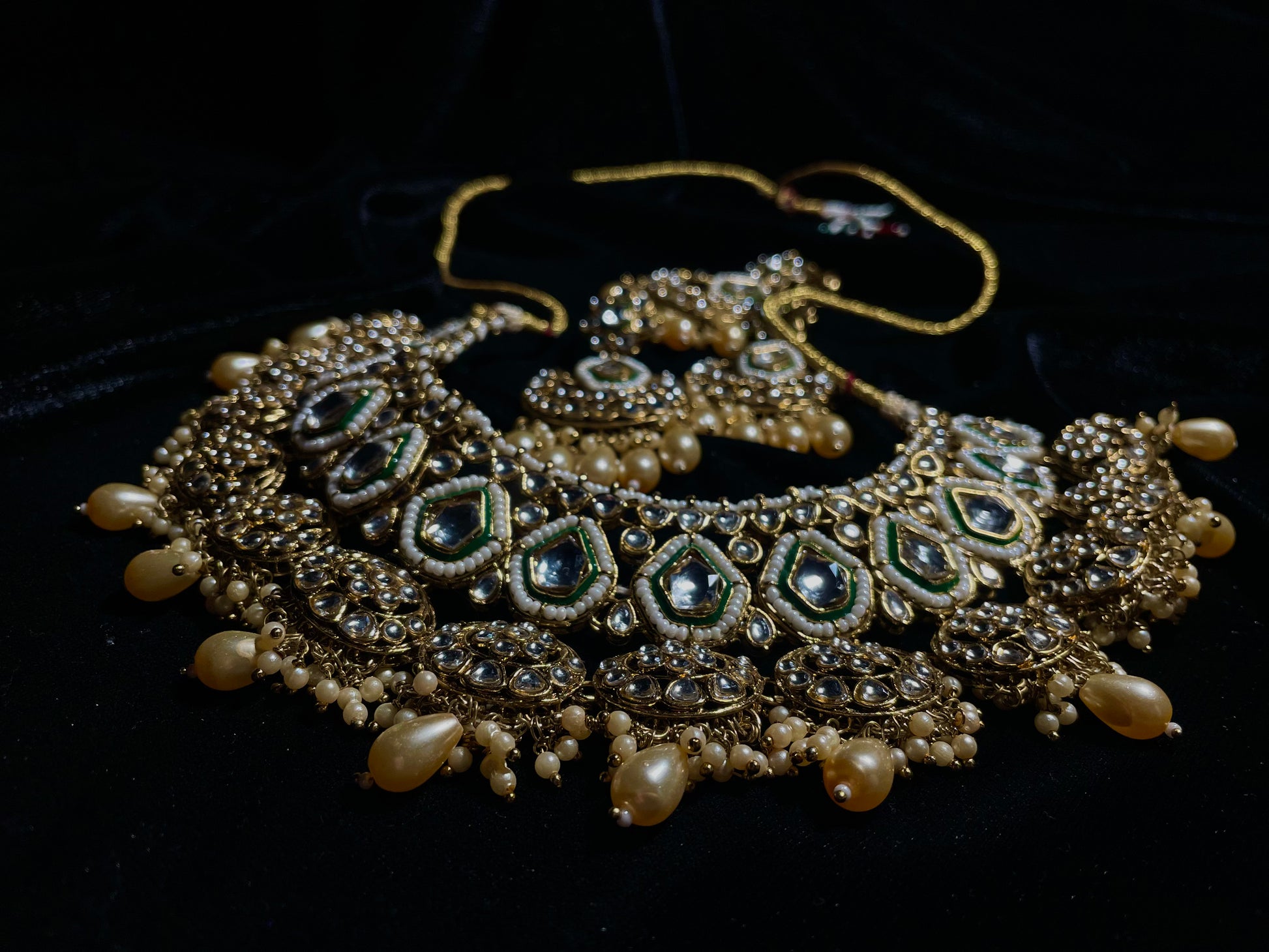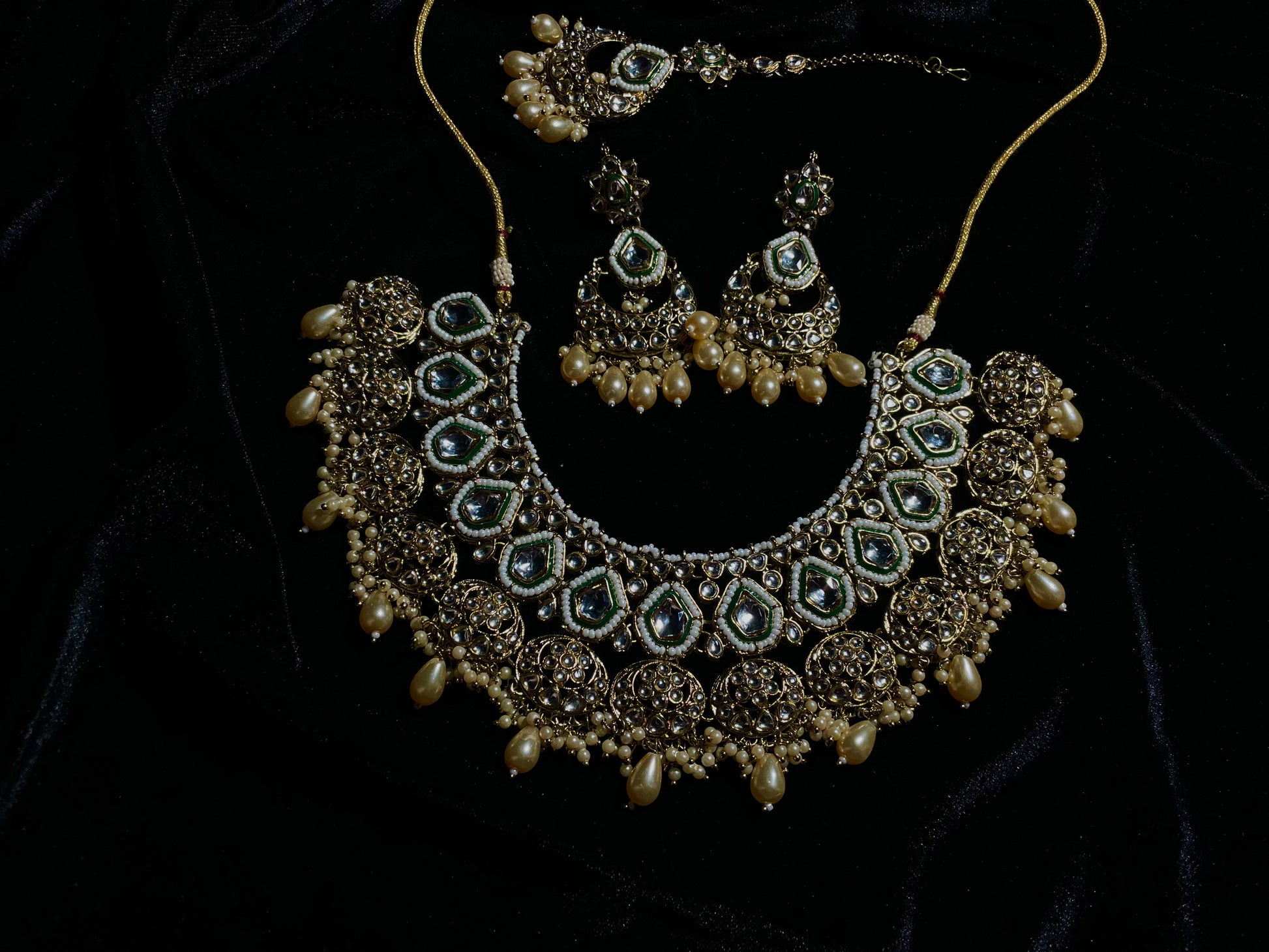 Elevate your ensemble with the Noor-e-mughal statement necklace set, featuring meticulous craftsmanship and exquisite glass inlays. The intricate detailing pays homage to classical Mughal artistry, creating a sophisticated focal point for any attire. Available in two colorways.
