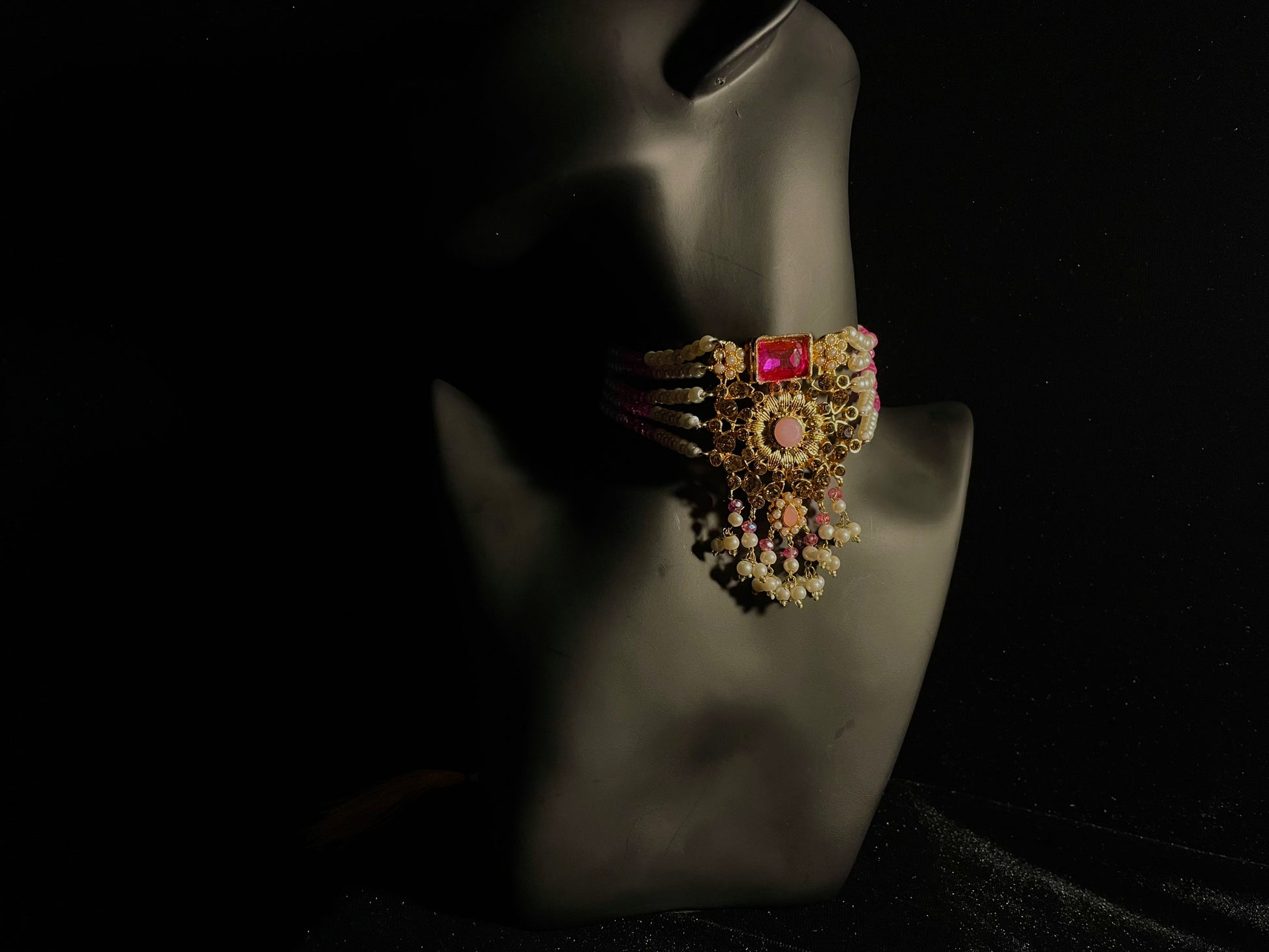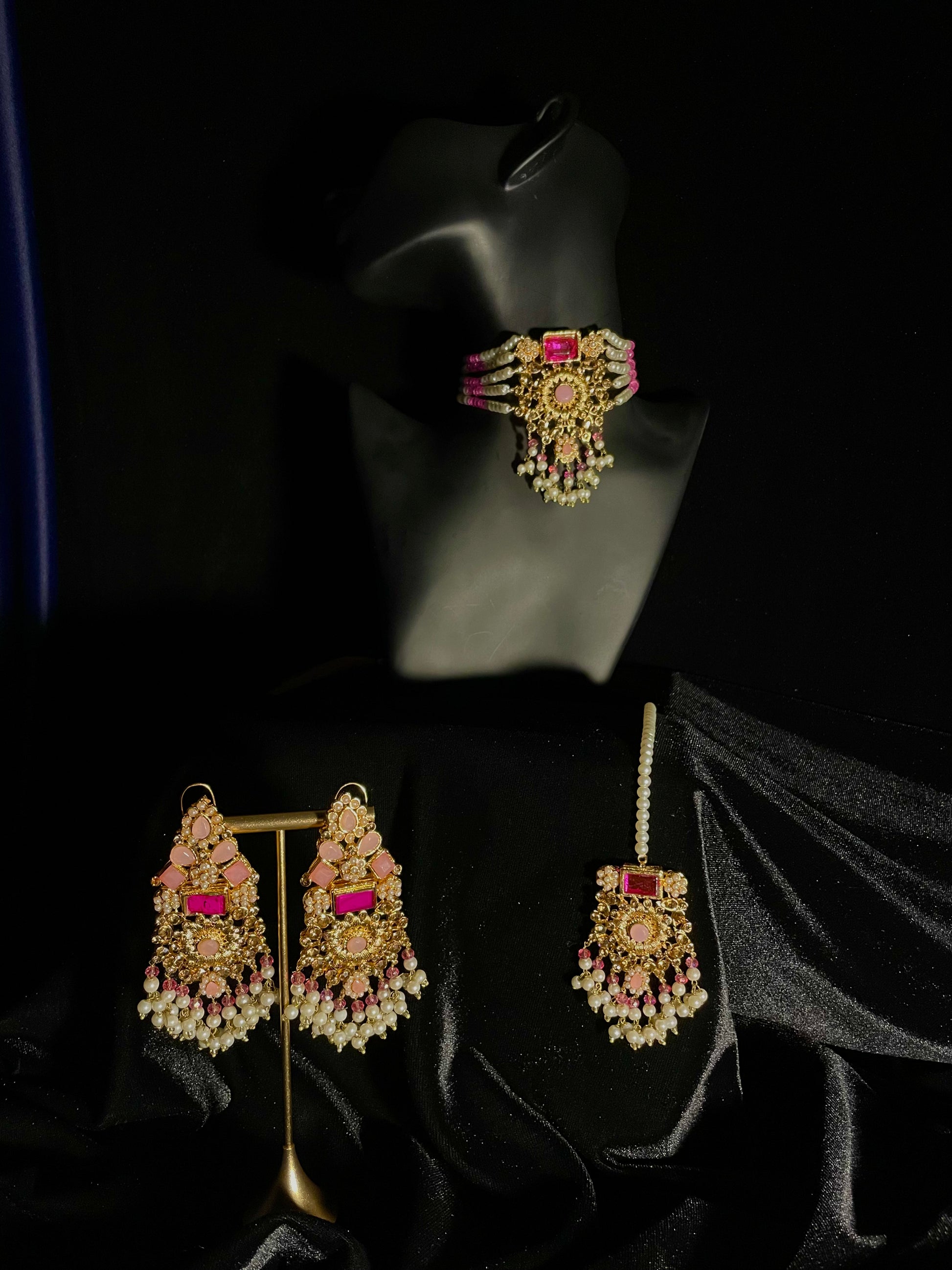 Dazzle everyone with our Roshan Jewels set! This eye-catching collection features a pretty pink choker, bold statement earrings, and a stunning tikka headpiece. Perfect for making heads turn at special occasions when you want to shine. Mix glamour with fun and be the life of the party with this playful statement piece set!