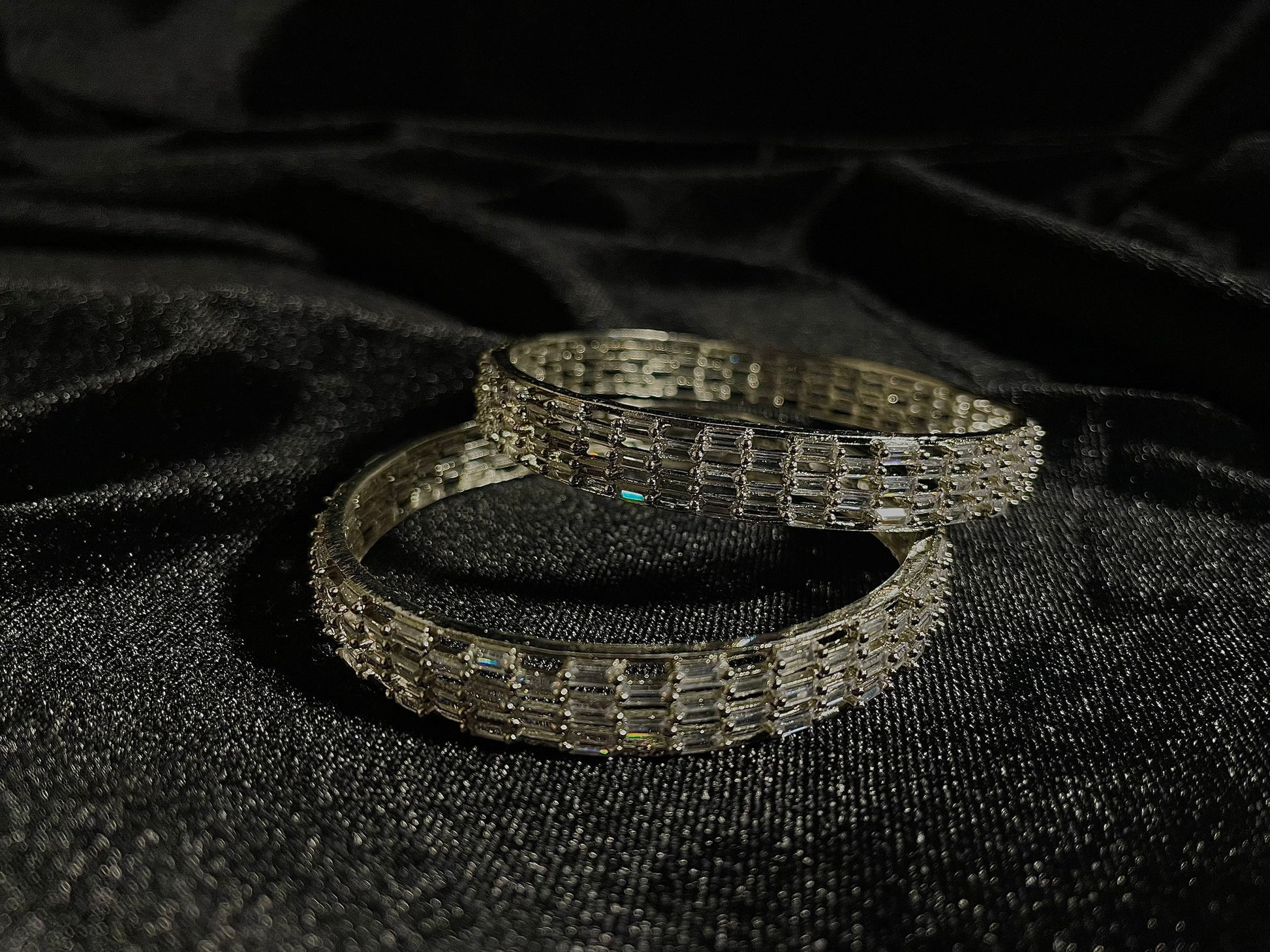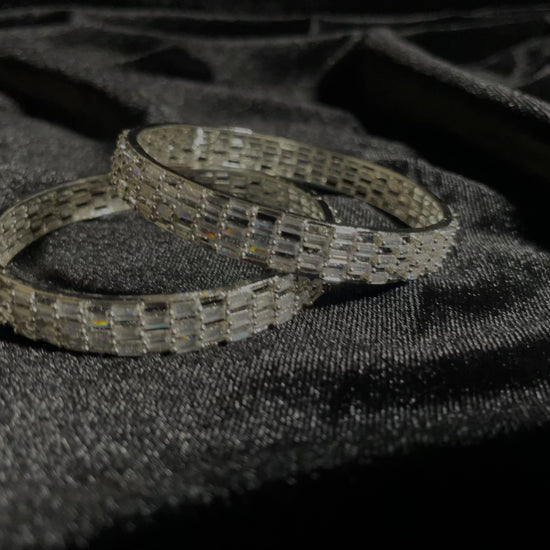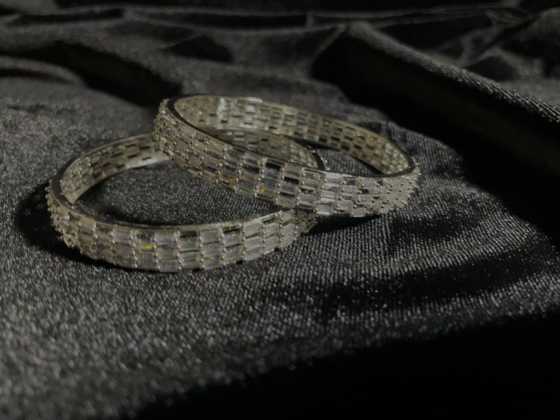 Meticulously crafted Rukhsana Bangles feature silver frames with elegant glass inlays. These timeless accessories blend centuries-old design techniques with contemporary wearability, making them perfect for both special occasions and everyday elegance.