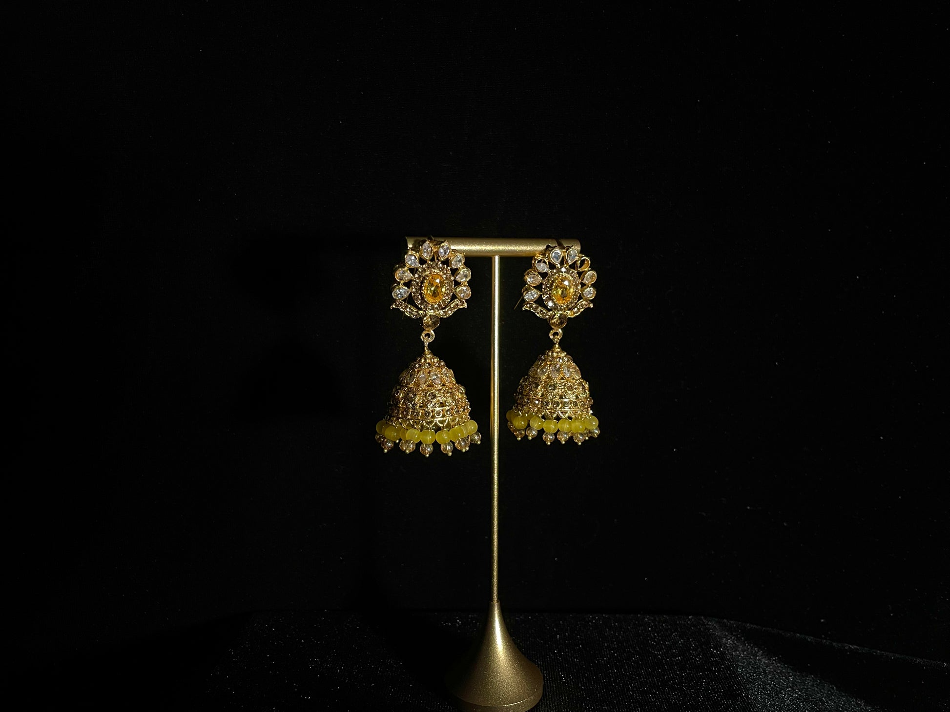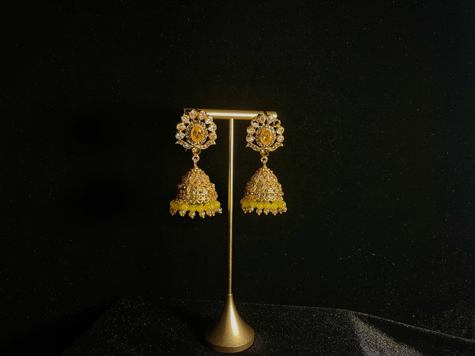 Dazzle and delight with our Saba Earrings! These gorgeous gold jhumkay feature intricate detailing that catches every eye in the room. Adorned with sunny yellow beads that dance with your every move, these statement pieces add a pop of playful elegance to any outfit. Perfect for celebrations or adding sparkle to your everyday look!
