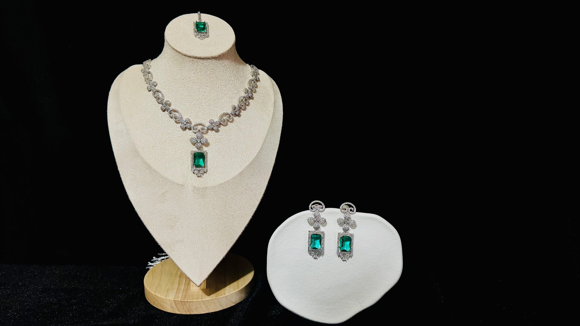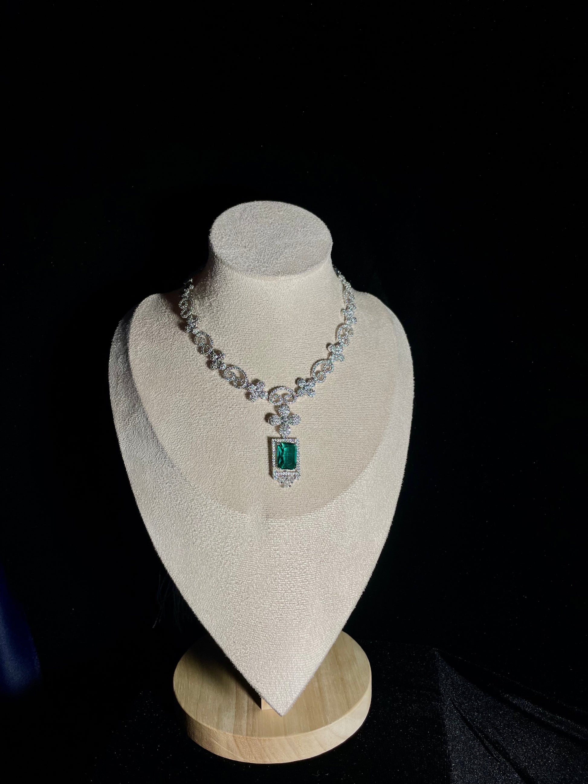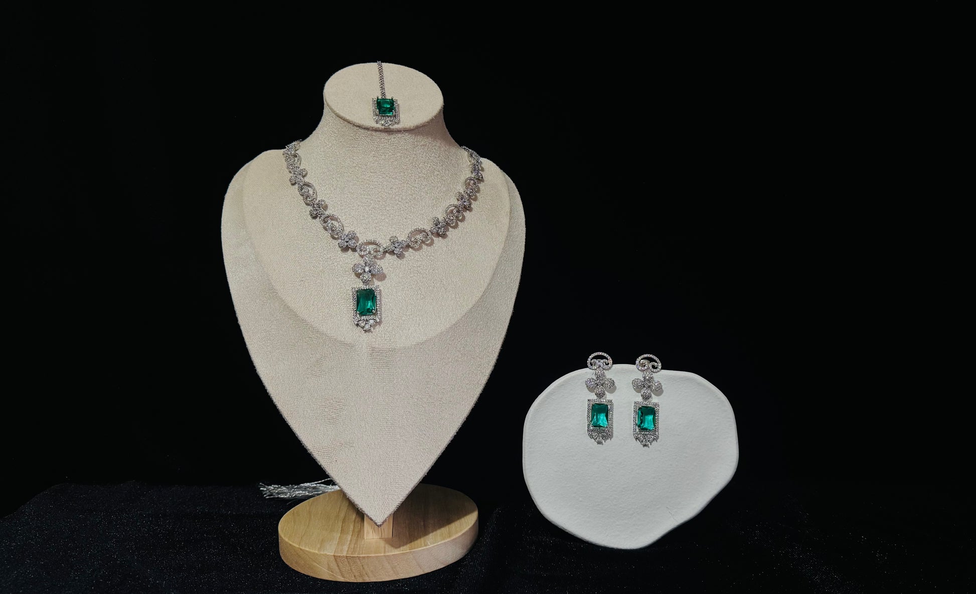 Immerse yourself in the enchanting allure of Sabz-e-bahaar, where a captivating teal stone takes center stage, brilliantly encased by dazzling zircon diamonds. This elegant masterpiece showcases intricate detailing that speaks of unparalleled craftsmanship. The perfect statement piece to elevate your style and draw admiring glances wherever you go.