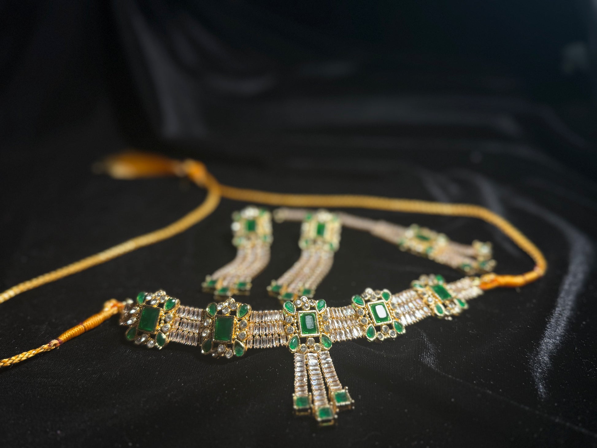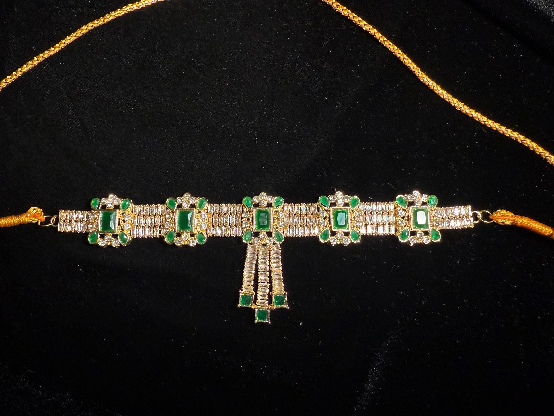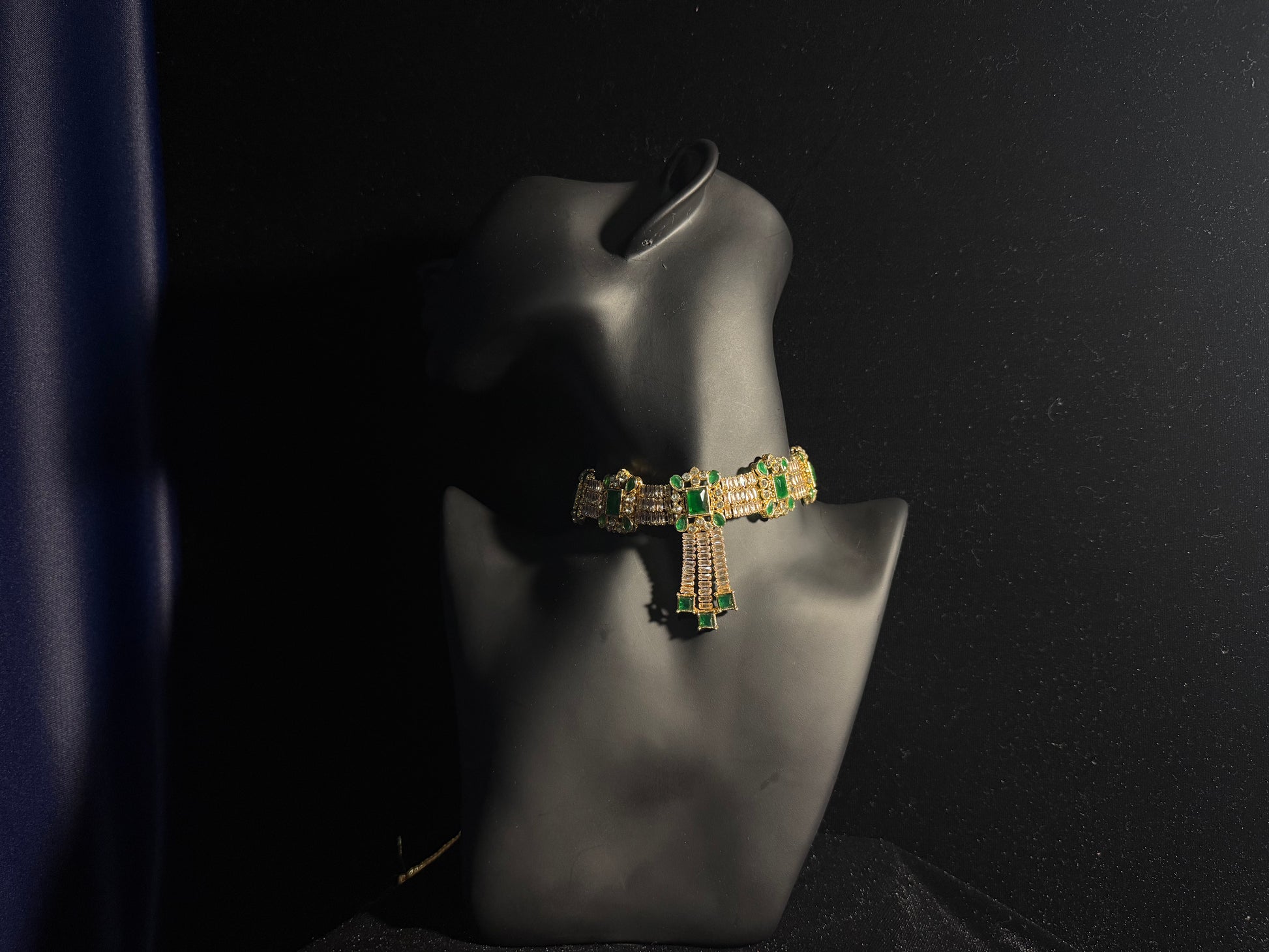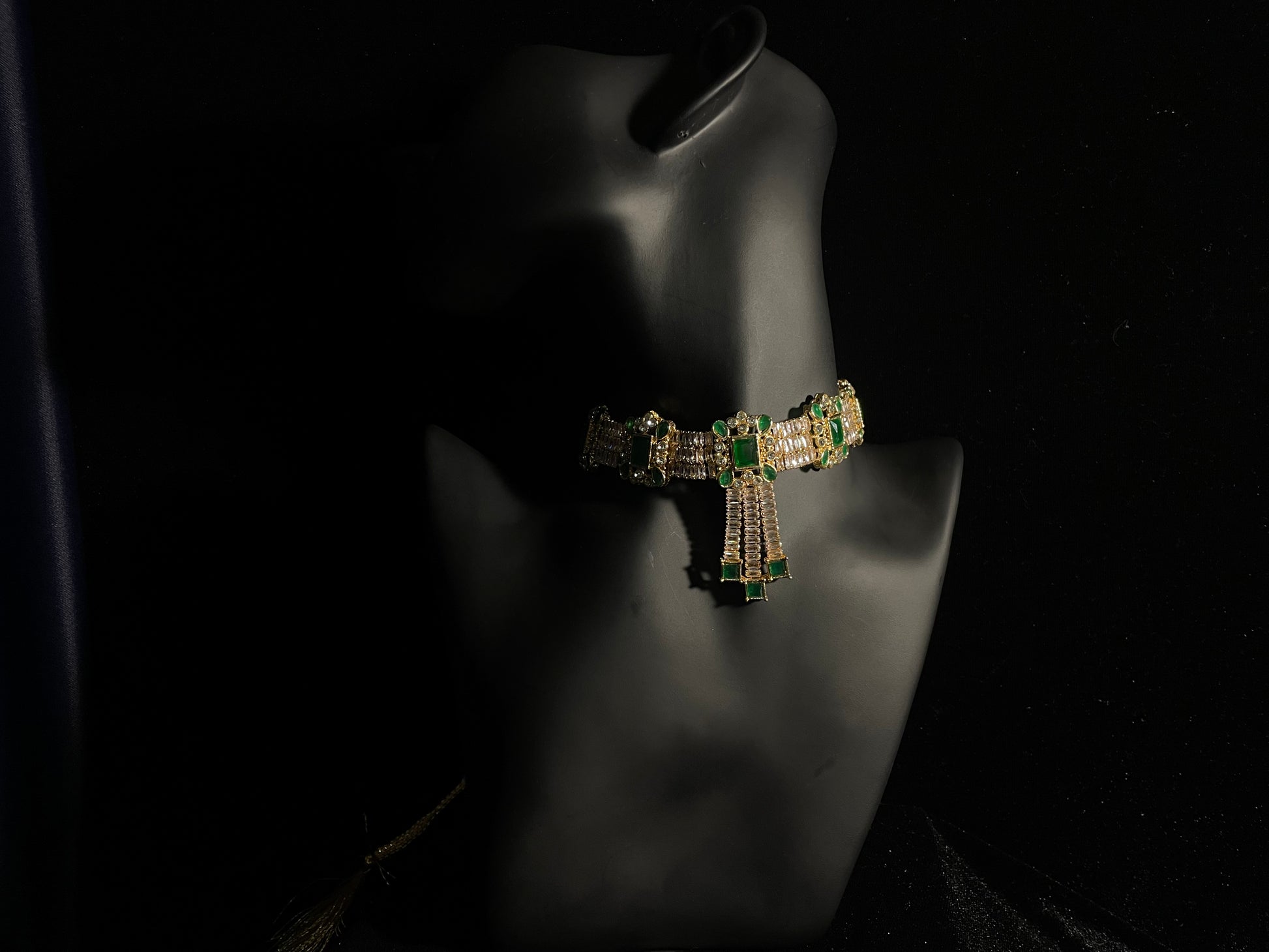 This Sabz Taaj choker showcases exquisite craftsmanship with its vibrant green palette and glass inlays. The interplay of light across the translucent elements creates a subtle luminescence. A distinguished accessory that complements traditional attire.