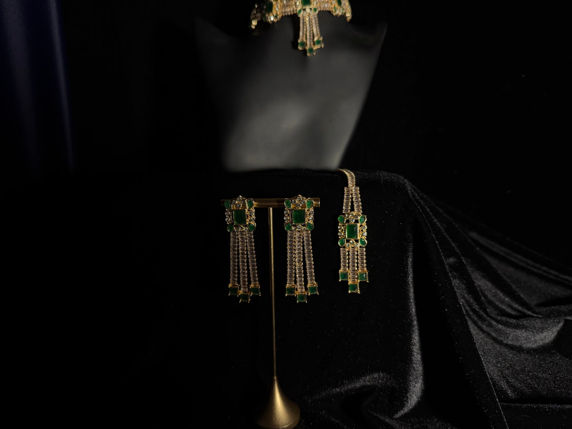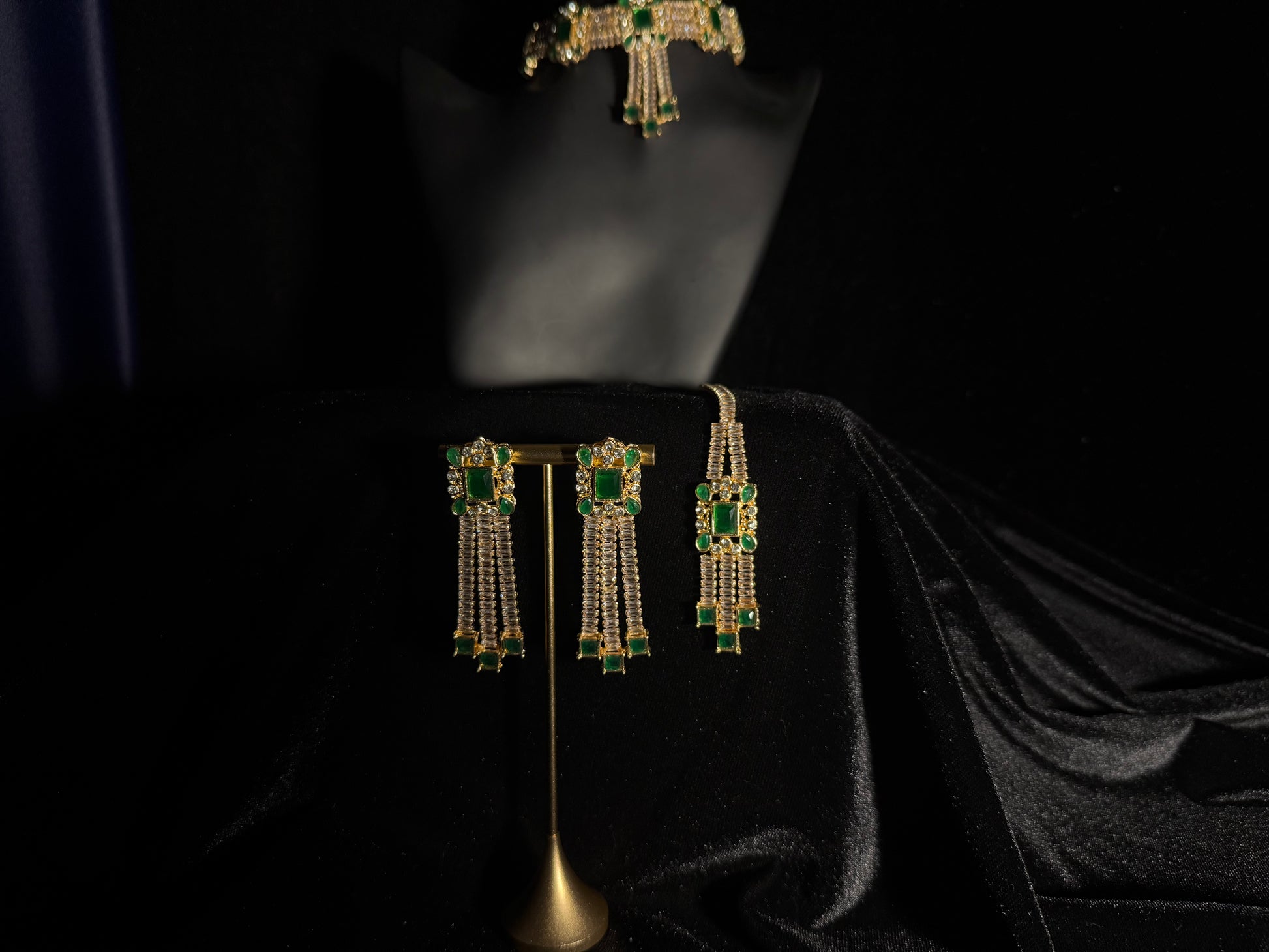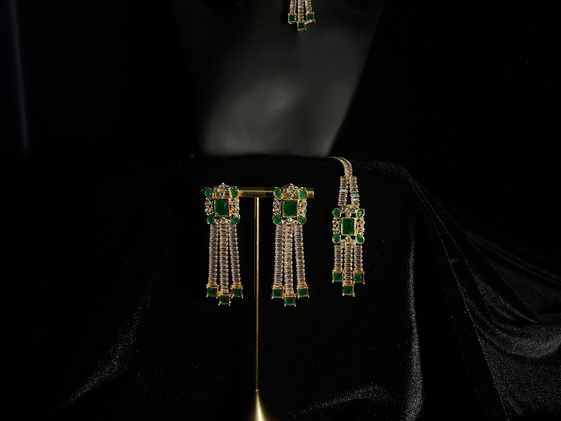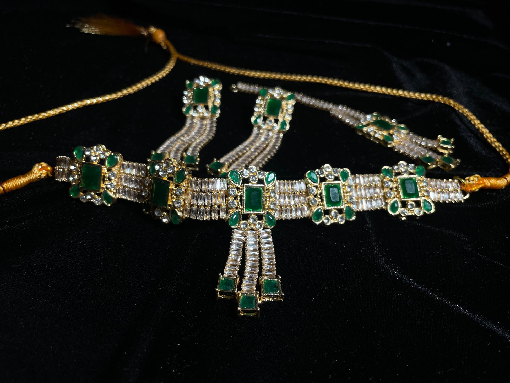 This Sabz Taaj choker showcases exquisite craftsmanship with its vibrant green palette and glass inlays. The interplay of light across the translucent elements creates a subtle luminescence. A distinguished accessory that complements traditional attire.