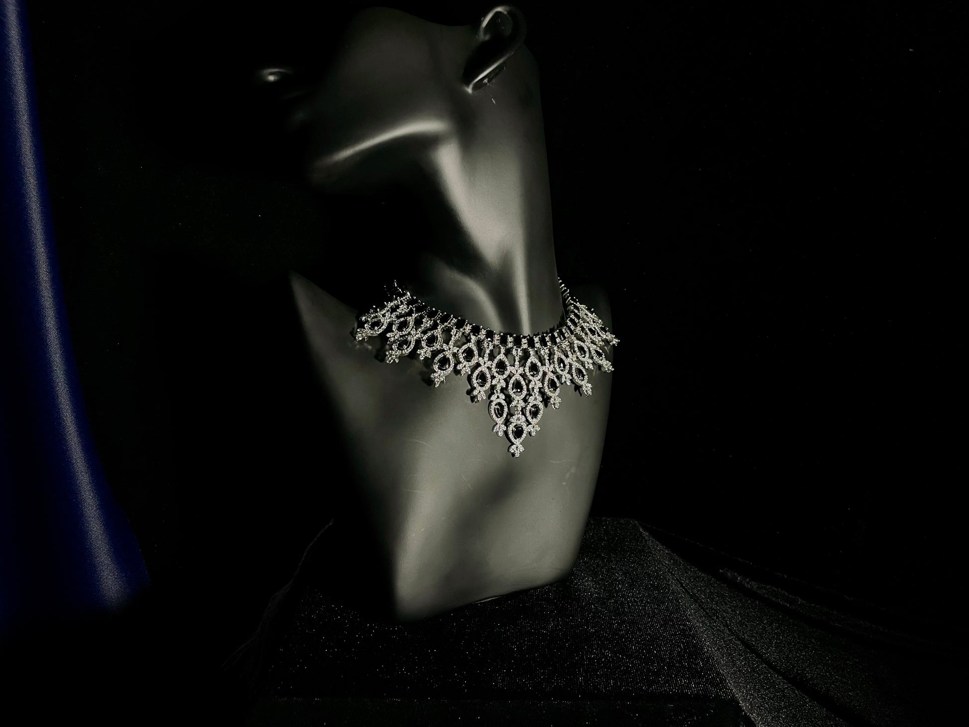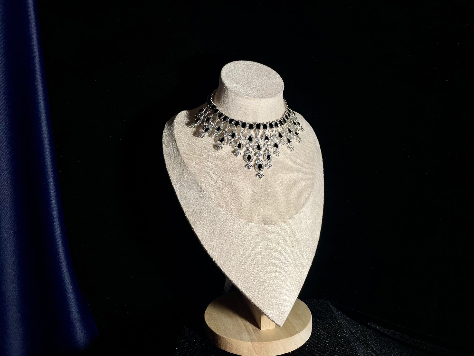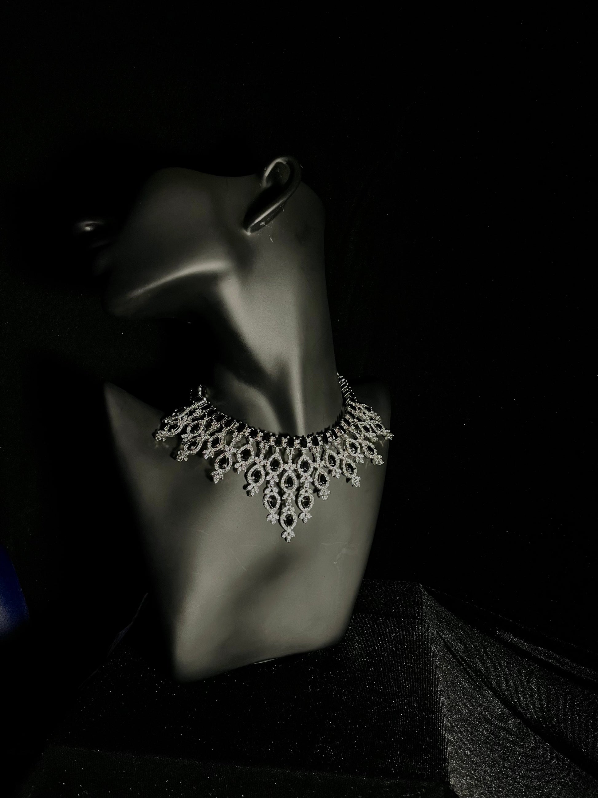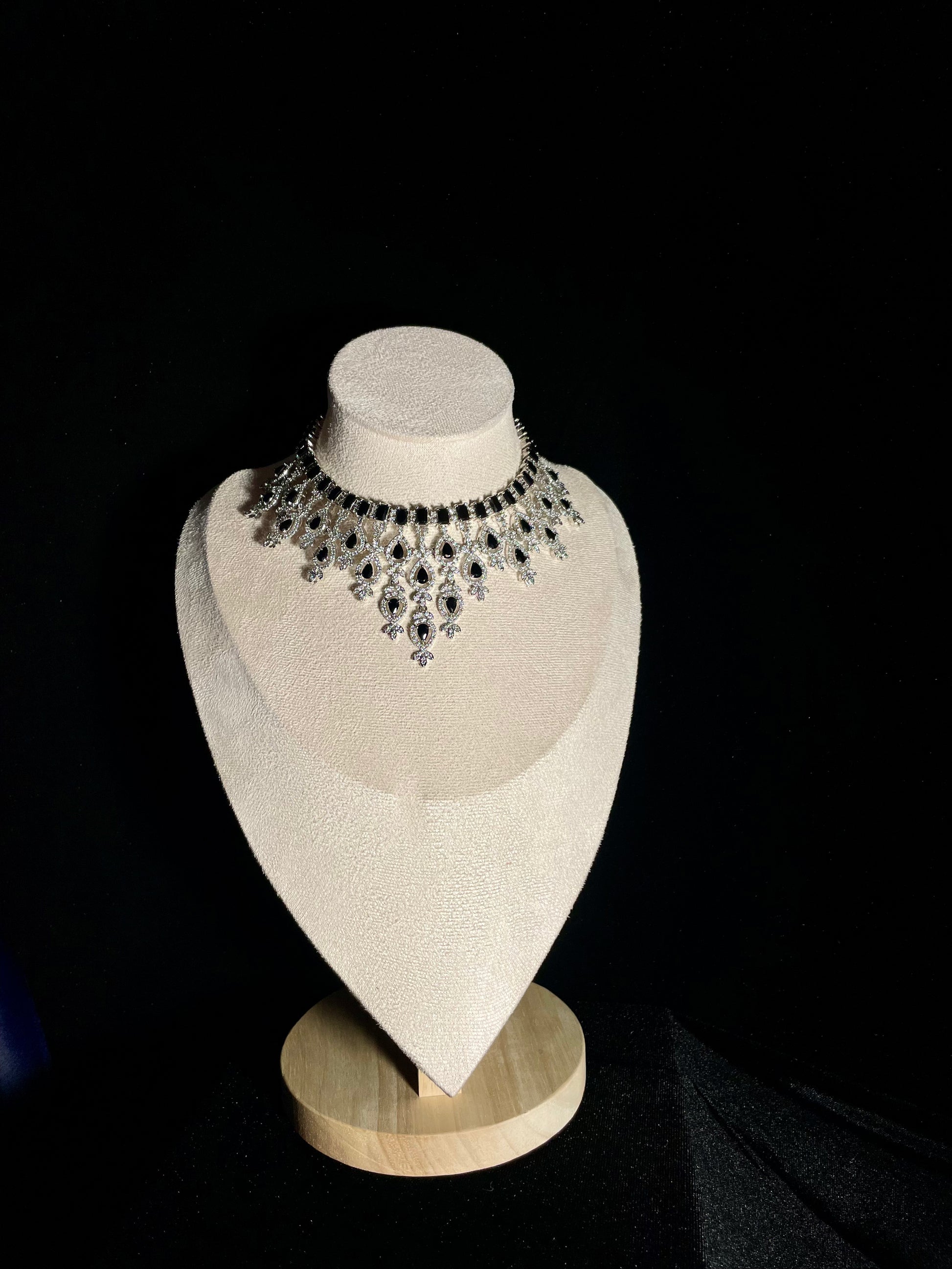 Elevate your evening attire with our exquisite "Shaam-e-firaaq" choker set. This stunning piece combines luxurious black stones with dazzling zircon accents that catch the light with every movement. Perfect for special occasions, this statement set will transform your look from ordinary to extraordinary. Don't just accessorize—make an unforgettable impression.