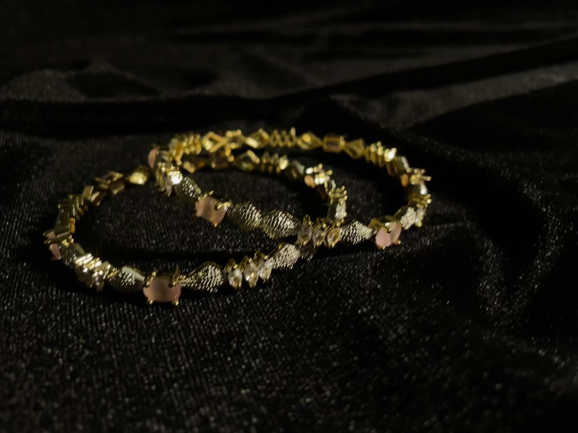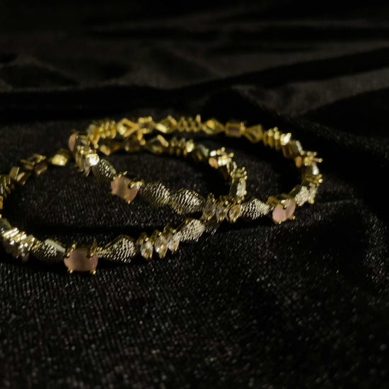 Shams Bangles feature a sophisticated pink and silver color palette. The elegant design combines durability with refined aesthetics, making them suitable for both formal occasions and everyday wear. The contrasting tones create a versatile accessory that complements various outfits while maintaining a distinctly luxurious appearance.