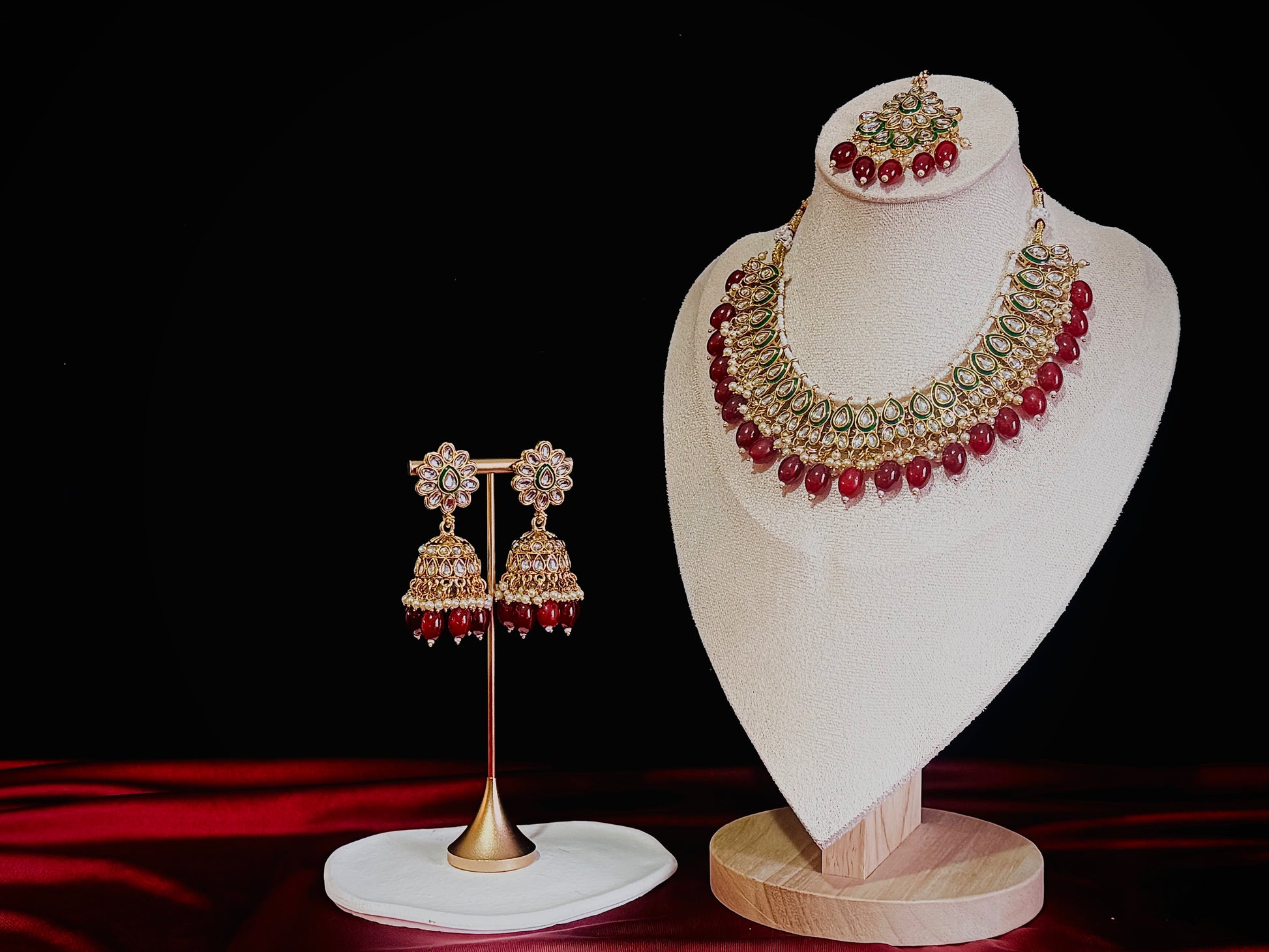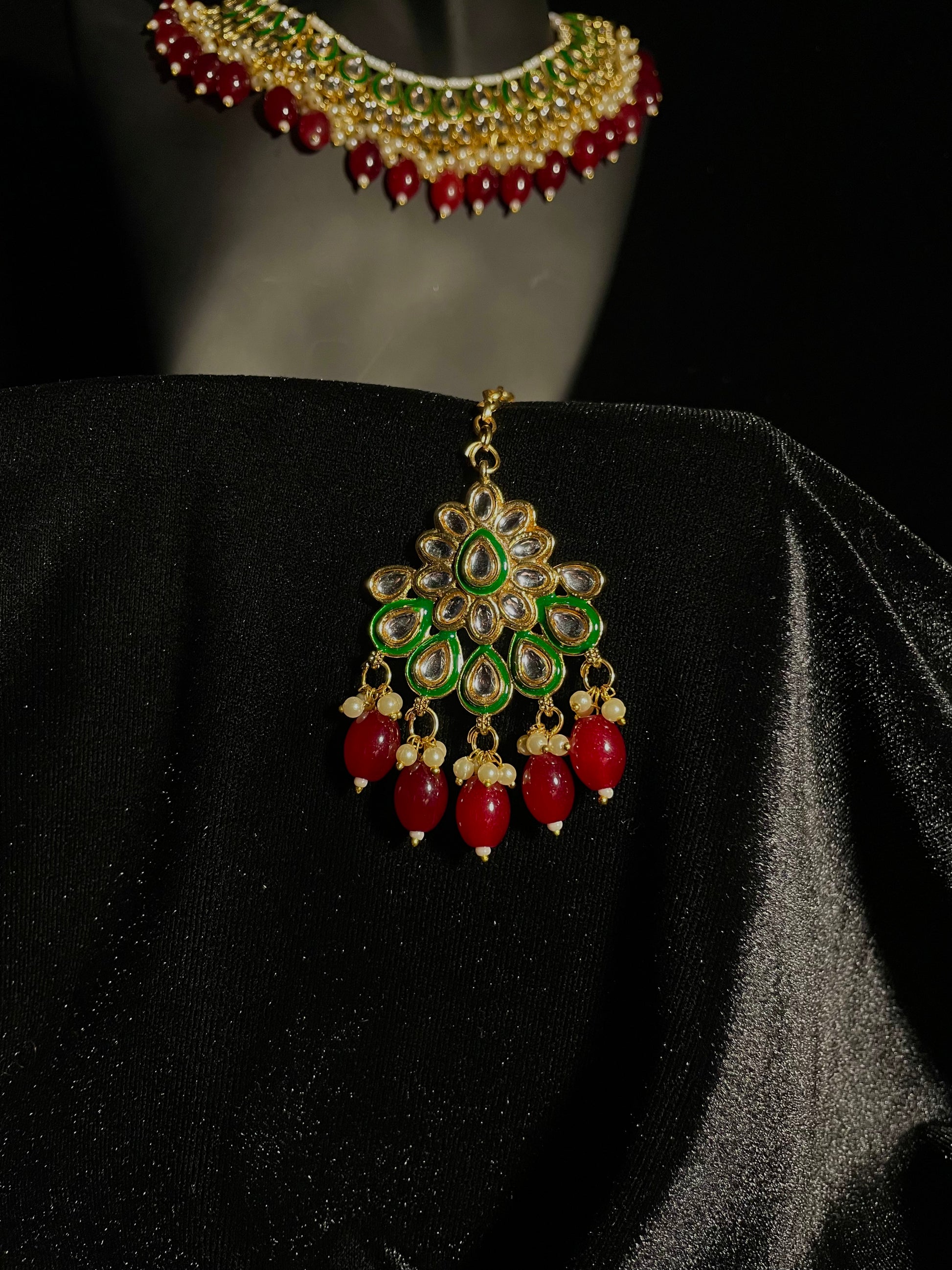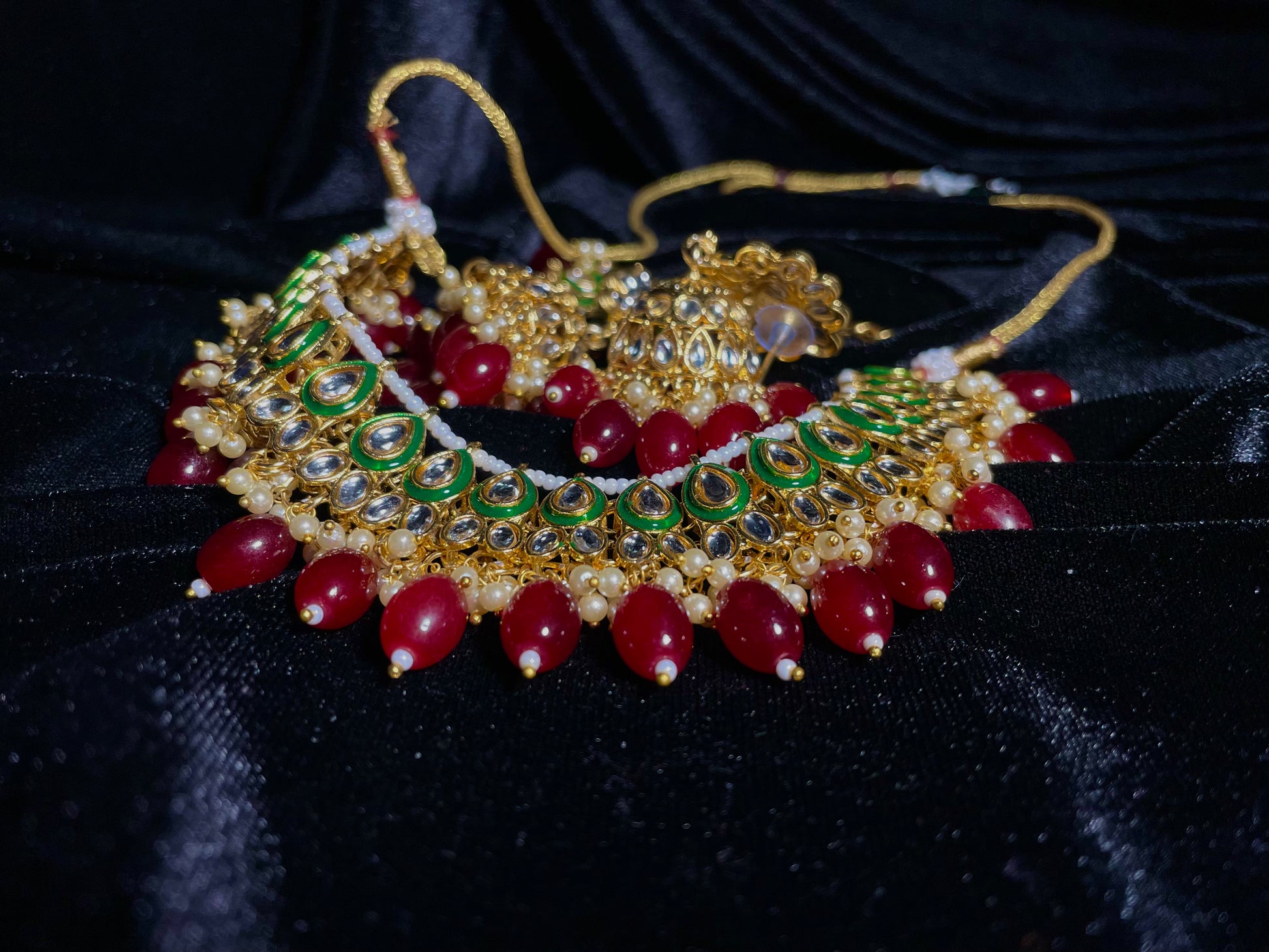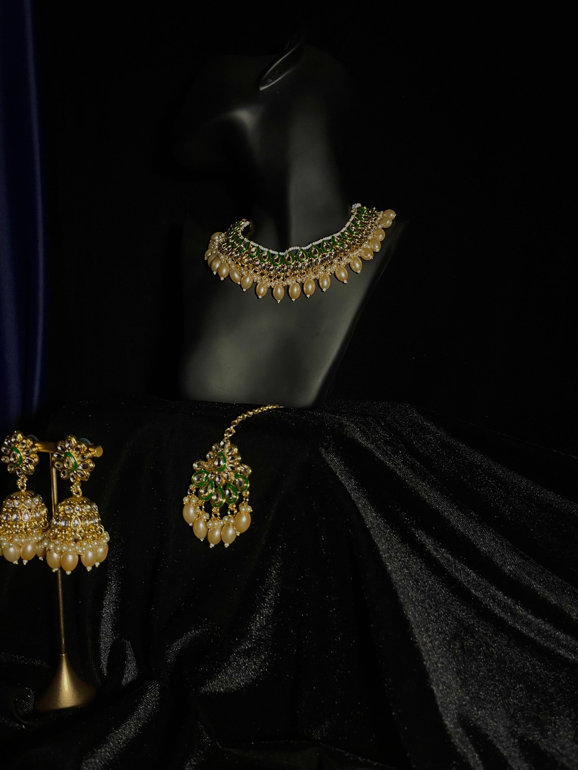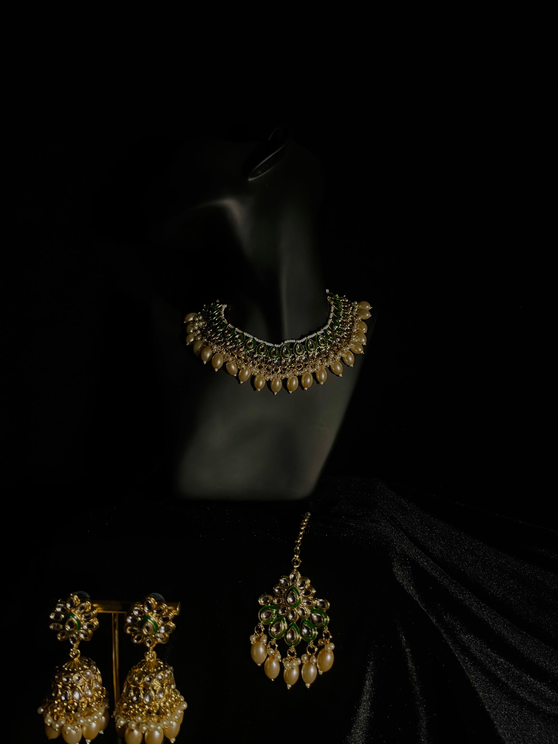 Elevate your elegance with Taj-e-Zevar, a breathtaking kundan style jewelry set that exudes royal charm. The mesmerizing glass inlays catch light beautifully while dangling beads create movement and drama. Available in two stunning colors, this exquisite set transforms any outfit into a statement of luxury and sophistication.