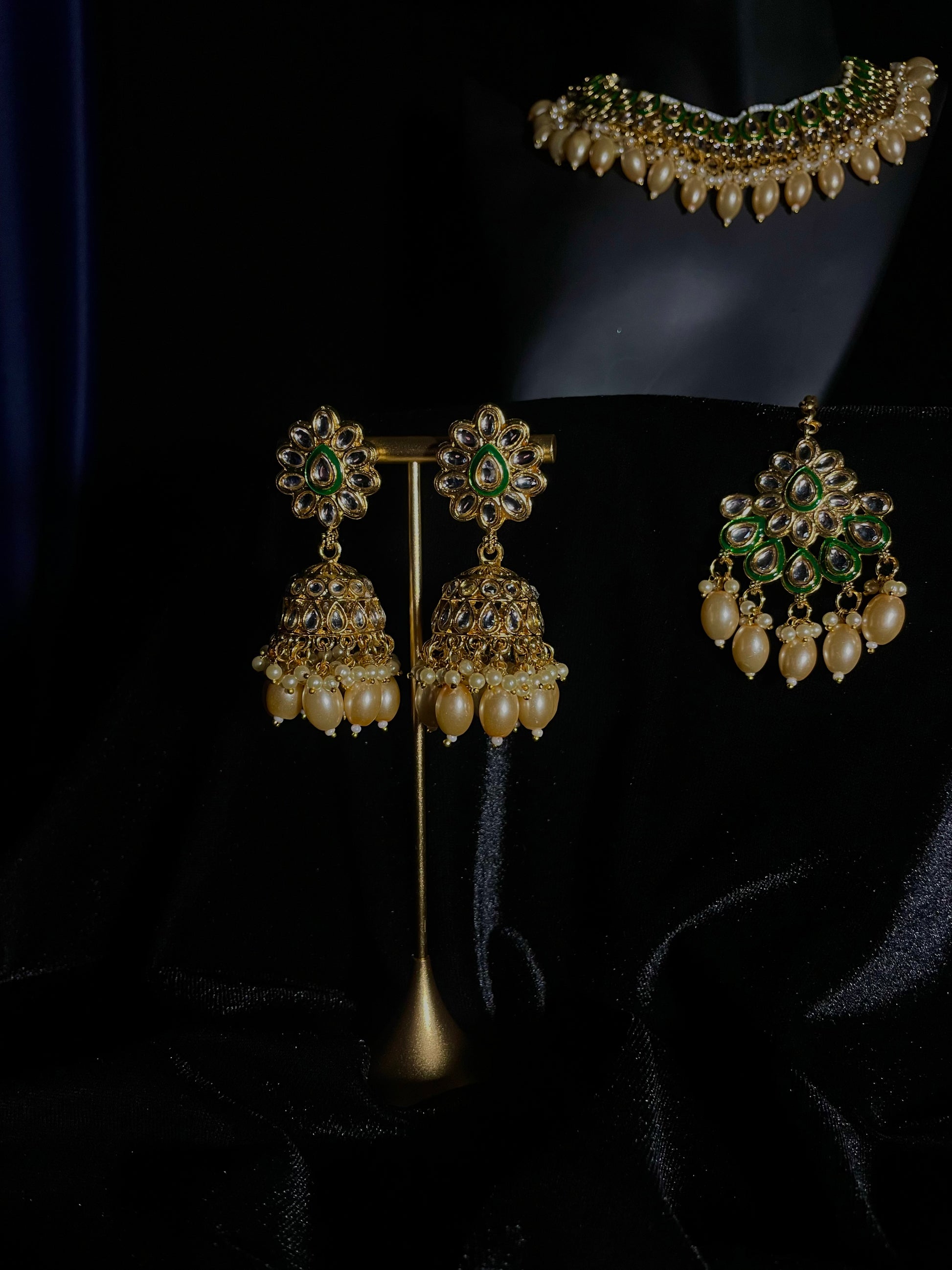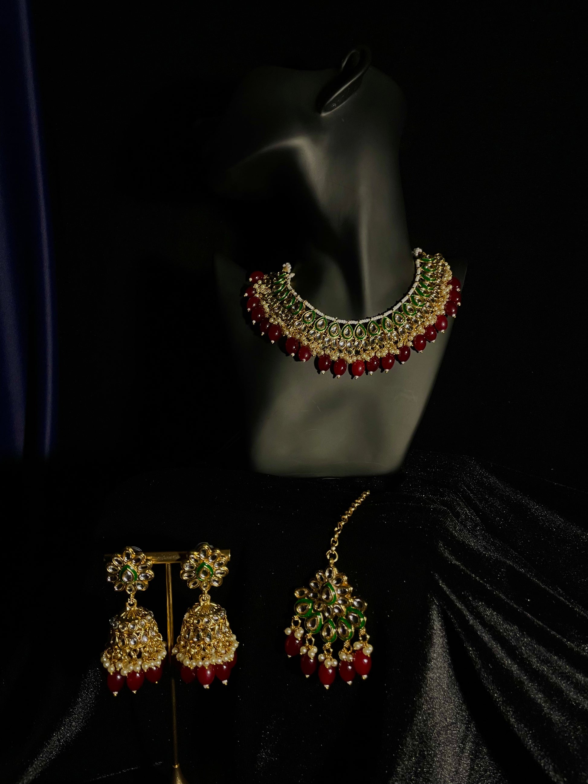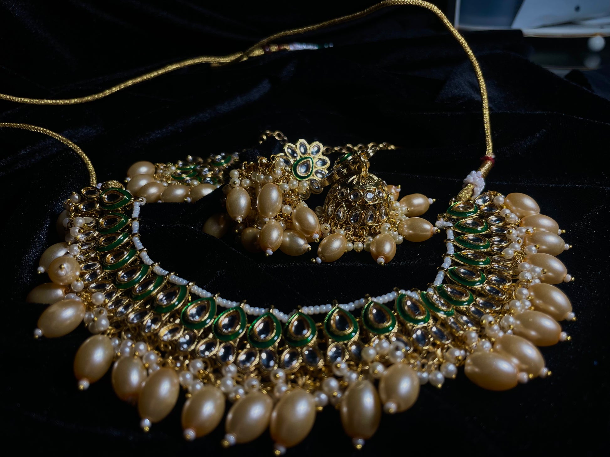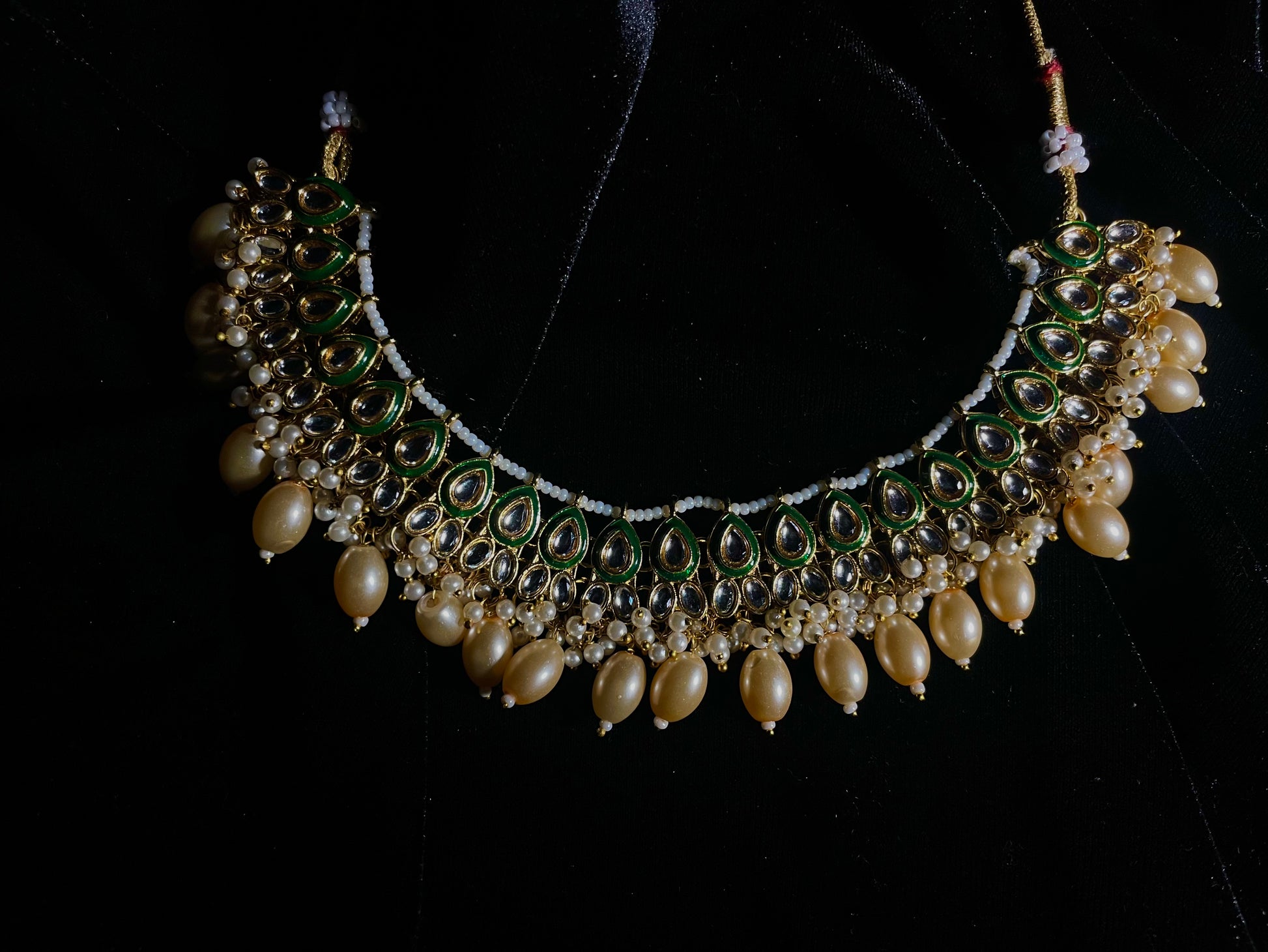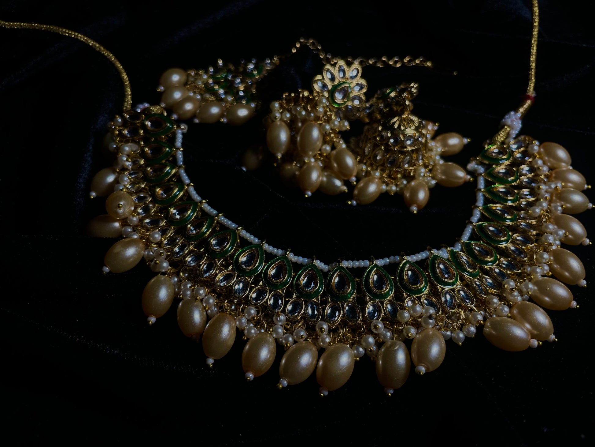 Elevate your elegance with Taj-e-Zevar, a breathtaking kundan style jewelry set that exudes royal charm. The mesmerizing glass inlays catch light beautifully while dangling beads create movement and drama. Available in two stunning colors, this exquisite set transforms any outfit into a statement of luxury and sophistication.