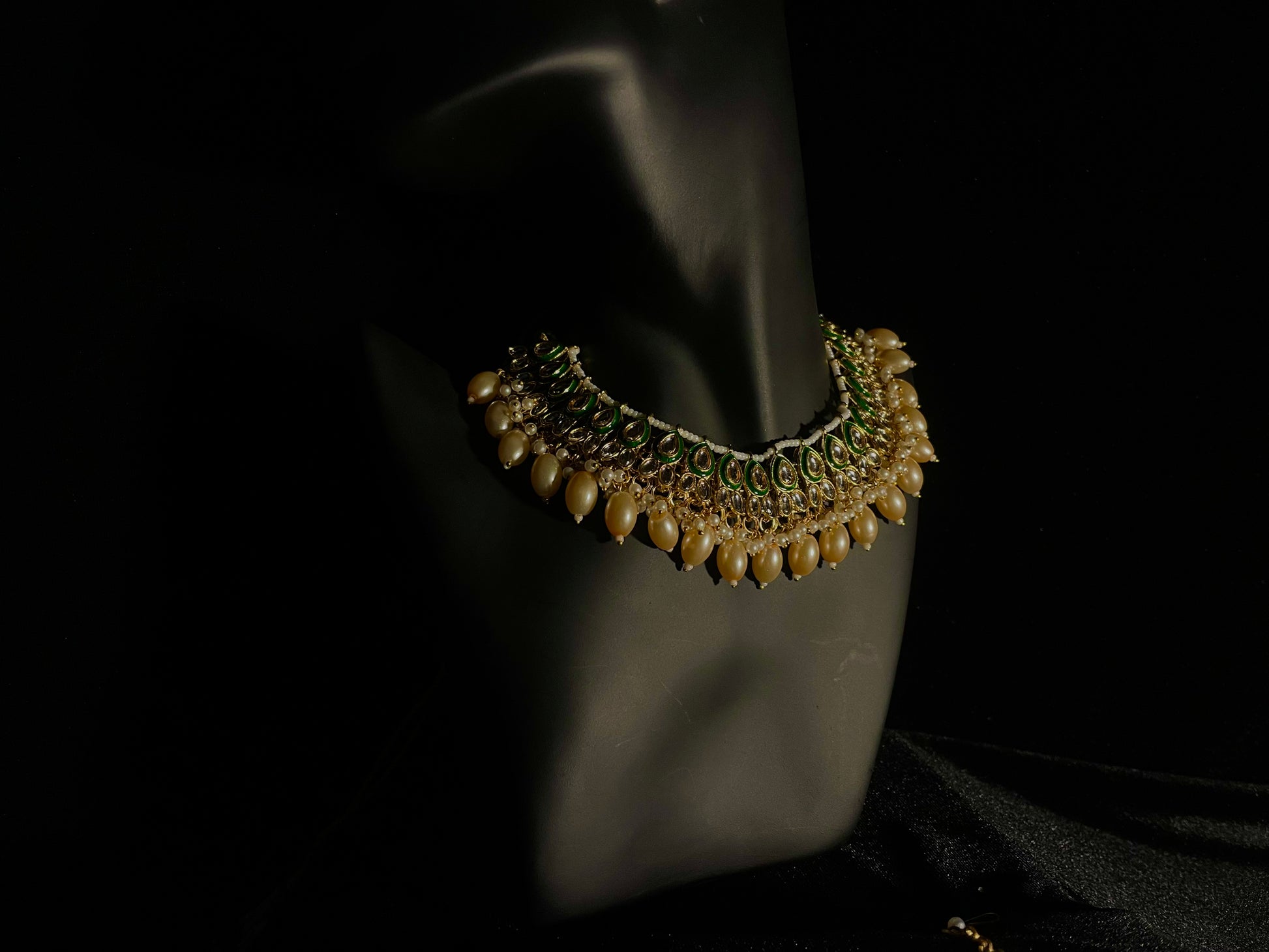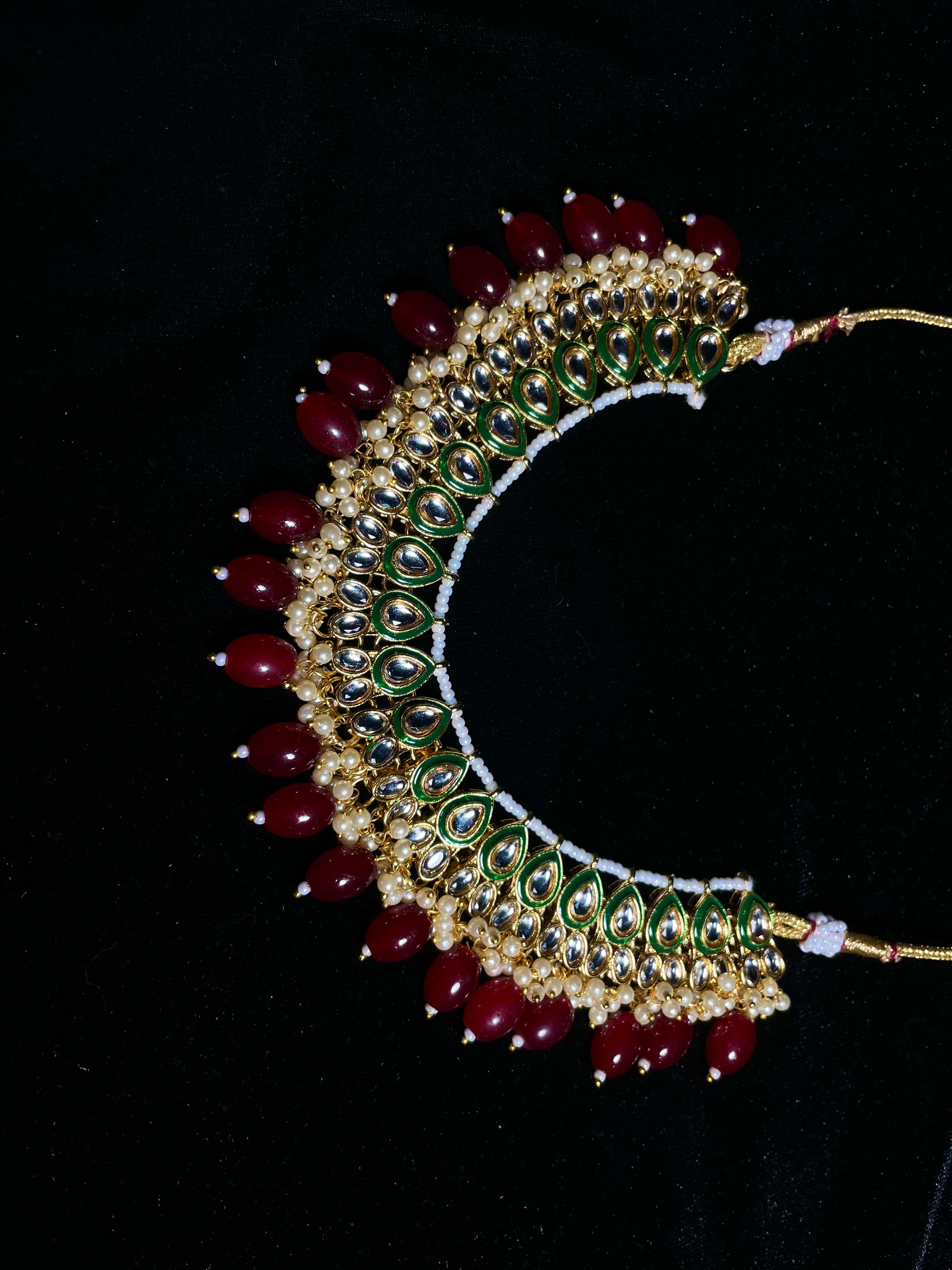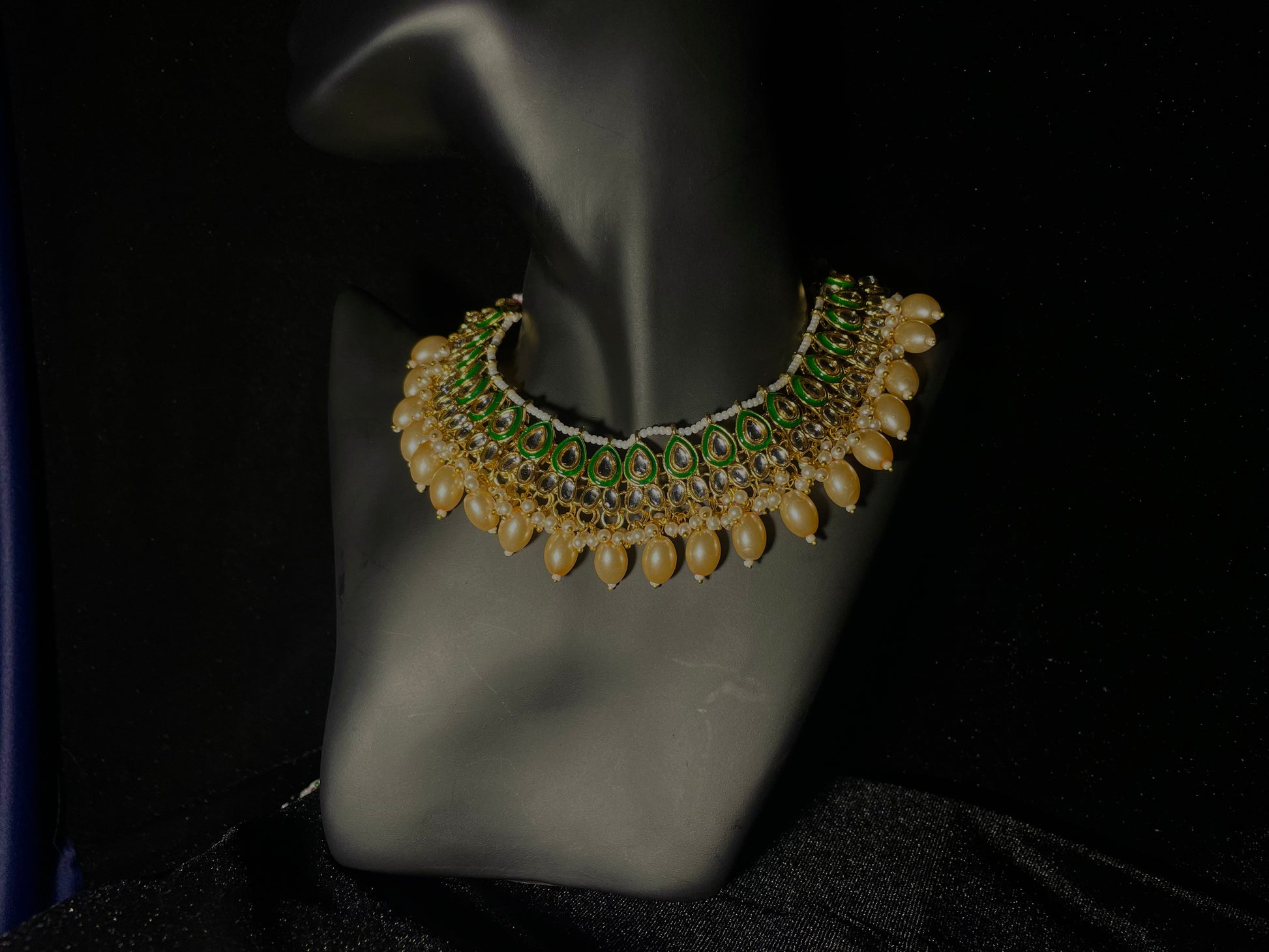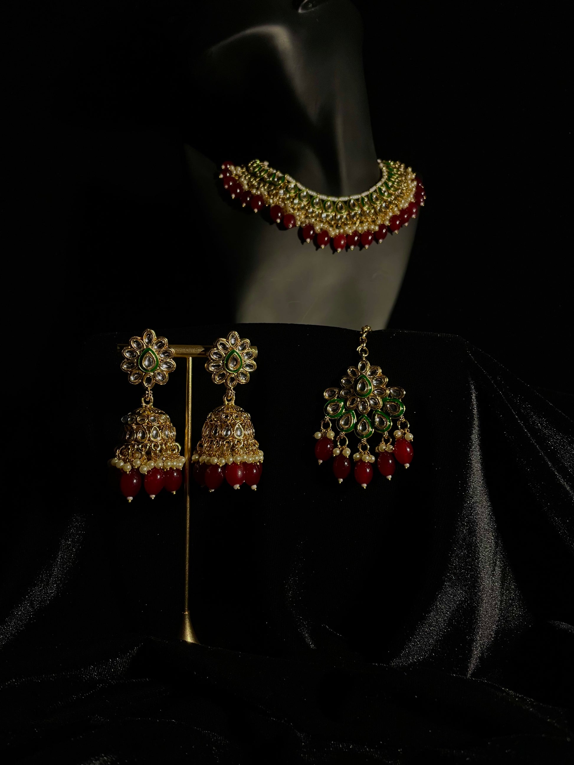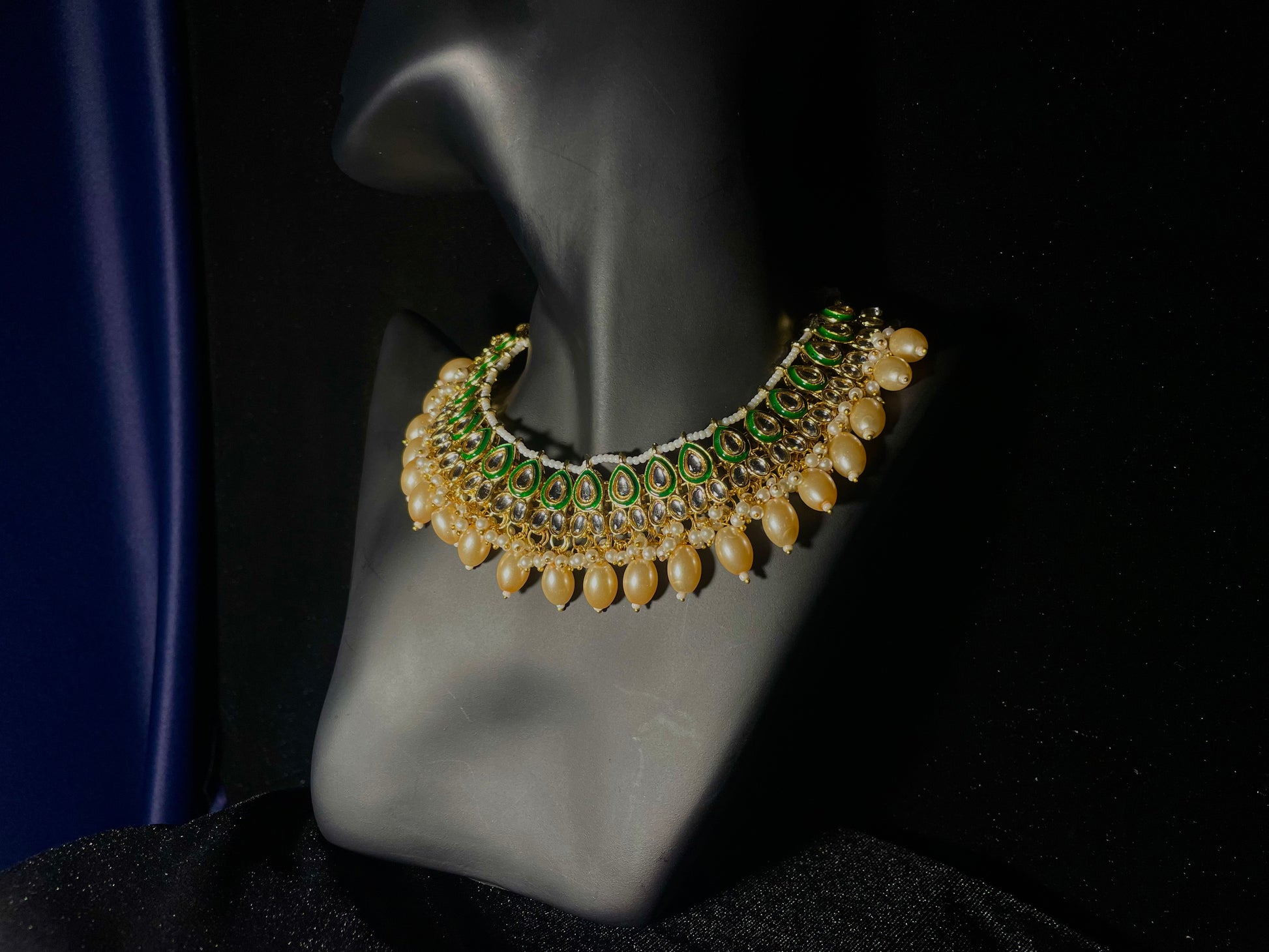 Elevate your elegance with Taj-e-Zevar, a breathtaking kundan style jewelry set that exudes royal charm. The mesmerizing glass inlays catch light beautifully while dangling beads create movement and drama. Available in two stunning colors, this exquisite set transforms any outfit into a statement of luxury and sophistication.