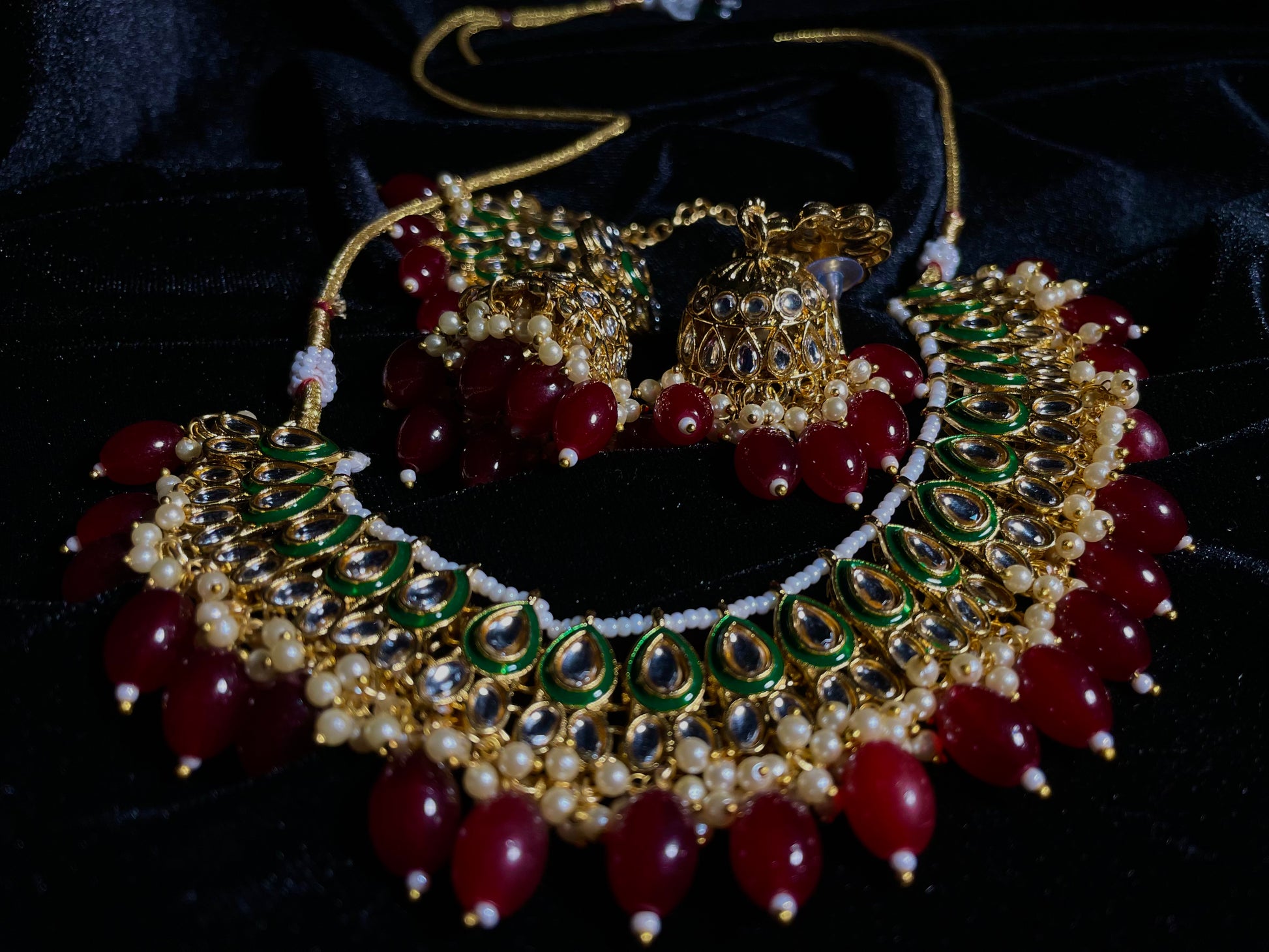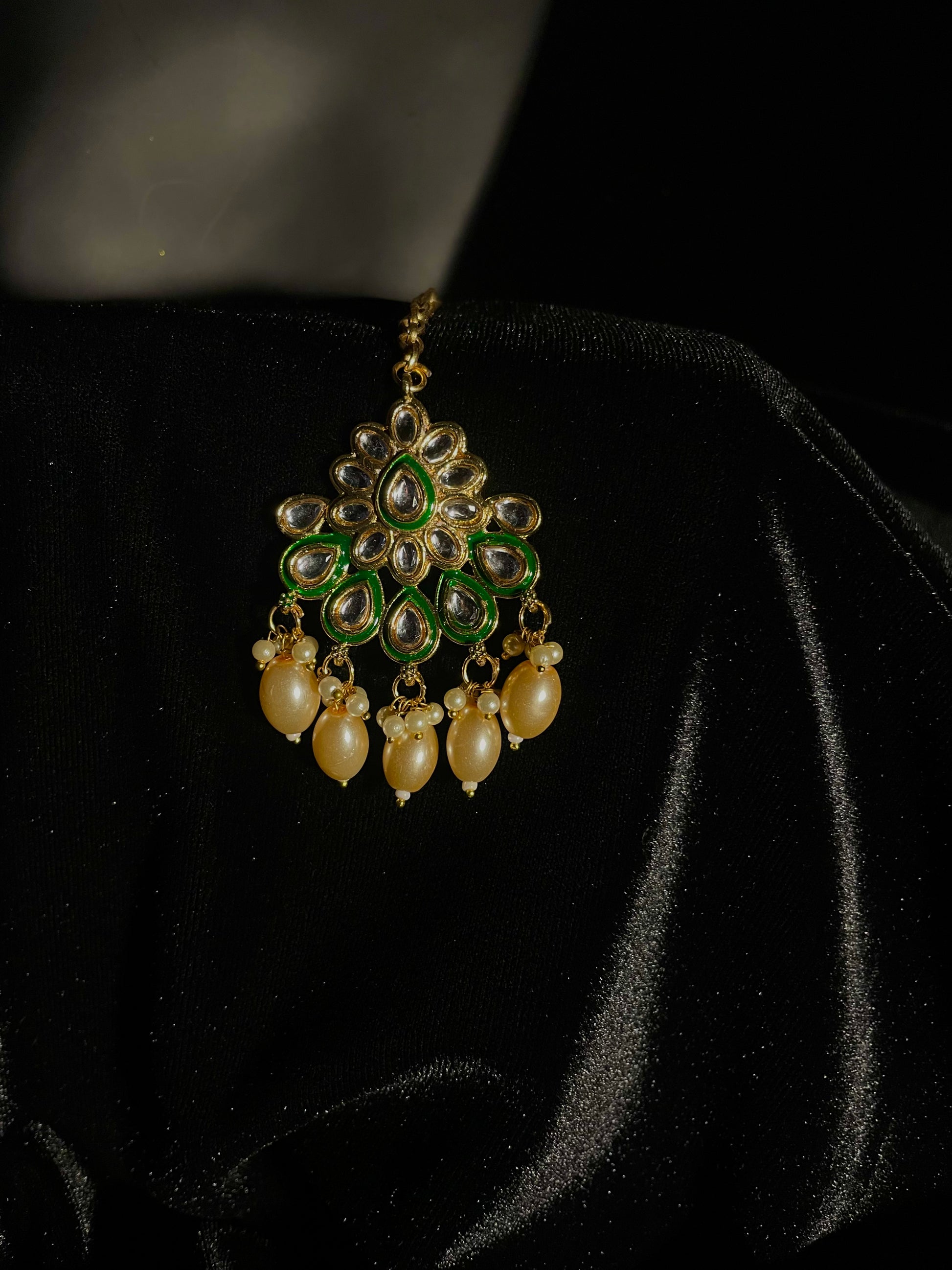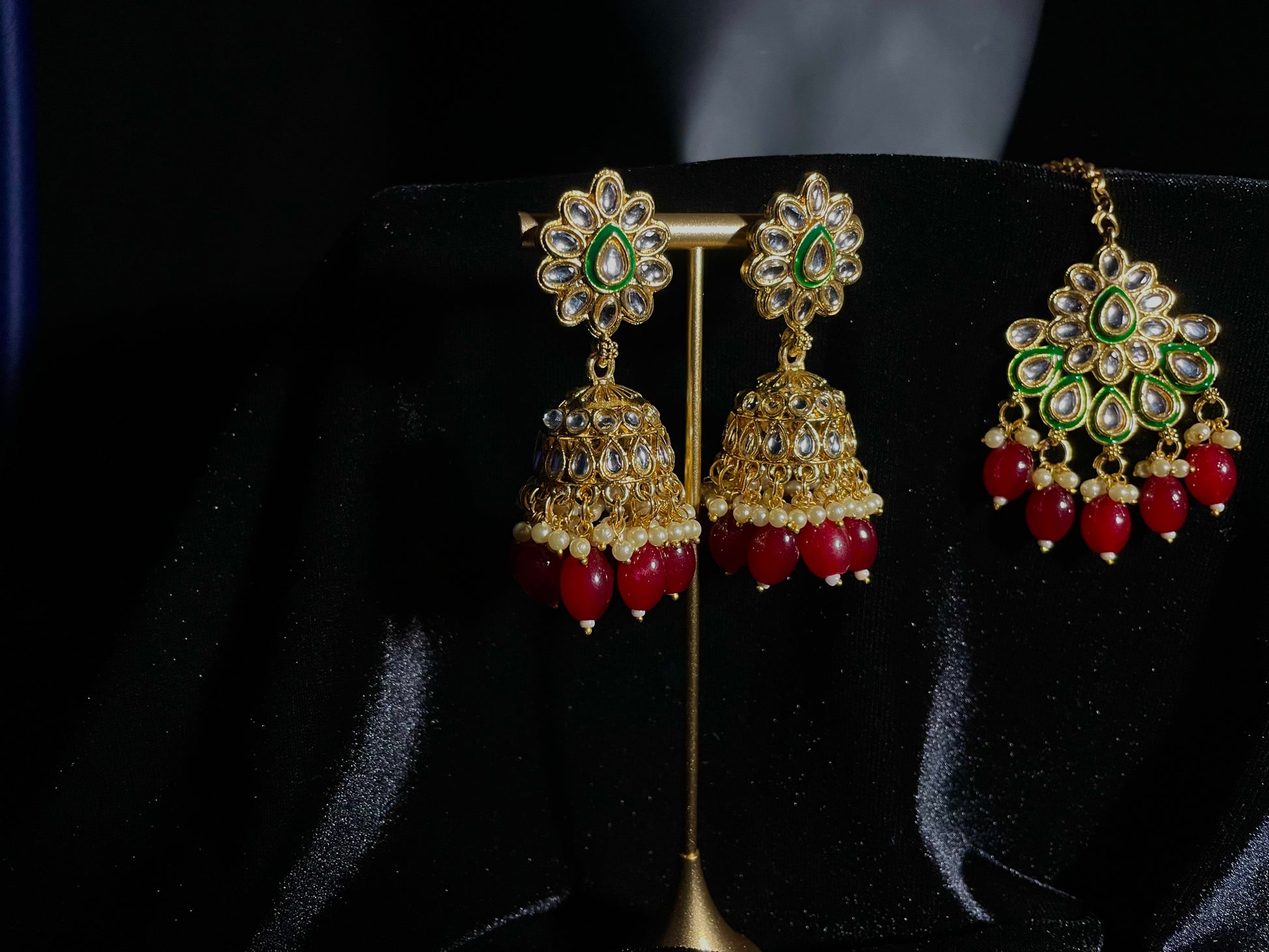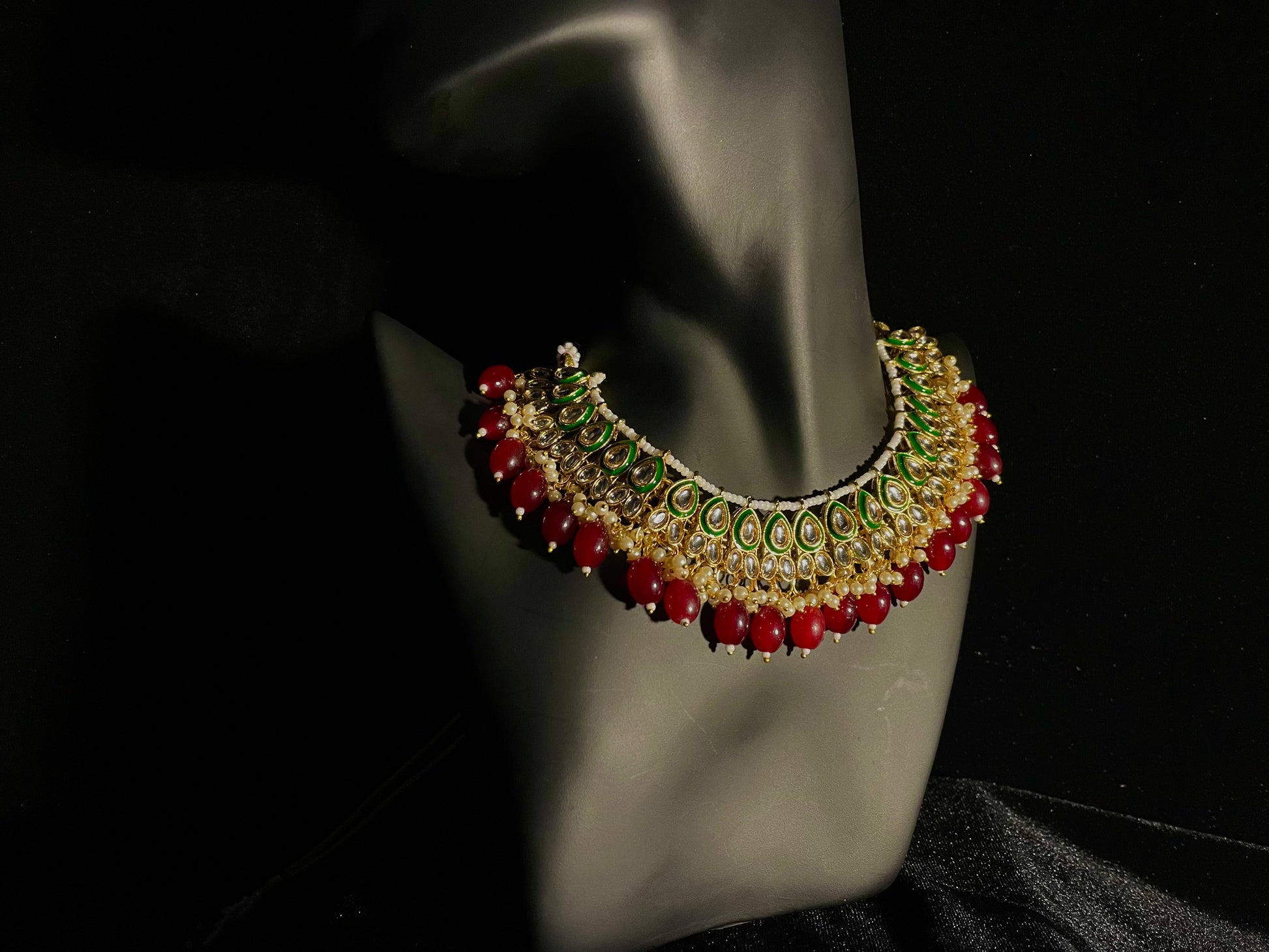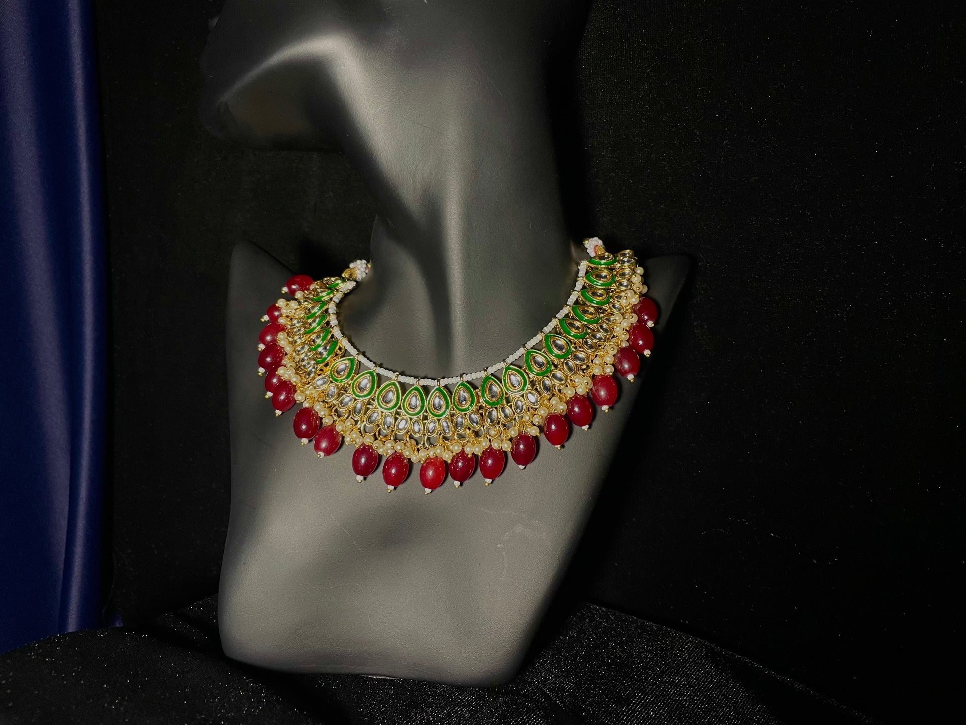 Elevate your elegance with Taj-e-Zevar, a breathtaking kundan style jewelry set that exudes royal charm. The mesmerizing glass inlays catch light beautifully while dangling beads create movement and drama. Available in two stunning colors, this exquisite set transforms any outfit into a statement of luxury and sophistication.