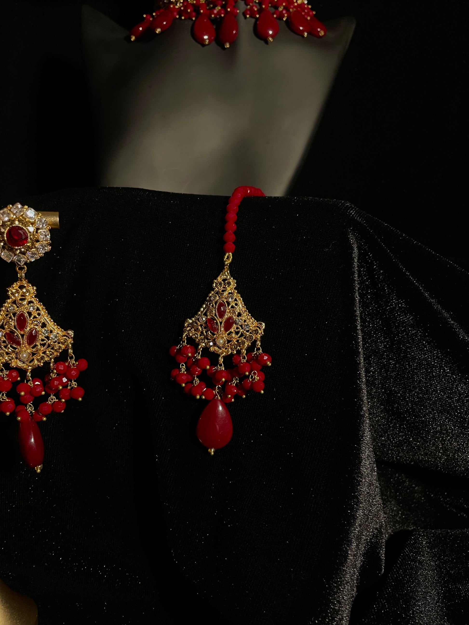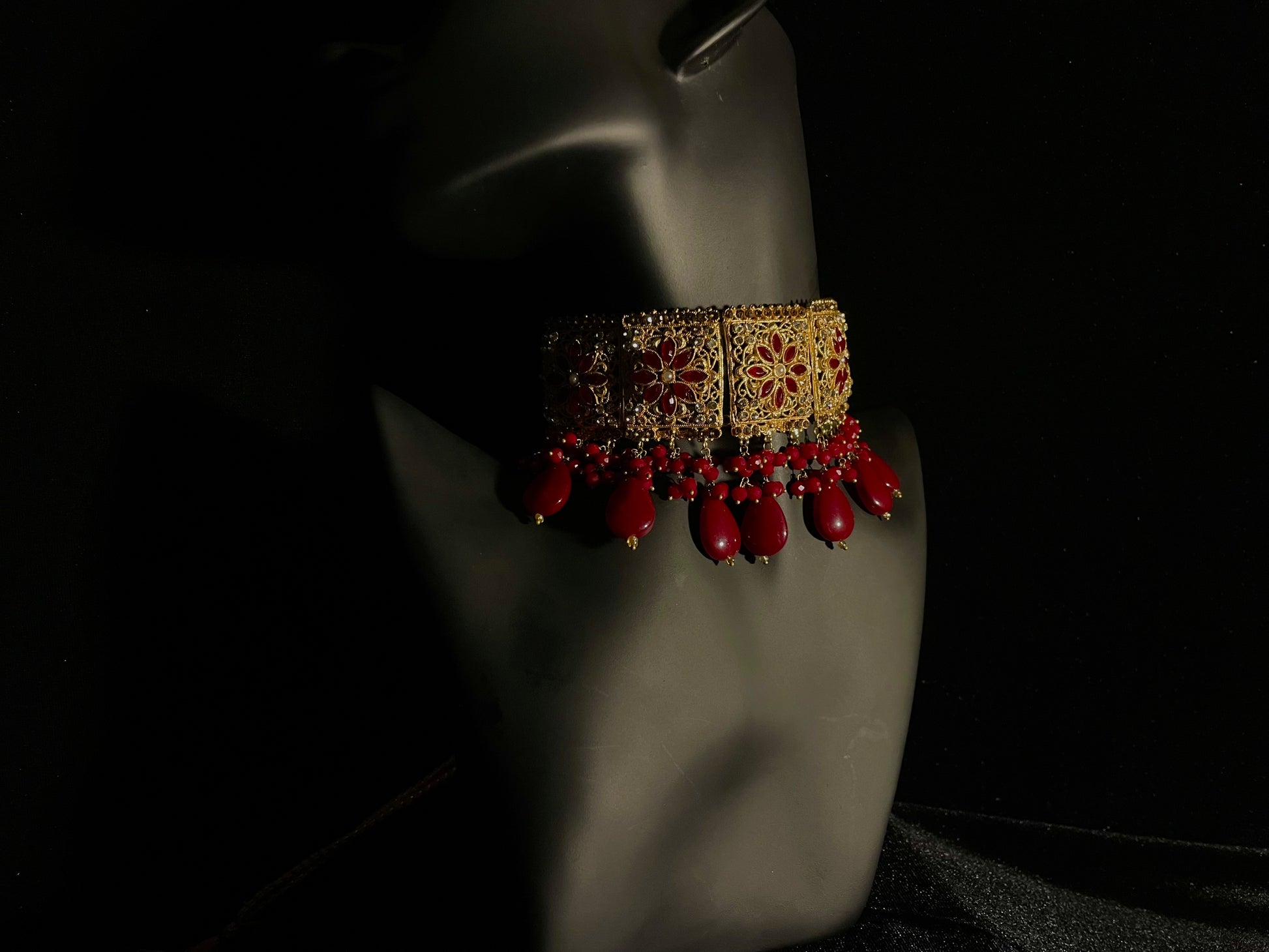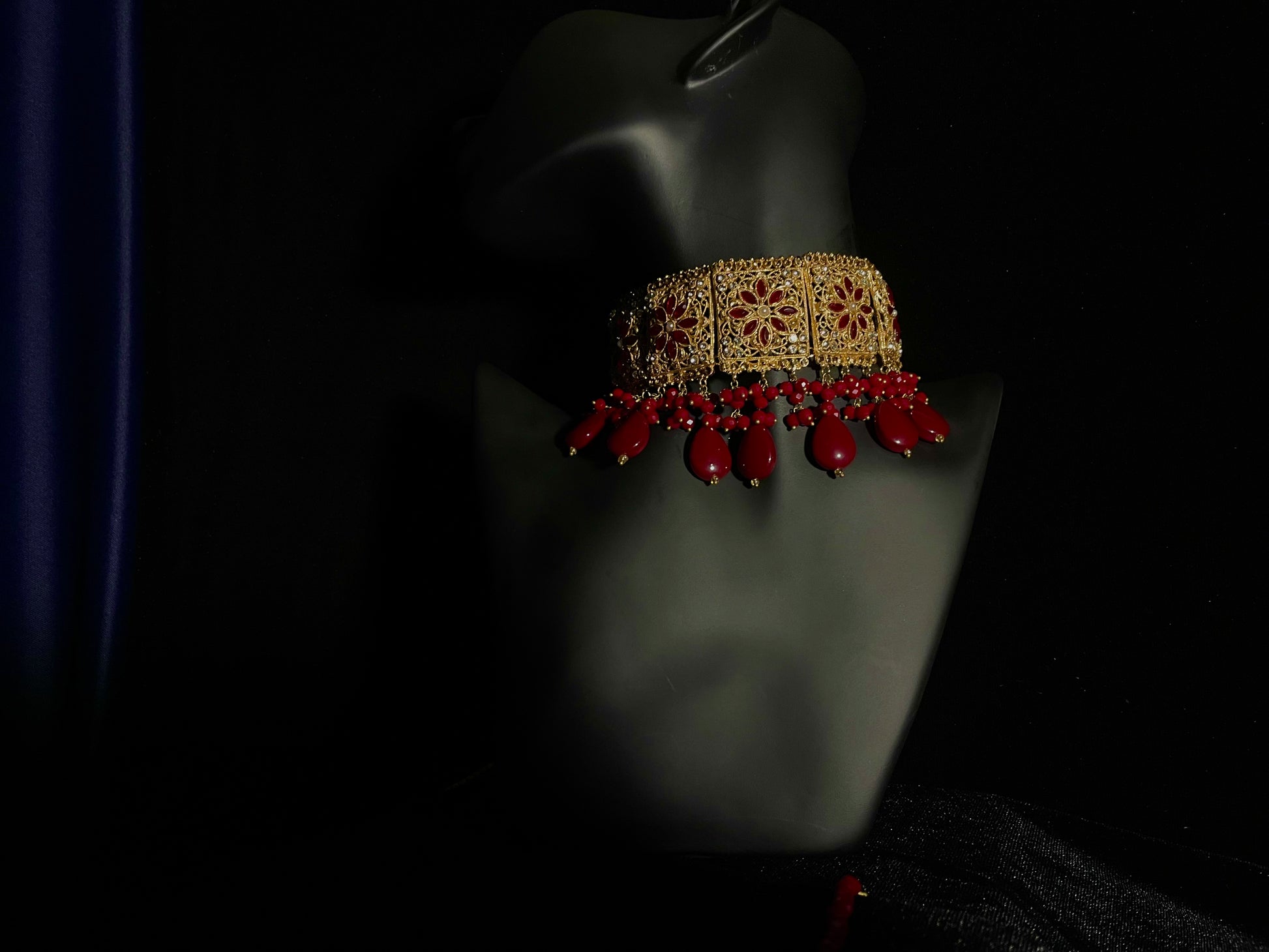 Discover the irresistible allure of our Zaar-e-anaar choker, where vibrant red meets luxurious gold in perfect harmony. This isn't just another accessory—it's a statement piece crafted with such delicate detailing that it simply can't be replicated. The unique design elements ensure you'll stand out in any crowd. Why settle for ordinary when you can own something truly exceptional?