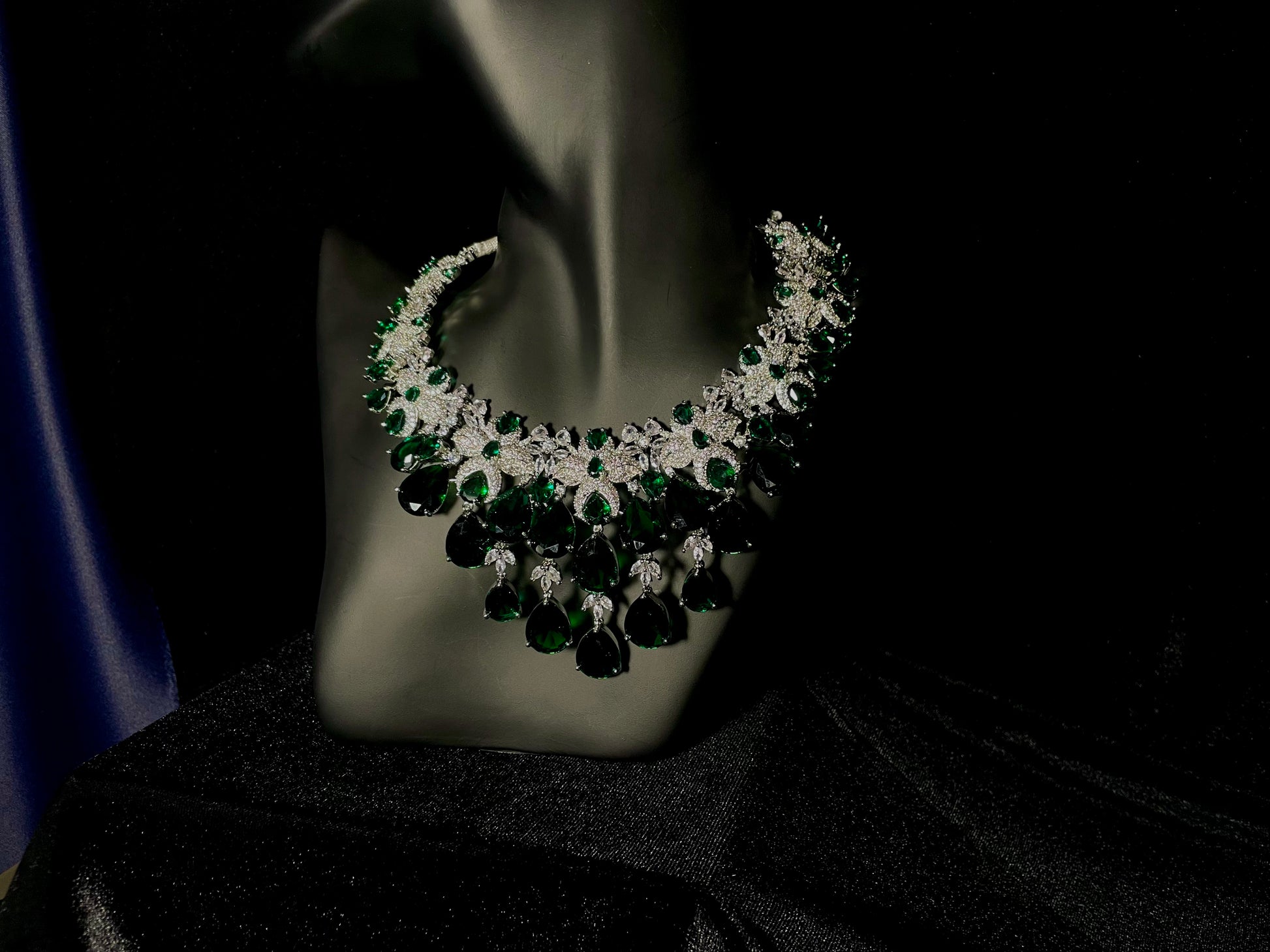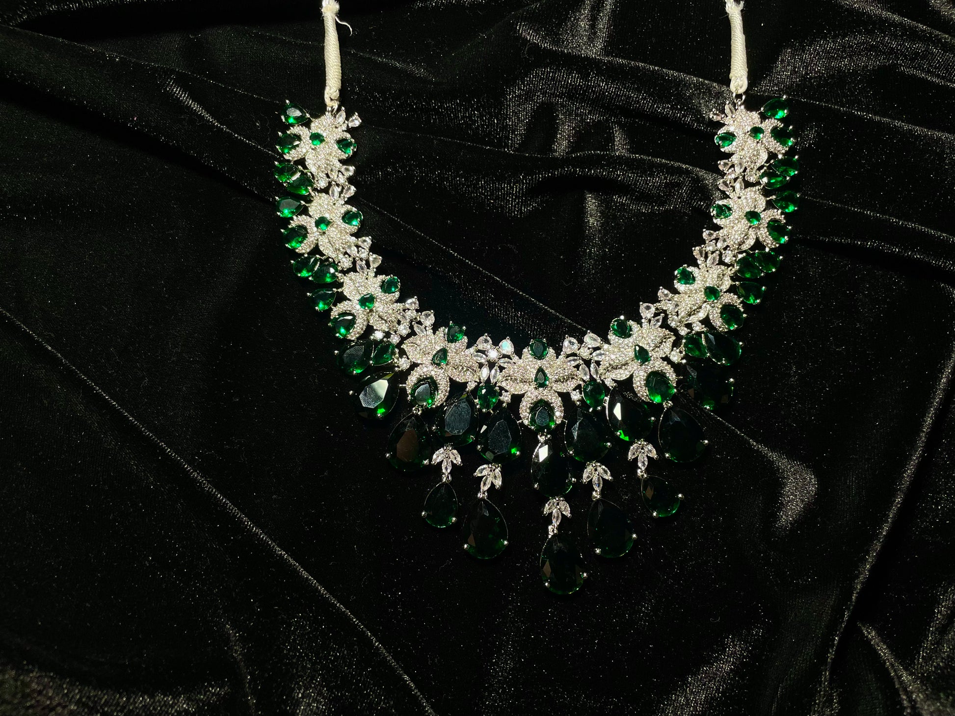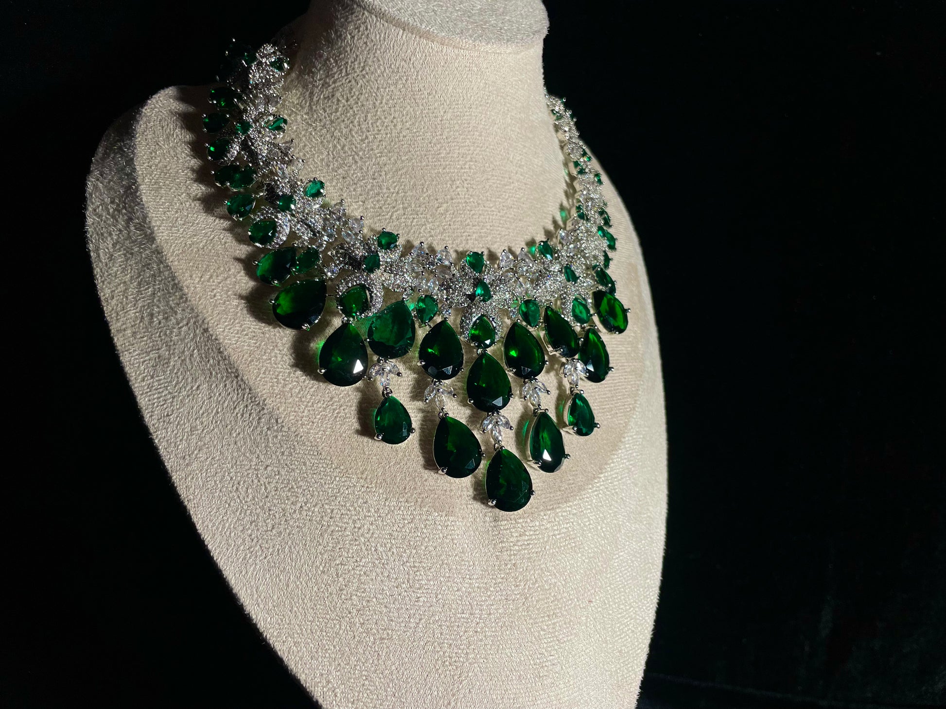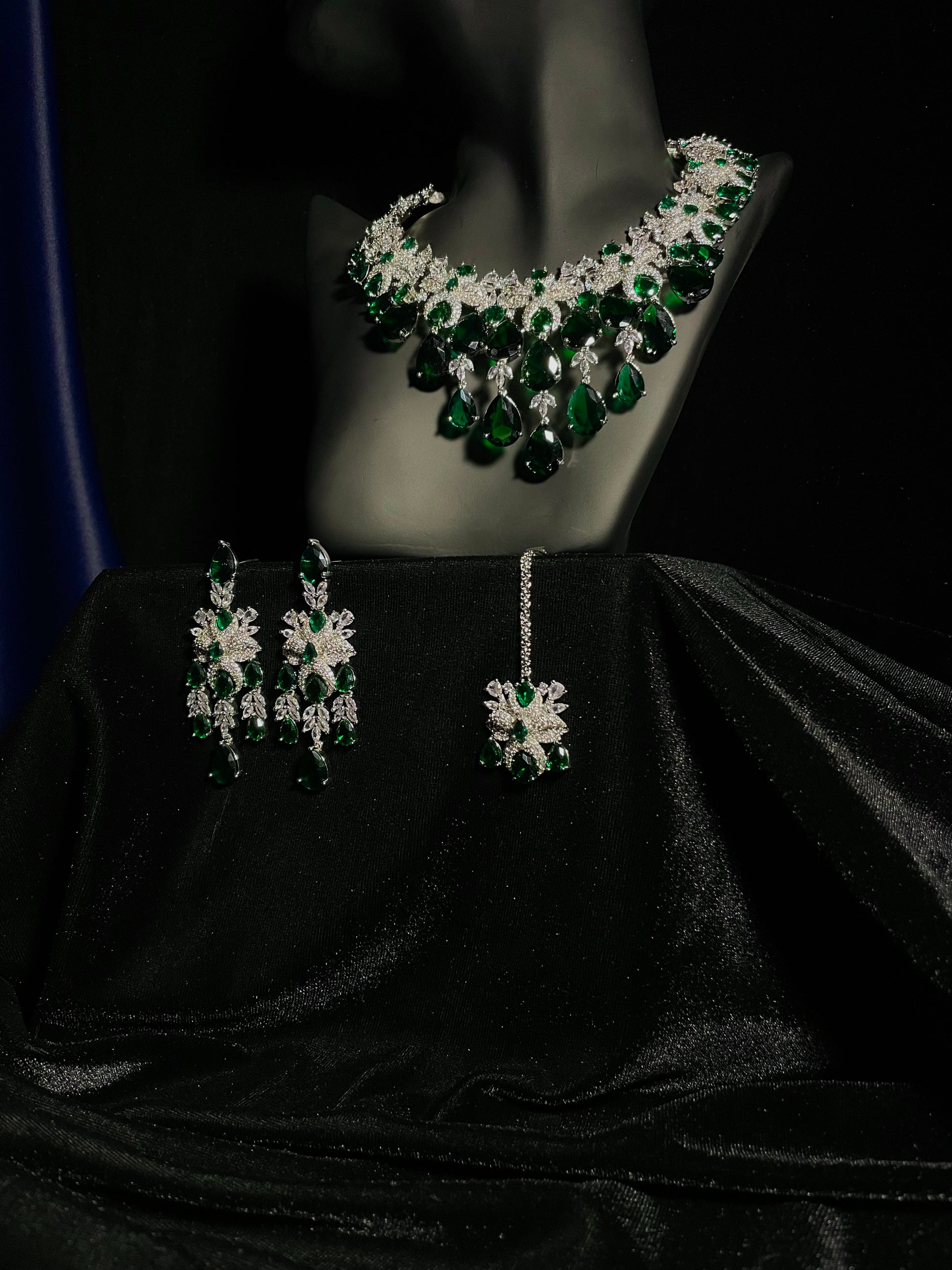 Indulge in the majestic allure of Zamurd-e-shahi, where emerald stones and zircon diamonds unite to create a truly regal experience. This exquisite set ordinary moments into royal occasions, capturing attention with its sophisticated elegance and timeless charm. Wear it and instantly command the respect and admiration.