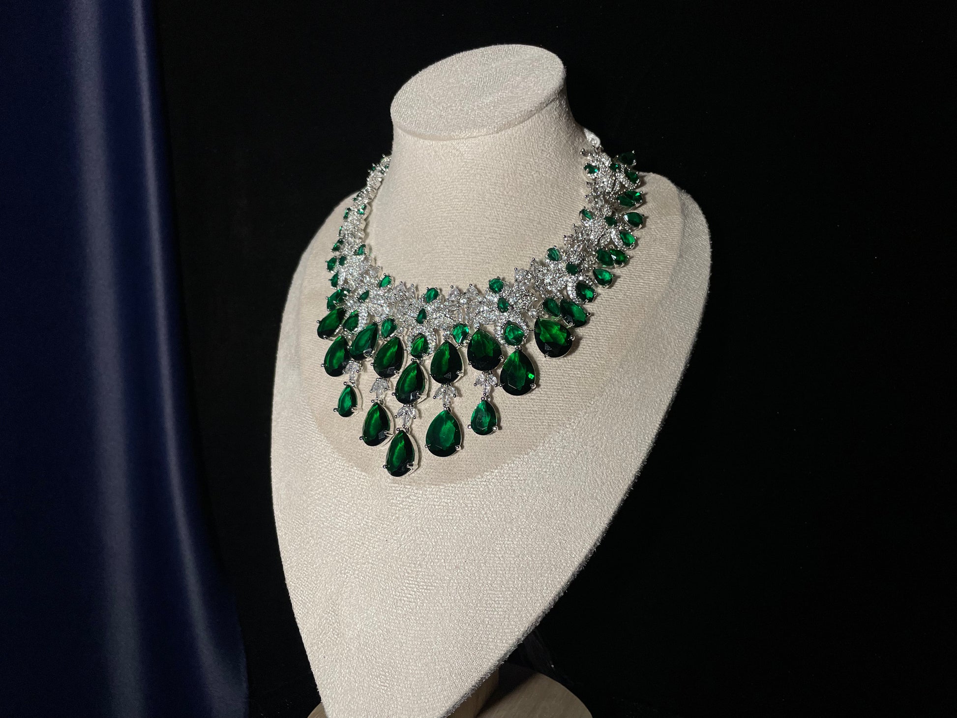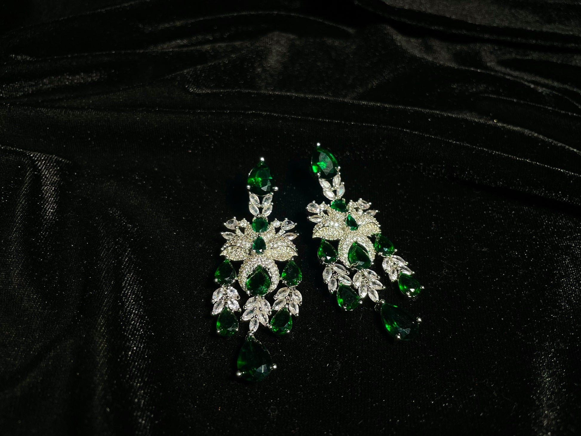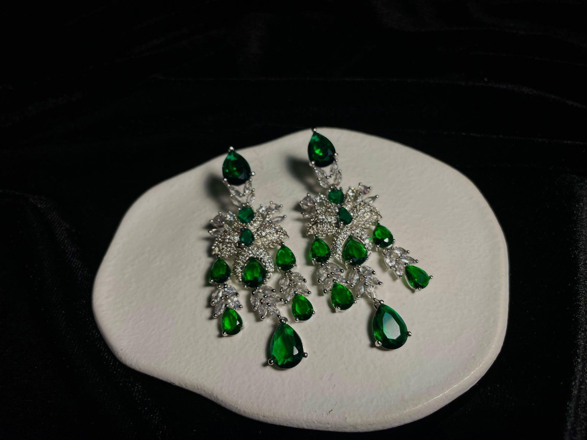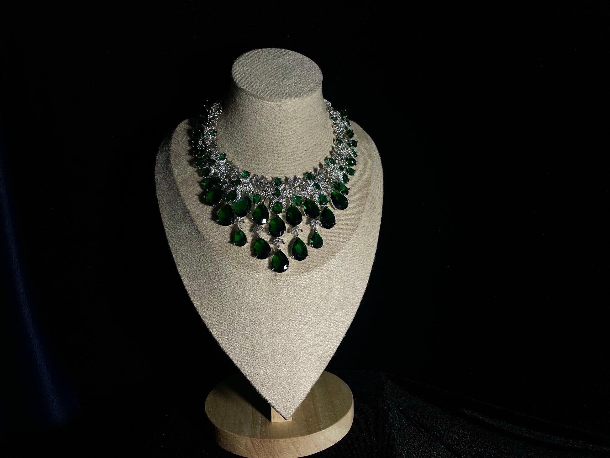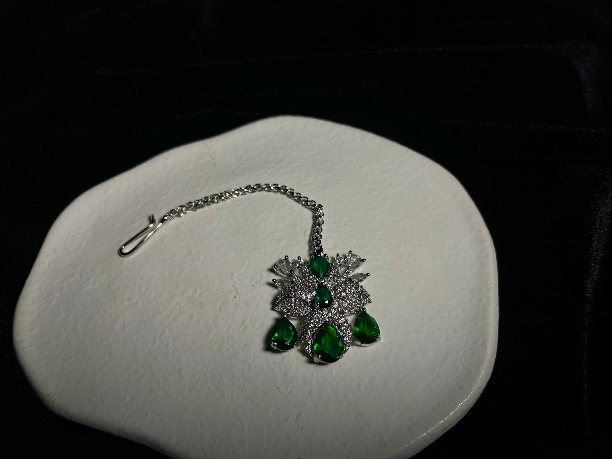Indulge in the majestic allure of Zamurd-e-shahi, where emerald stones and zircon diamonds unite to create a truly regal experience. This exquisite set ordinary moments into royal occasions, capturing attention with its sophisticated elegance and timeless charm. Wear it and instantly command the respect and admiration.