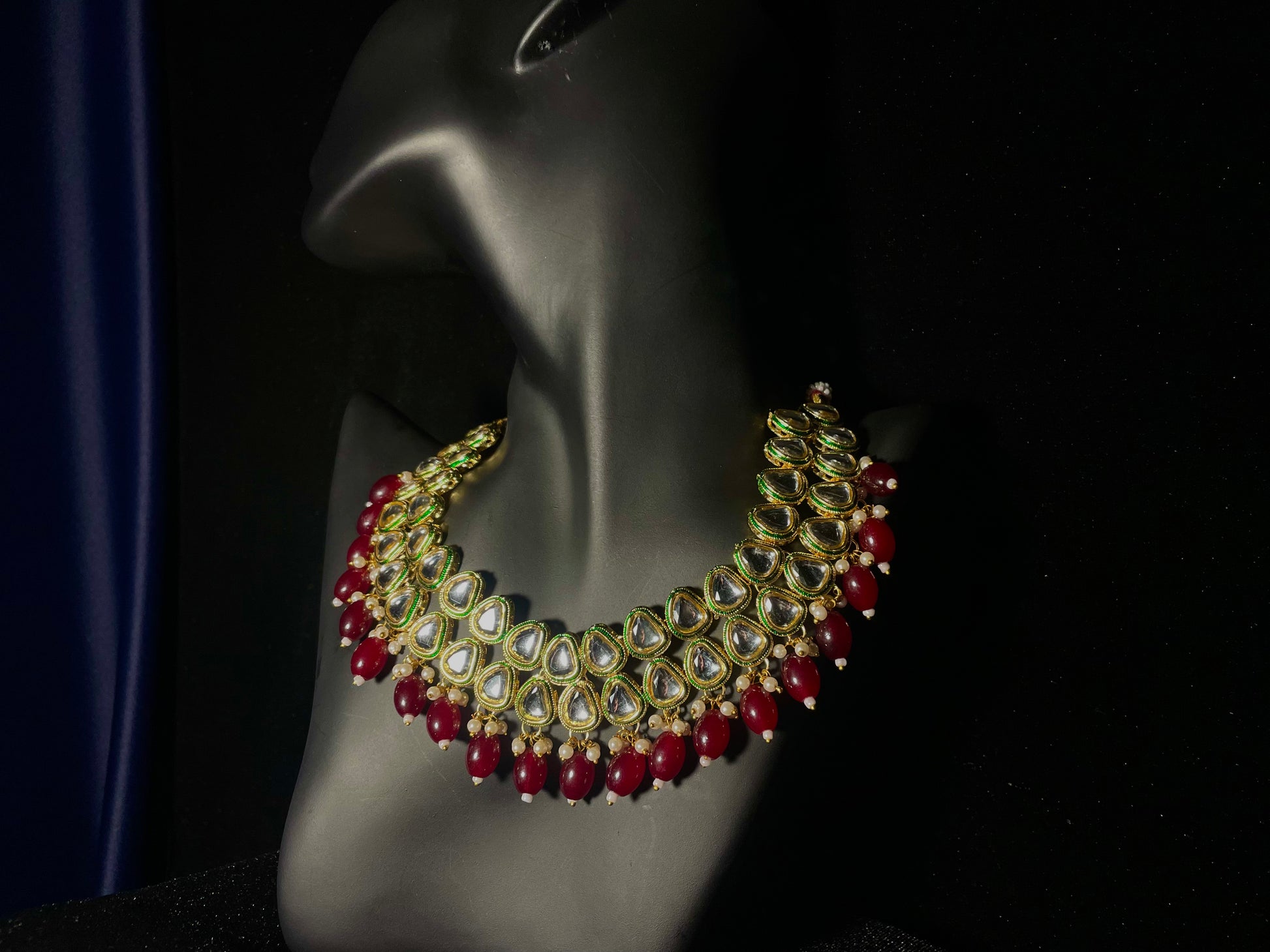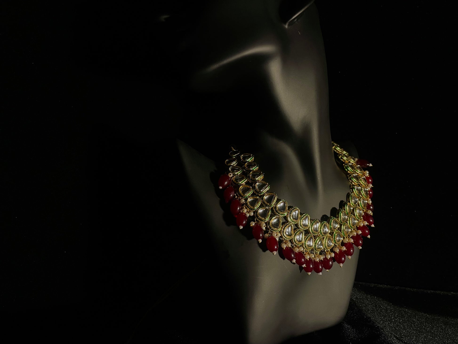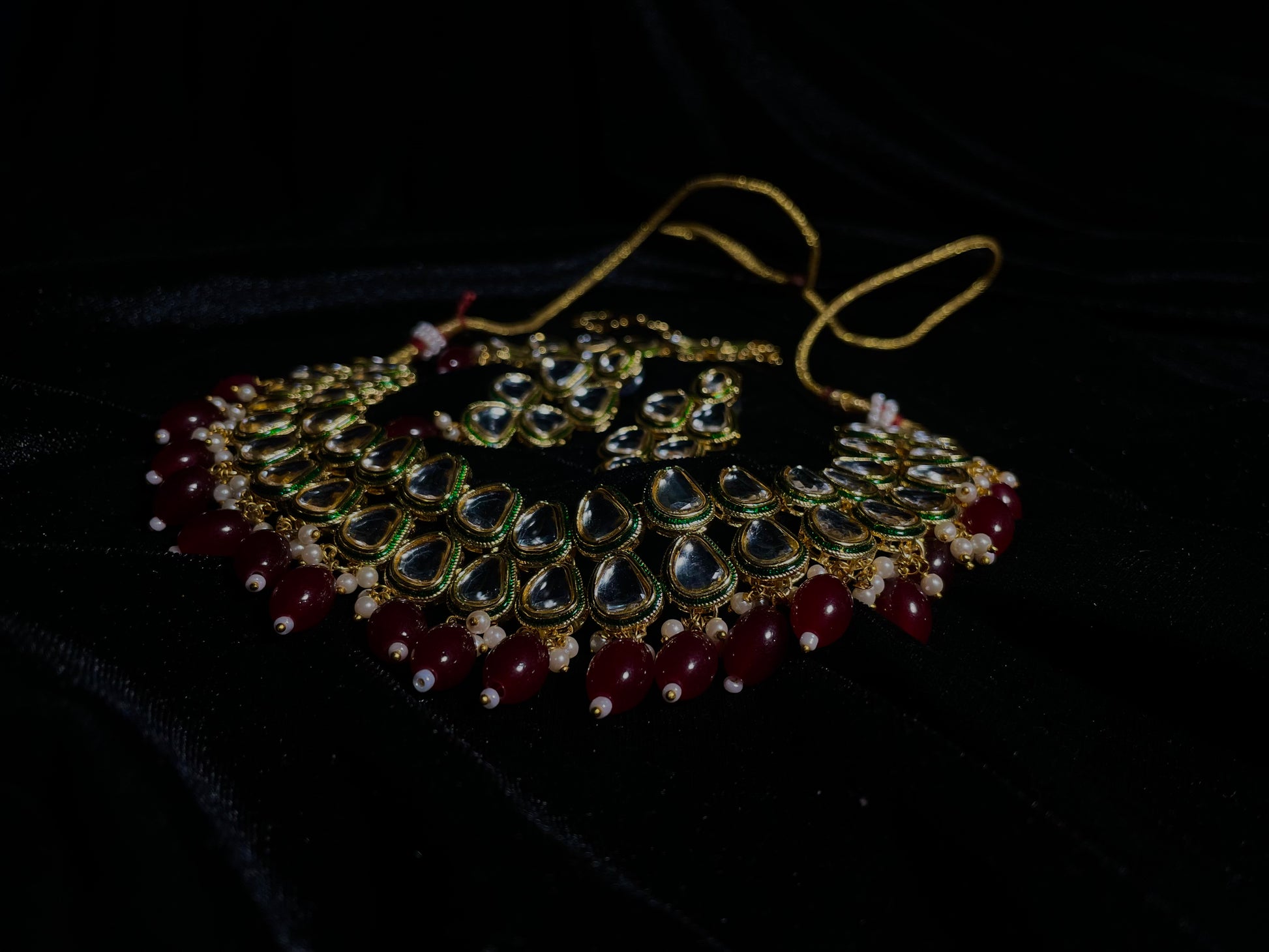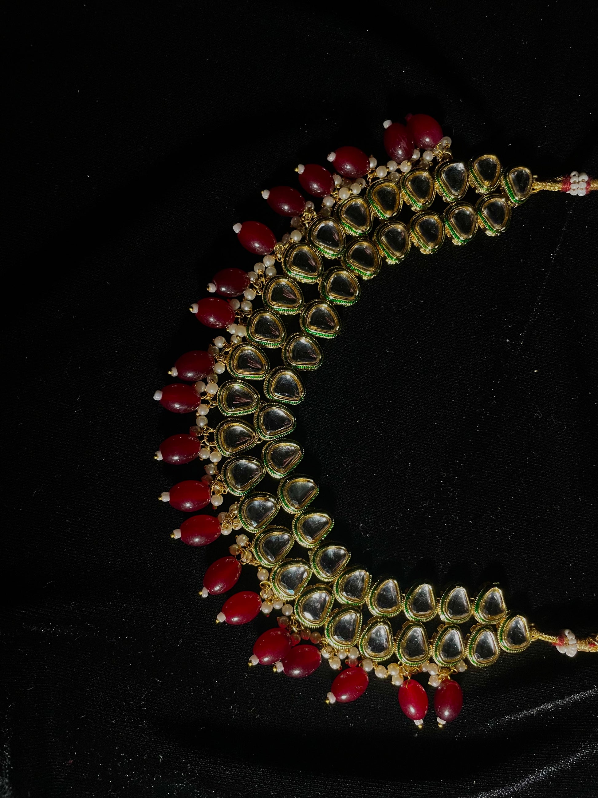 Elevate your style with our stunning Zewar-e-shahi ll set, featuring vibrant red beads that command attention. This simplified yet sophisticated version of our classic design showcases elegant glass inlays that catch the light with every movement. The perfect statement piece to transform any outfit from ordinary to extraordinary – a true reflection of royal heritage with contemporary appeal.